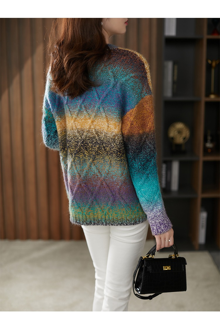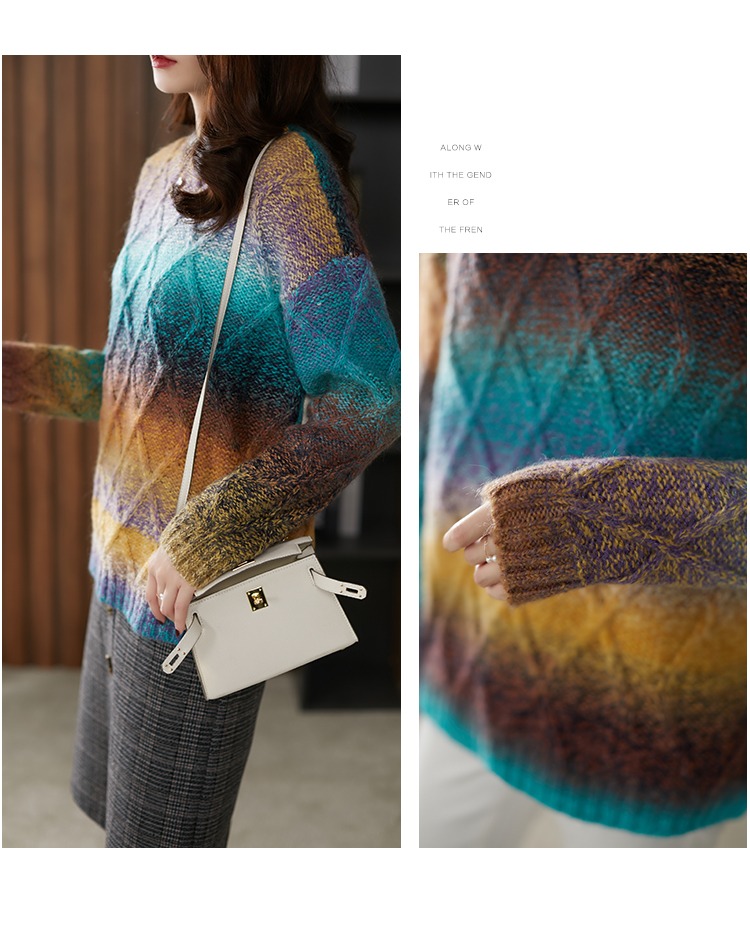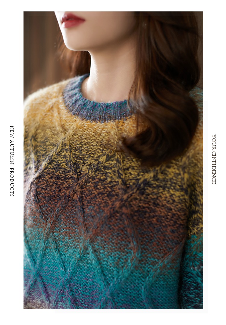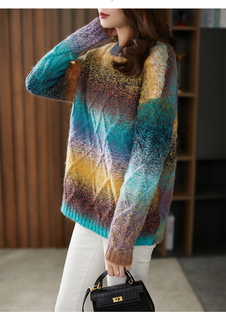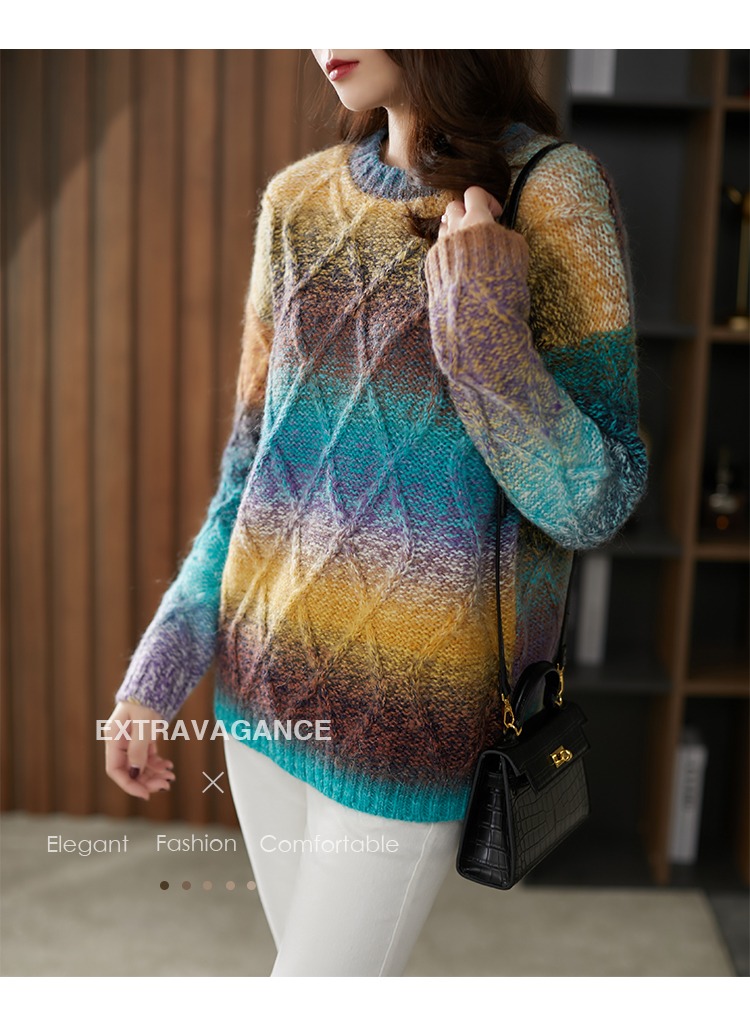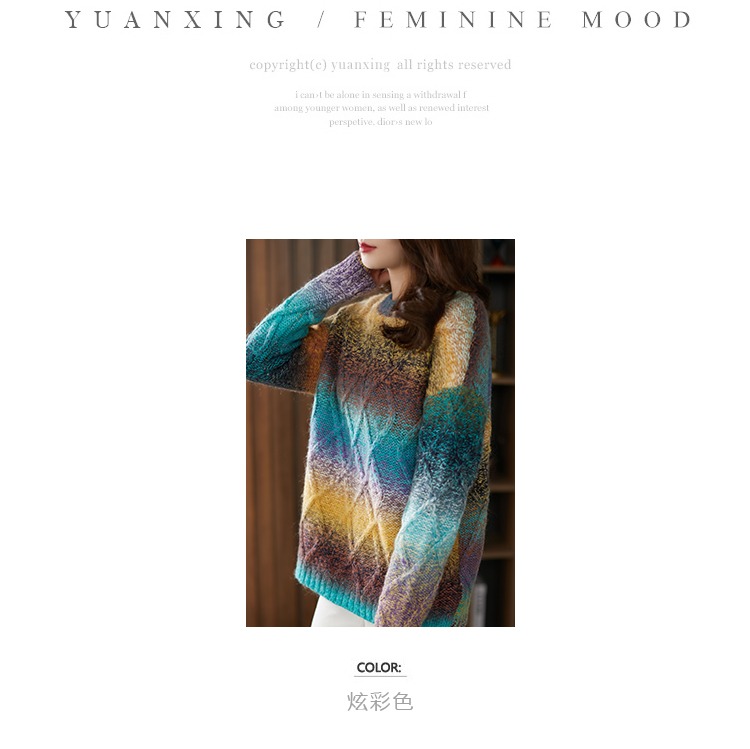 【现货7天】彩虹毛衣女2023春季新款套头圆领渐变条纹针织衫宽松慵懒外穿