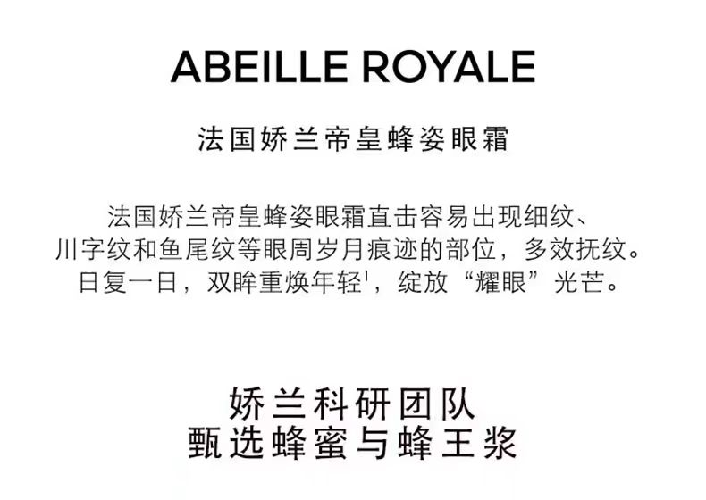 皇蜂姿丰盈修复眼霜可针对性地作用于眼部皱纹,日复一日抚平从表层细纹到眉间纹和鱼尾纹的各种皱纹,令眼部肌肤重焕新生。修复技术结合蜂蜜和娇兰独有的蜂王浆与透明质酸,拥有久经考验的卓越功效,可令肌肤更加水润饱满。黑眼圈和浮肿淡退,眼部肌肤更加神采奕奕。此款眼霜含有94%的天然萃取成分*。专有包装设计旨在减少对环境的影响。拥有环保设计的瓶身:玻璃重量减轻了30%**。