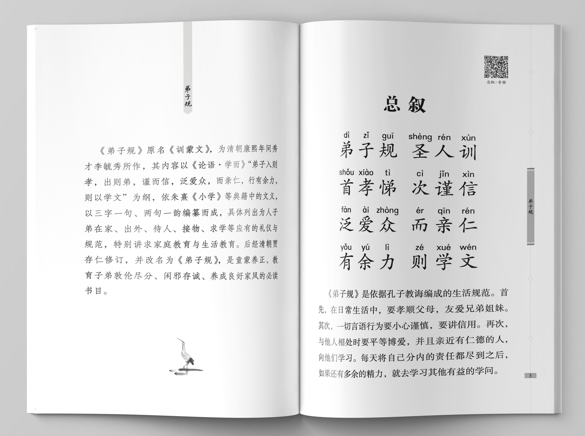 本书是《弟子规》和《孝经》的合辑。经典原文为大字注音排版,加以简要译解,并辅以音频。