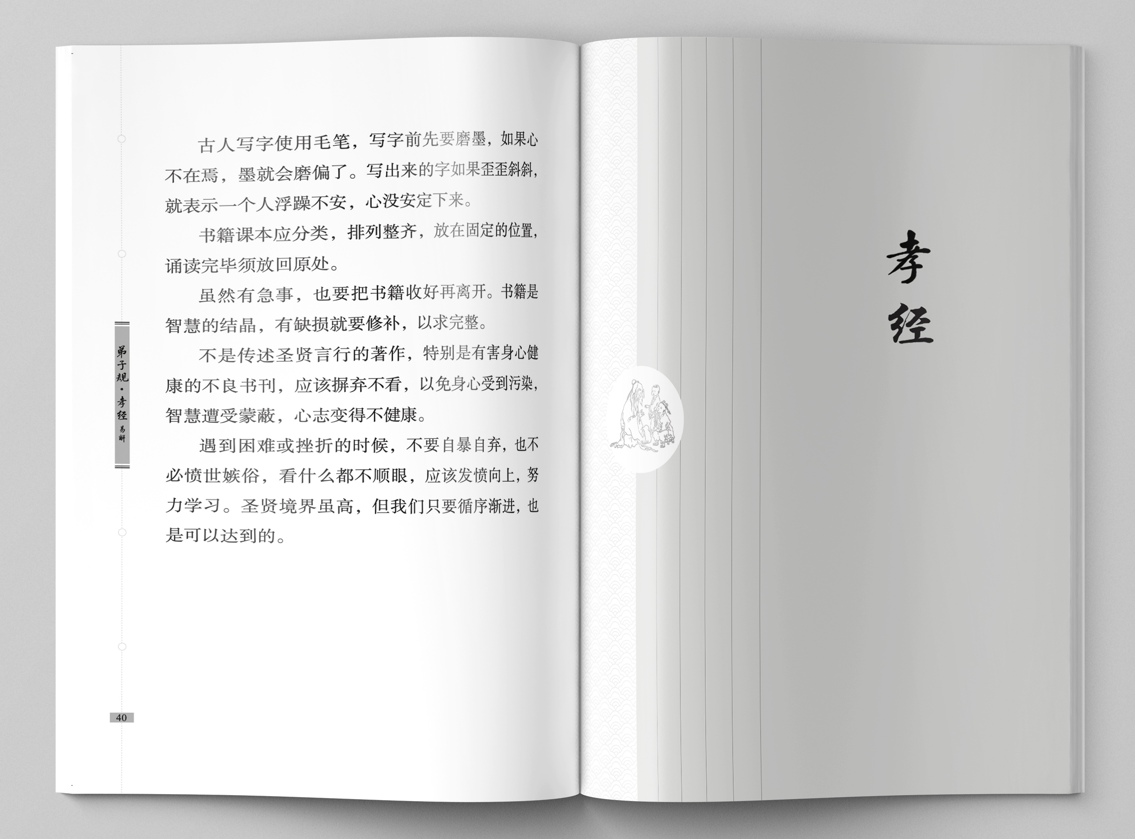 《孝经》书名据《汉书·艺文志》记载:“《孝经》者,孔子为曾子陈孝道也。夫孝,天之经,地之义,民之行也。举大者言,故曰《孝经》。”可见,《孝经》综述道德、仁孝,是孔子示范后世的行门,是千经万论的根本,是成圣成贤的始基,是人生修行的入手之处。