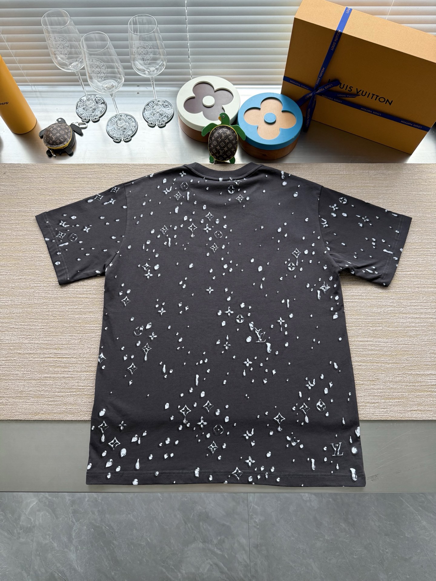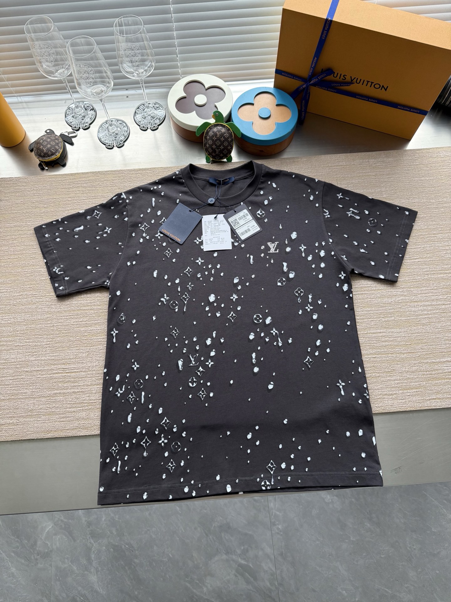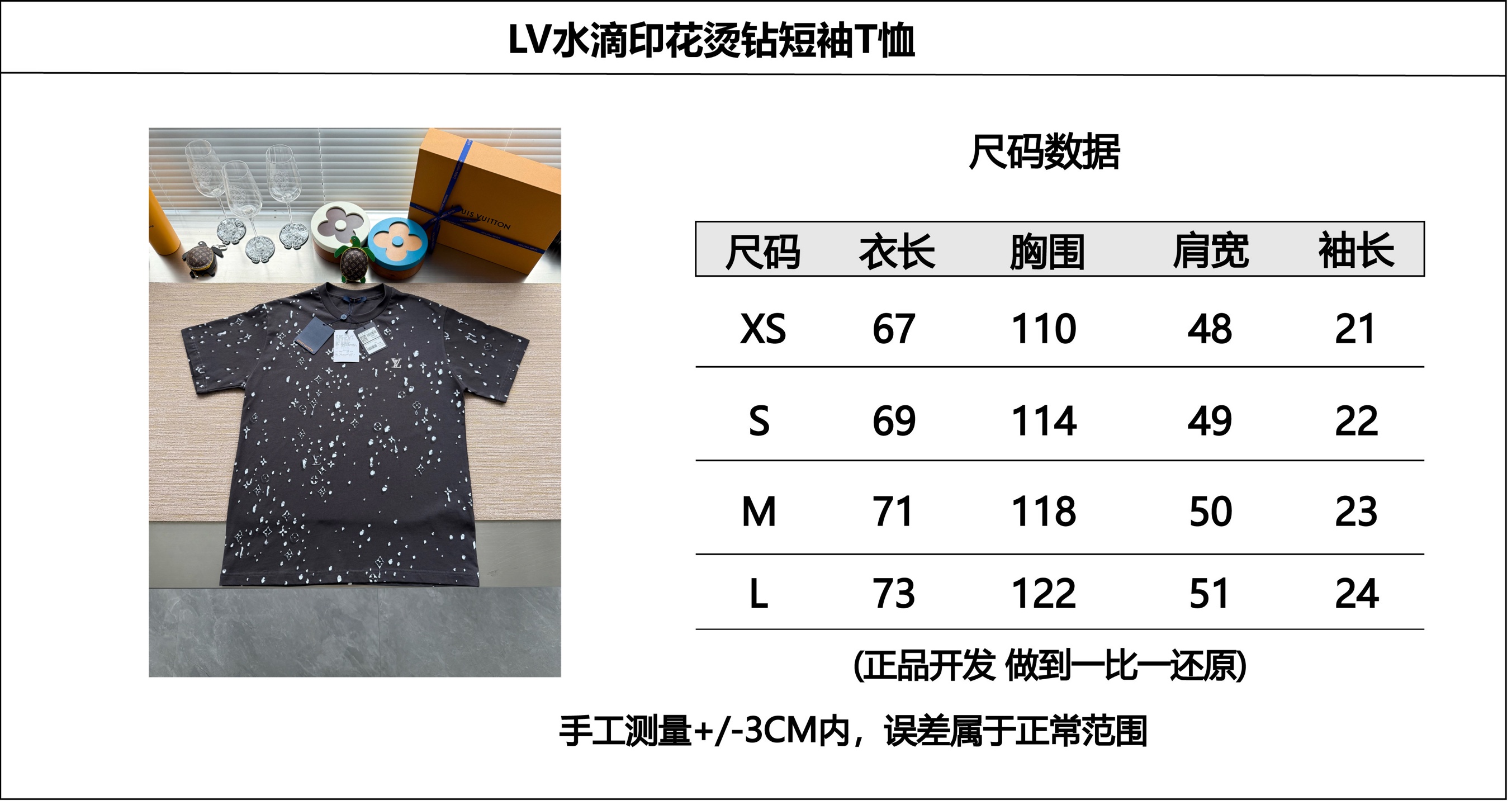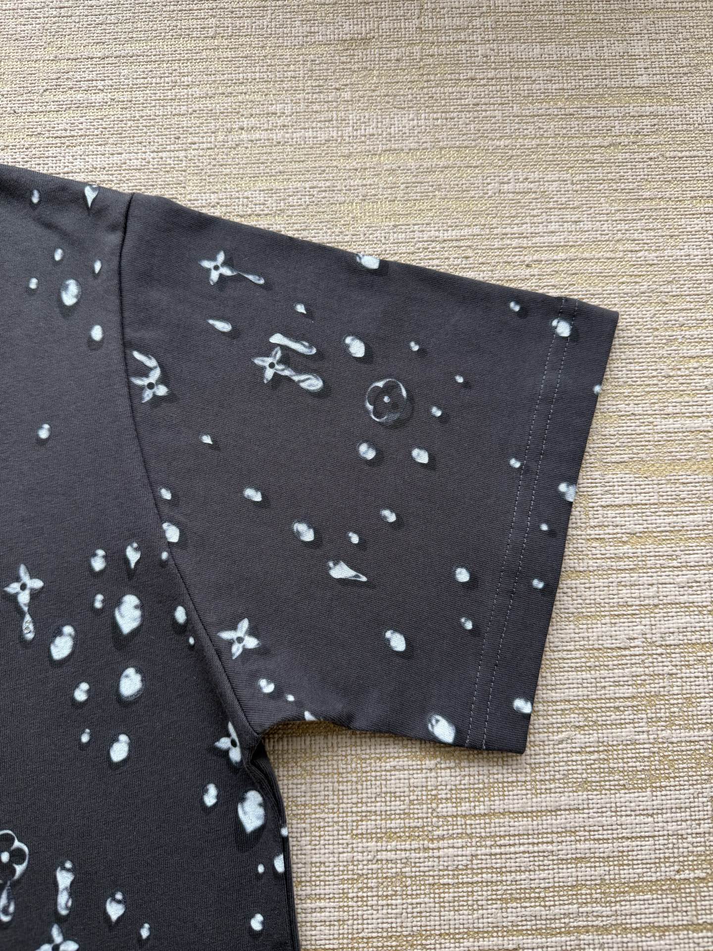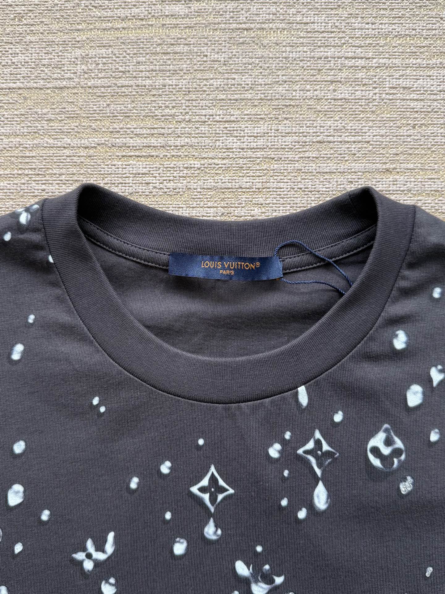 Louis Vuitton25ss水滴印花烫钻短袖T恤‼️整件衣服10400购买ZP拆解打造,采用定制灰色纯棉面料,做到100%全棉进口纱线,意大利制造,全幅饰以水滴印花,胸前饰以LV烫钻字母logo,定织标志性罗纹领口,超紧密度局部编织,真正做到1:1copy 码数:XS S M L
