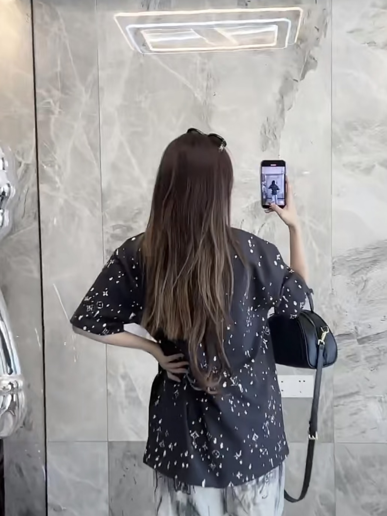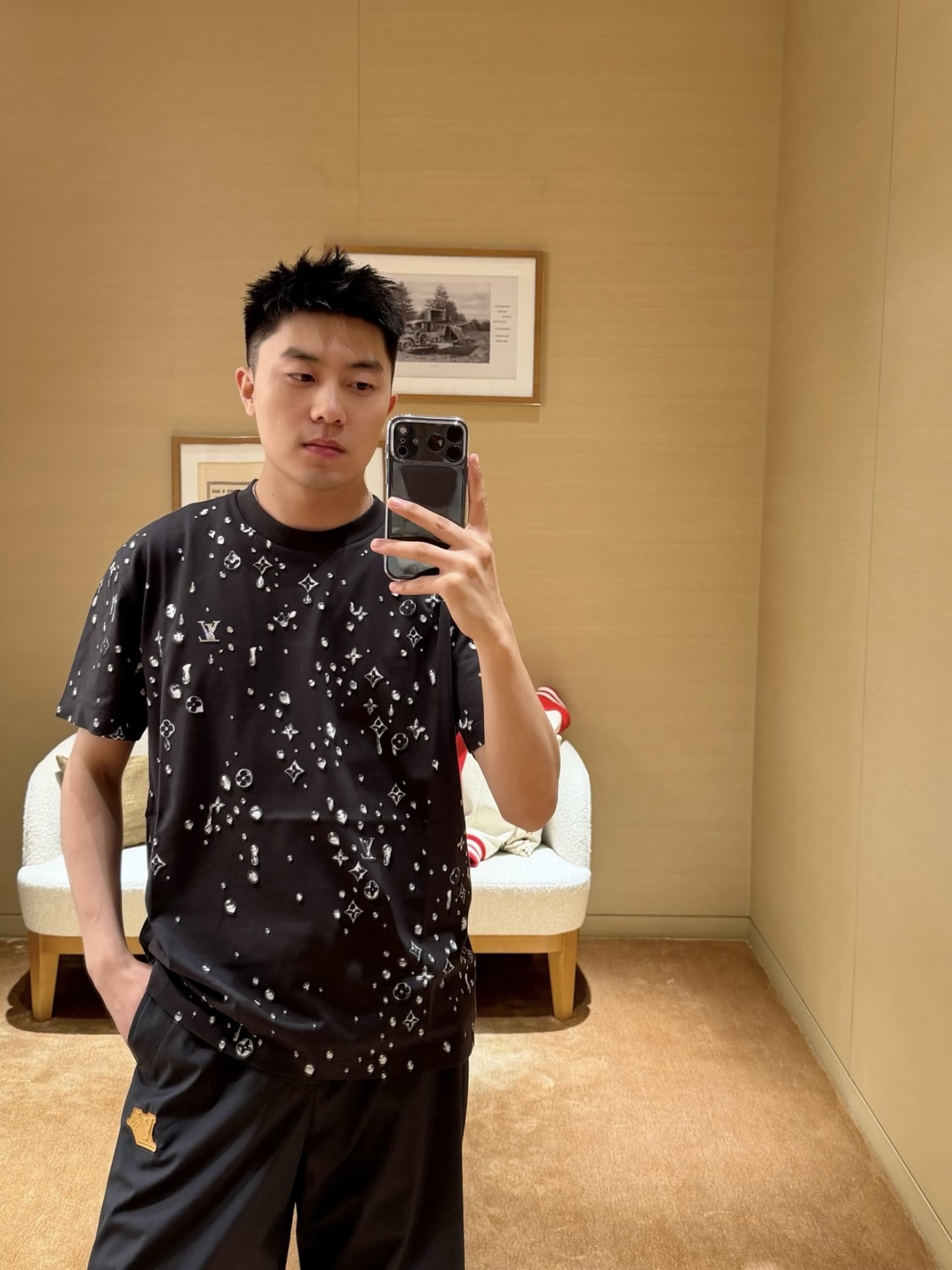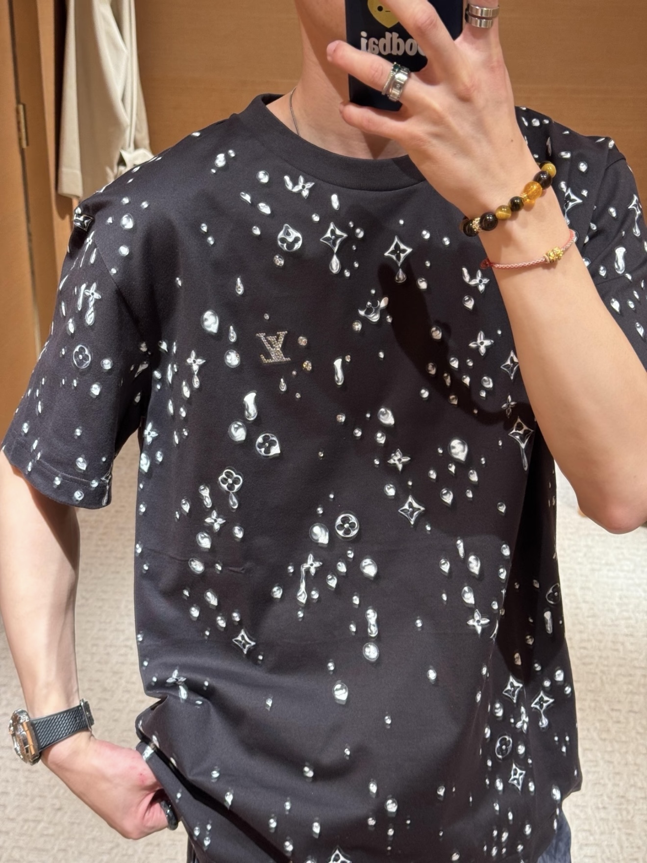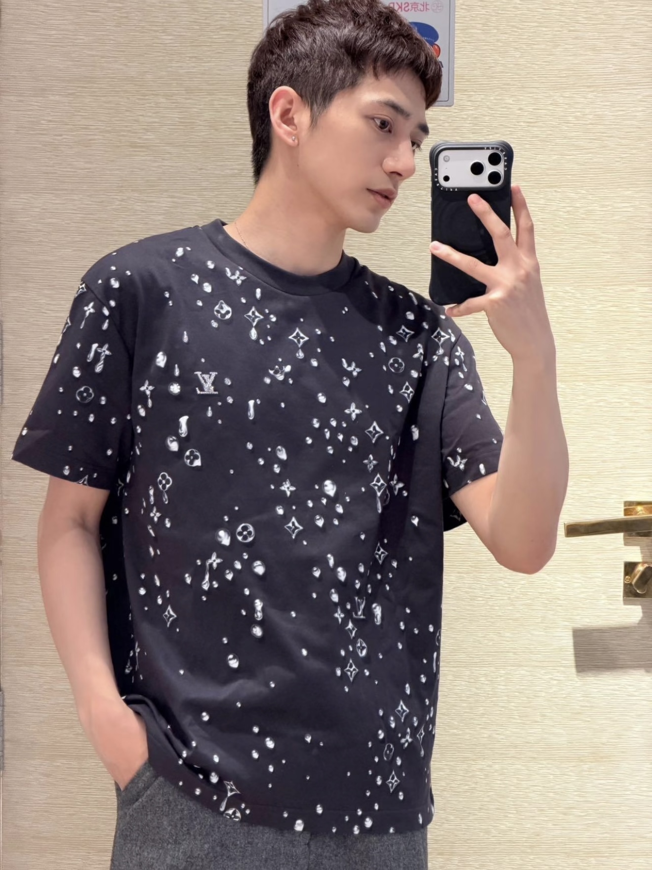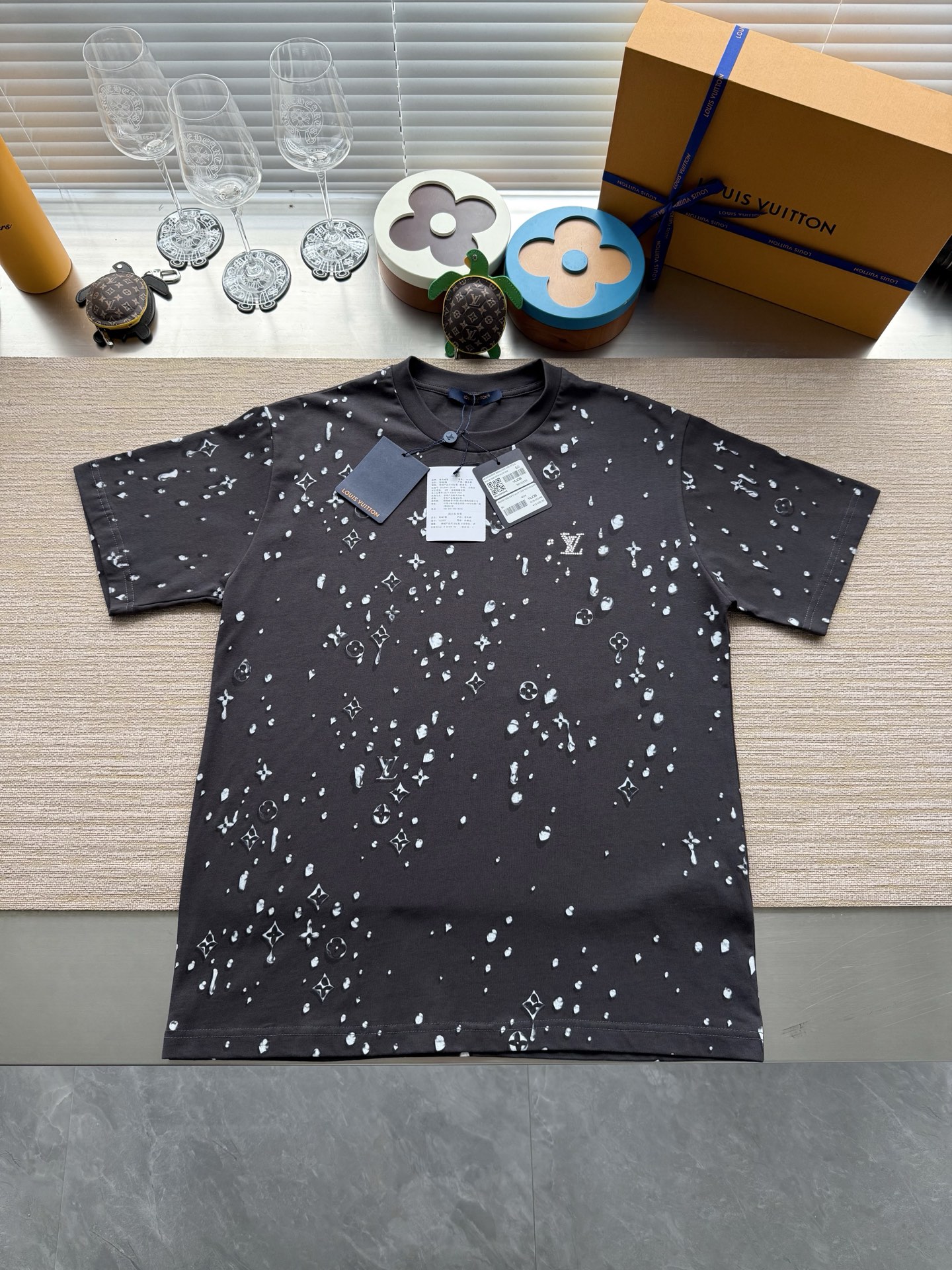 Louis Vuitton25ss水滴印花烫钻短袖T恤‼️整件衣服10400购买ZP拆解打造,采用定制灰色纯棉面料,做到100%全棉进口纱线,意大利制造,全幅饰以水滴印花,胸前饰以LV烫钻字母logo,定织标志性罗纹领口,超紧密度局部编织,真正做到1:1copy 码数:XS S M L