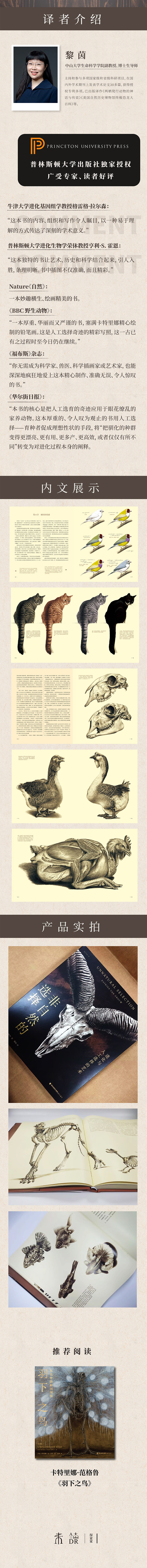 这是一本将科学、艺术和历史完美结合的动物科普书,讲述了人工选择育种——动物如何在家养环境下改变的科学。英国的科普作家、艺术家卡特里娜·范格鲁用超过400幅精美动物骨骼及标本插画诠释了人类对动物的选择培育如何成为“进化”这一概念的完美典范。
