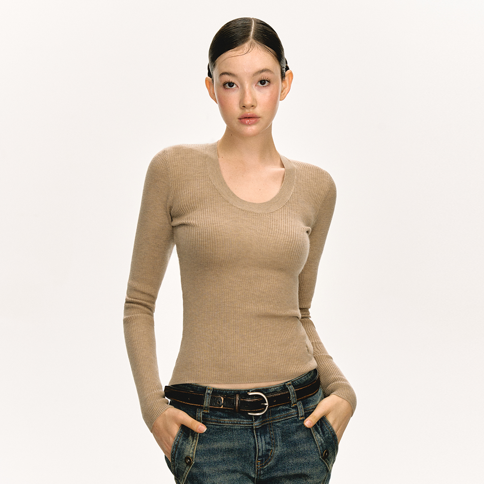 Ariseism美式复古纯色百搭圆领修身针织衫女2025春秋内搭打底上衣