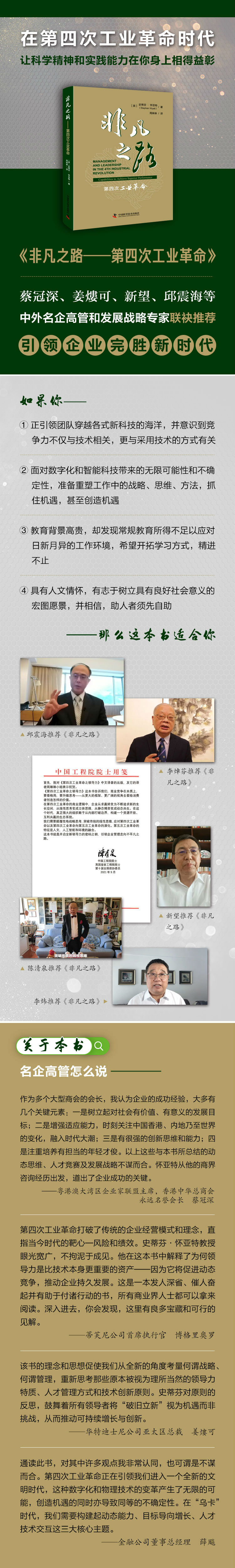 《非凡之路——第四次工业革命》这本书告诉我们,商业竞争在本质上要看格局,要升维思考——从更大的框架、更广阔的视角去看给消费者创造怎样的价值。在第四次工业革命的商业逻辑中,企业从求赢转变为不断追求新的生长空间,从线性思考转变为立体思维,从静态博弈转变为动态共生。真正强大的组织敢于从内部打破边界,构建一个资源开放、互利共赢的生态系统。 这本书就是开启全新领导力的密码之钥,引领企业管理走向不平凡之路。我对《非凡之路——第四次工业革命》中译本的出版表示祝贺。 ——中国工程院院士,英国皇家工程院院士 陈清泉