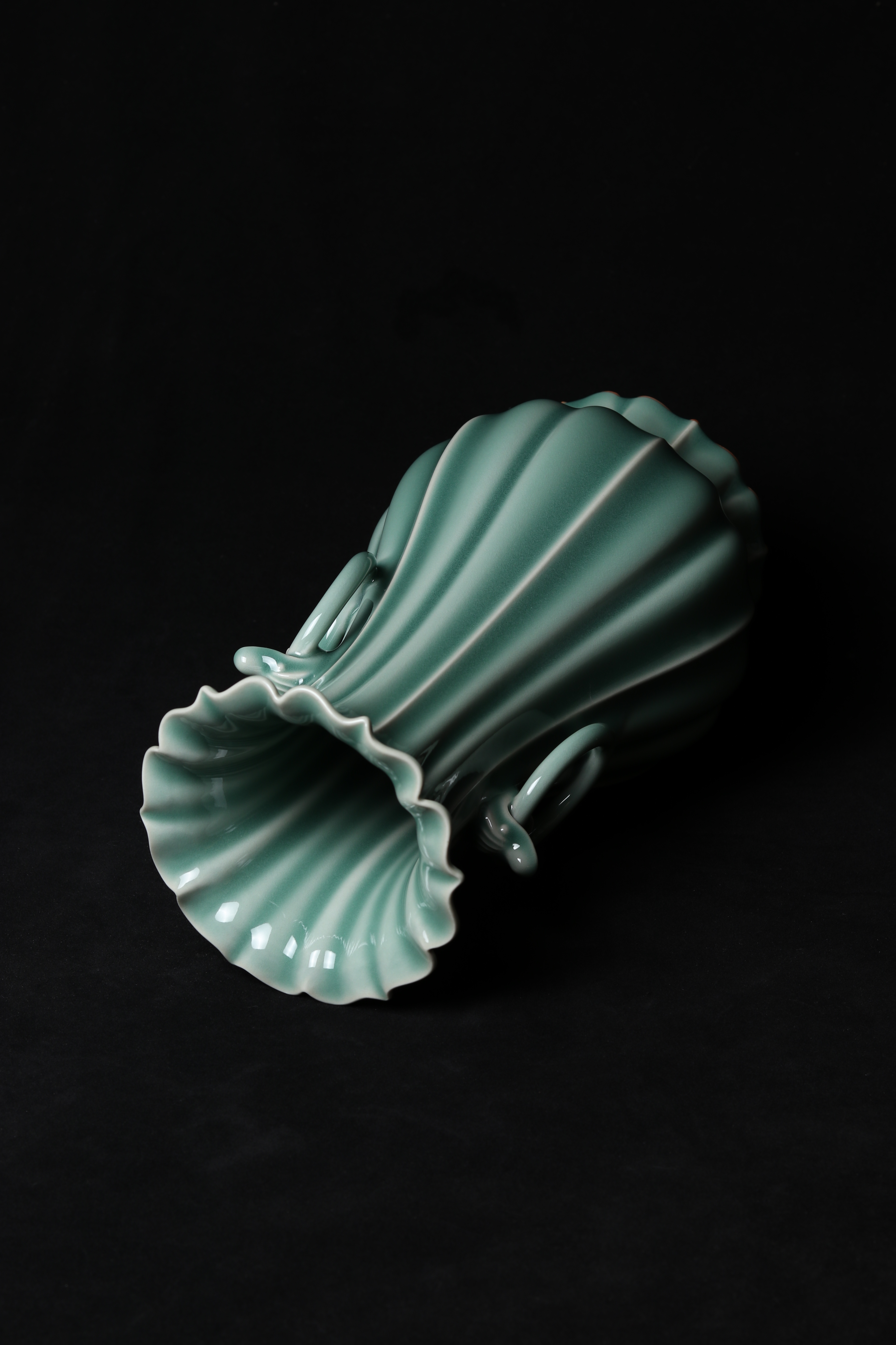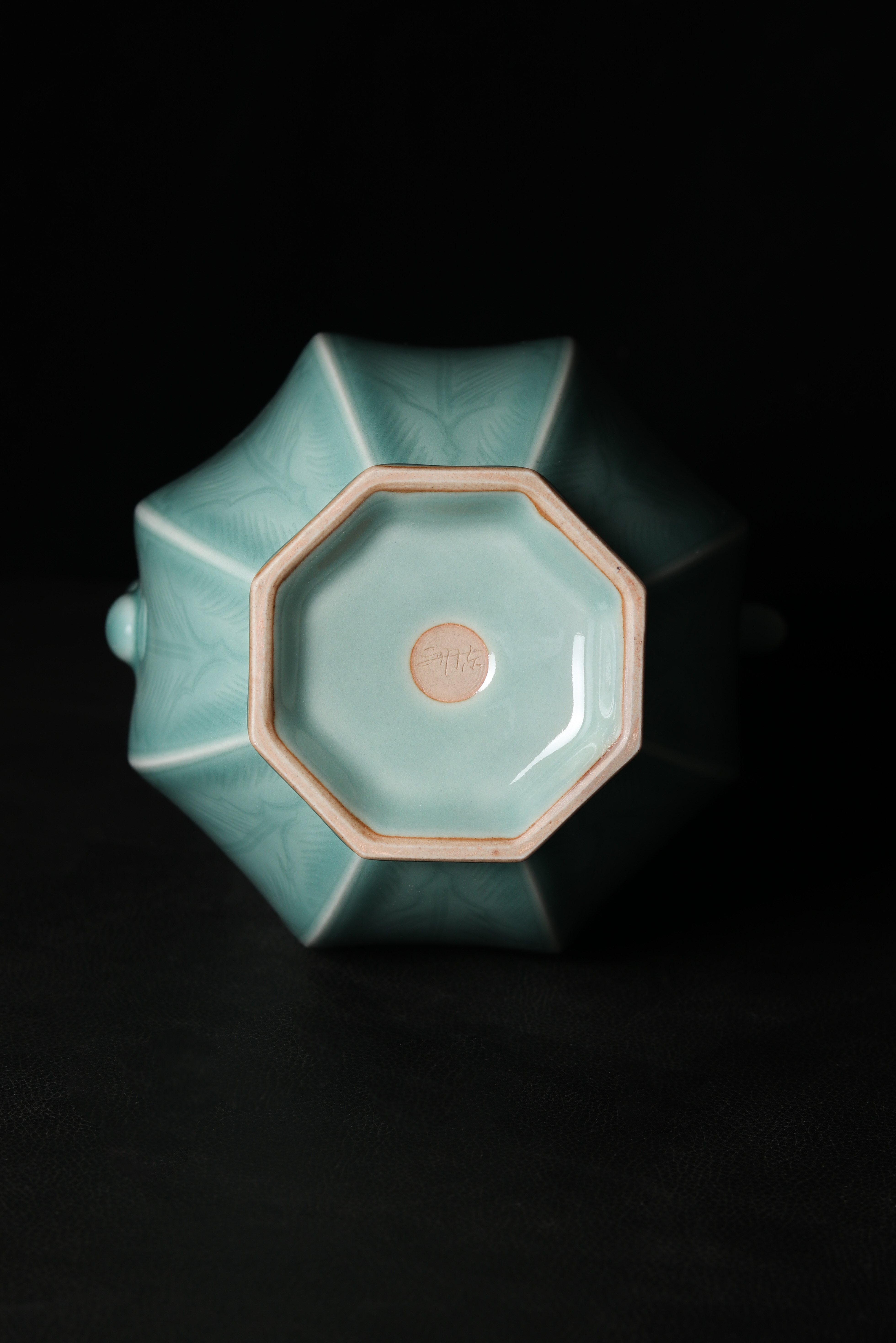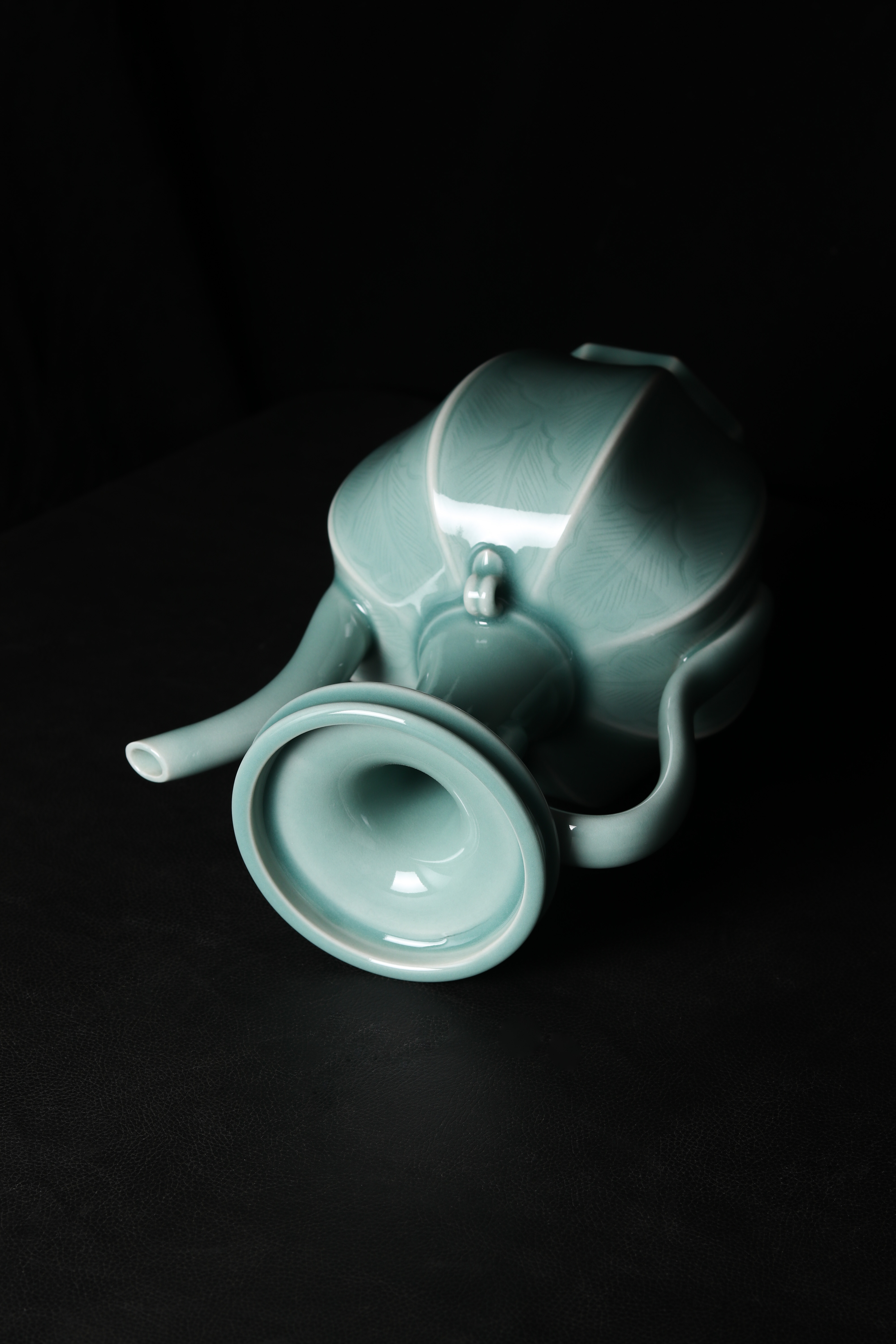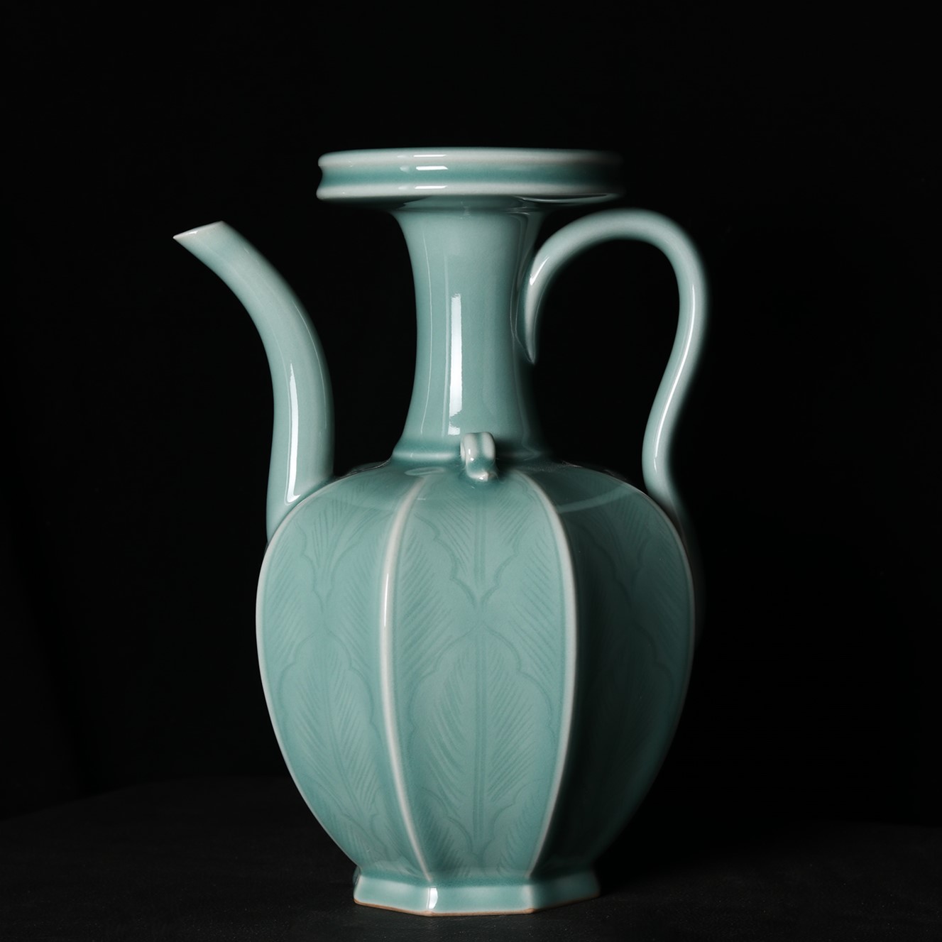 口径11、底径9、高27.5厘米。浅盘口,细长颈,八棱腹,圈足外撇。流长而弯曲,把手流畅,手握感适合,肩部置有一对系,中间亦分成两股。腹部的每个区域内都用细线划满芭蕉叶纹(寓意大叶有成)。通体施淡天青釉,圈足内部也有釉,足端无釉。此件执壶制作规整,纹饰优美,为注酒器。初创时期的龙泉窑较多地烧造淡青釉产品,生产年代大致在北宋早期(此作品仿北宋划花执壶)。