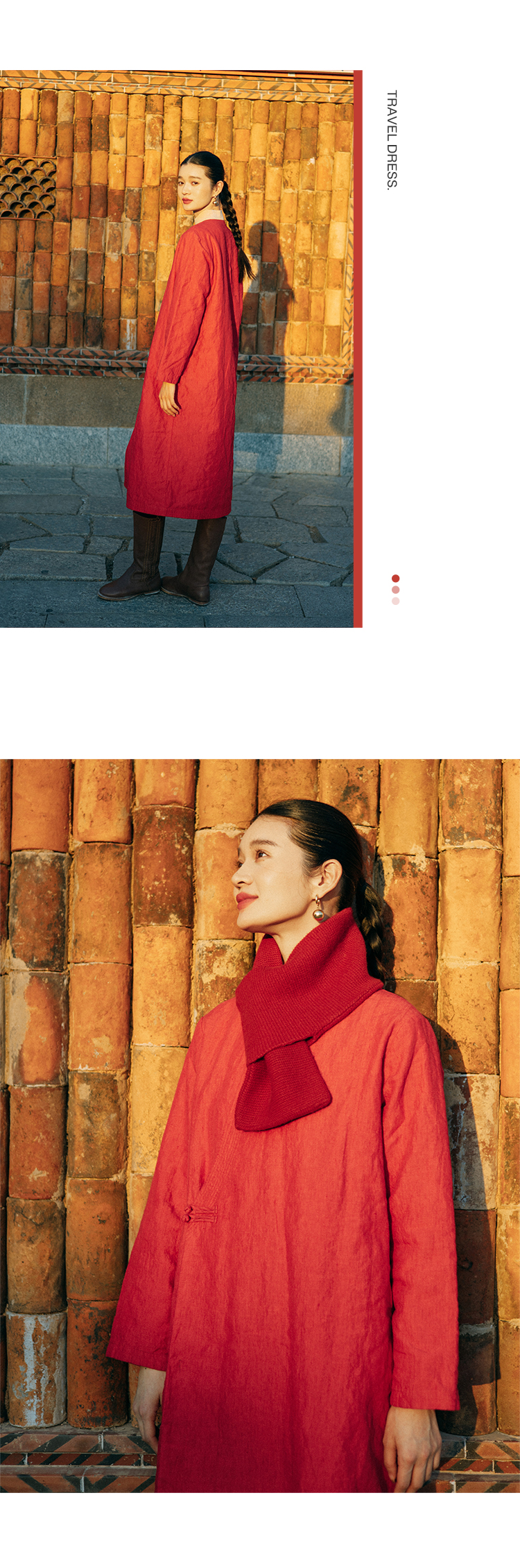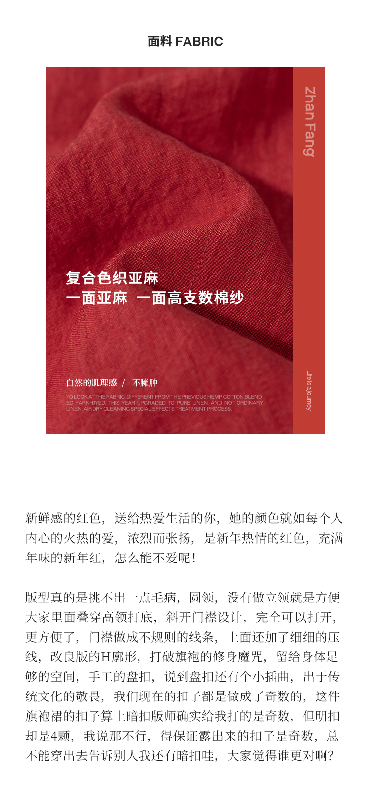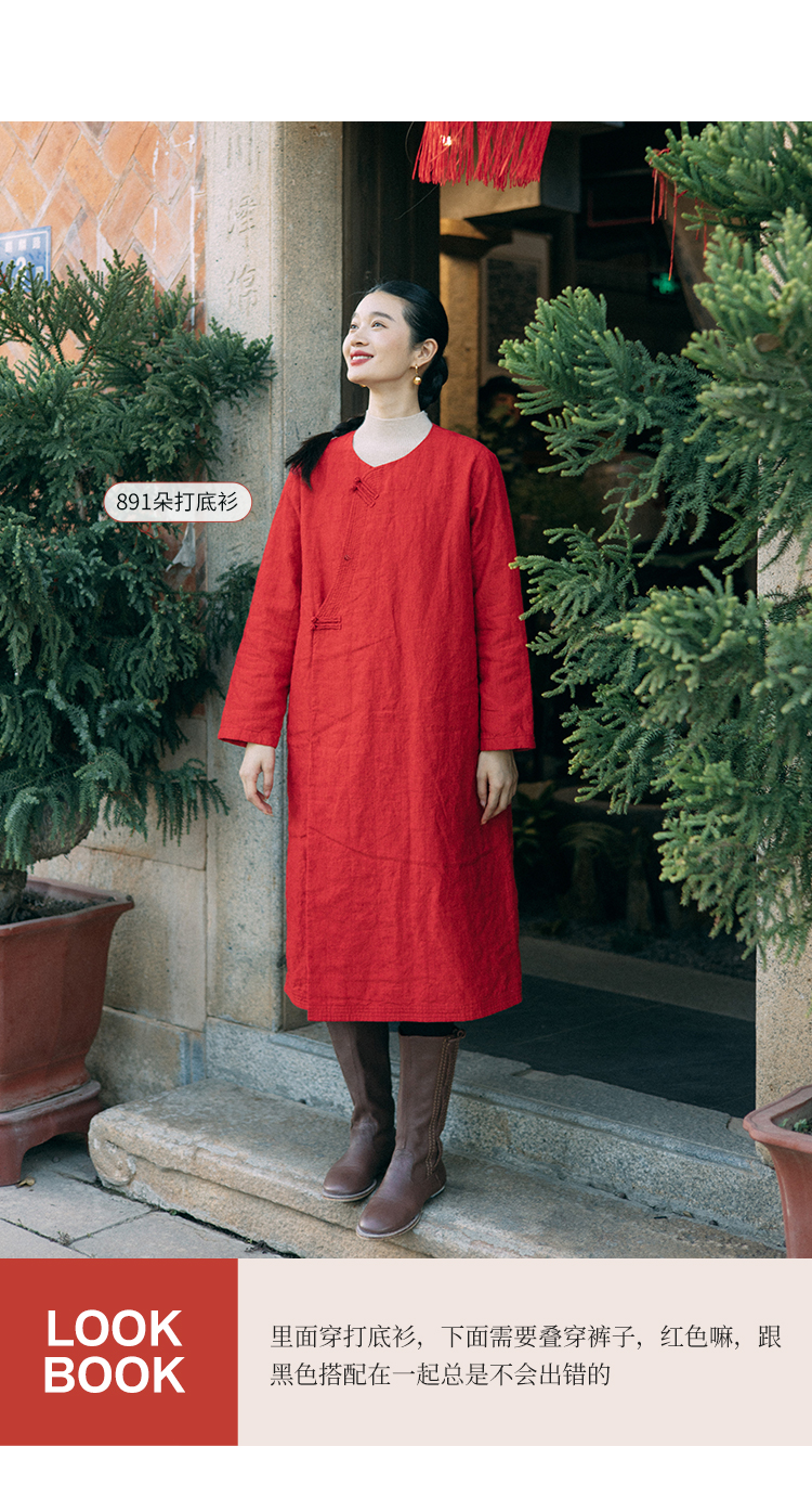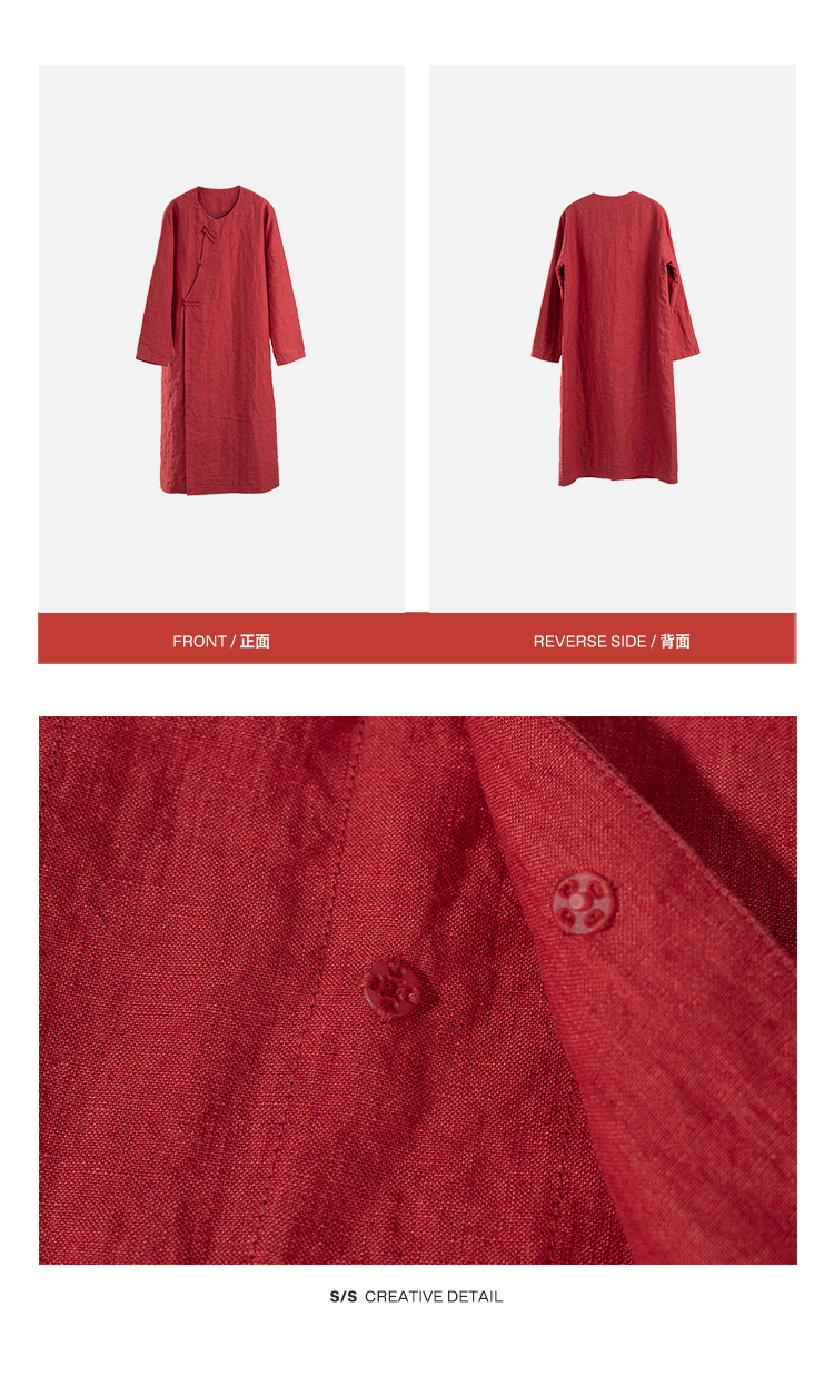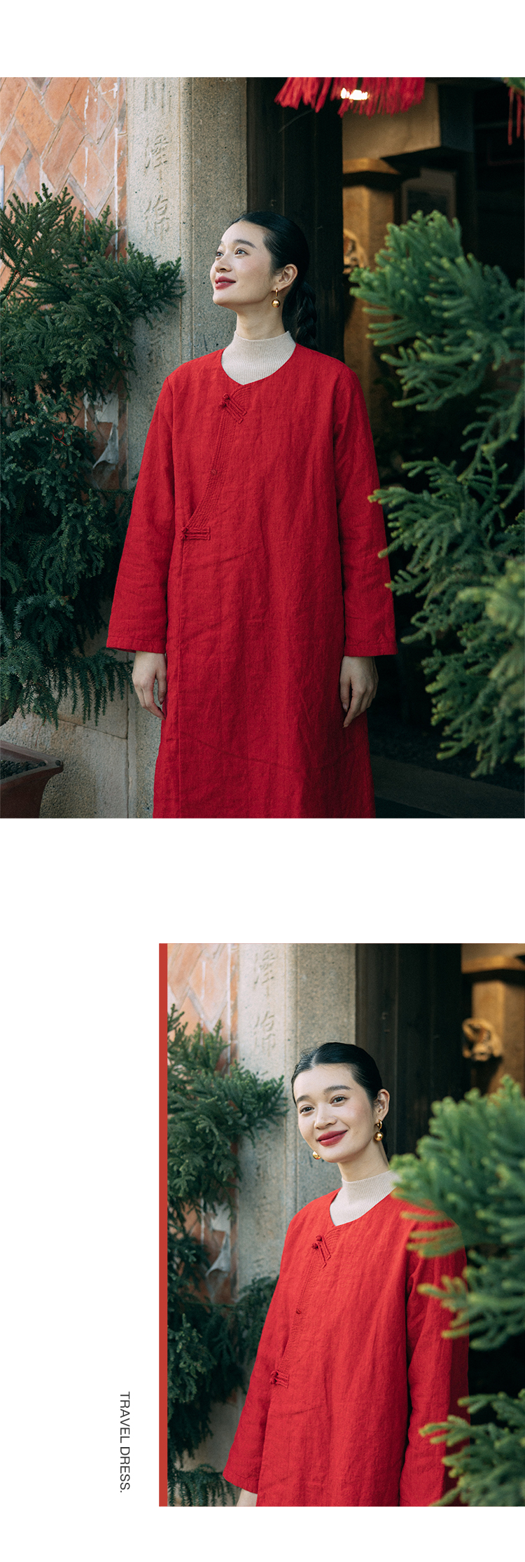 绽放014朵/年服圆领手工盘扣新中式亚麻色织斜门襟红色绗棉连衣裙