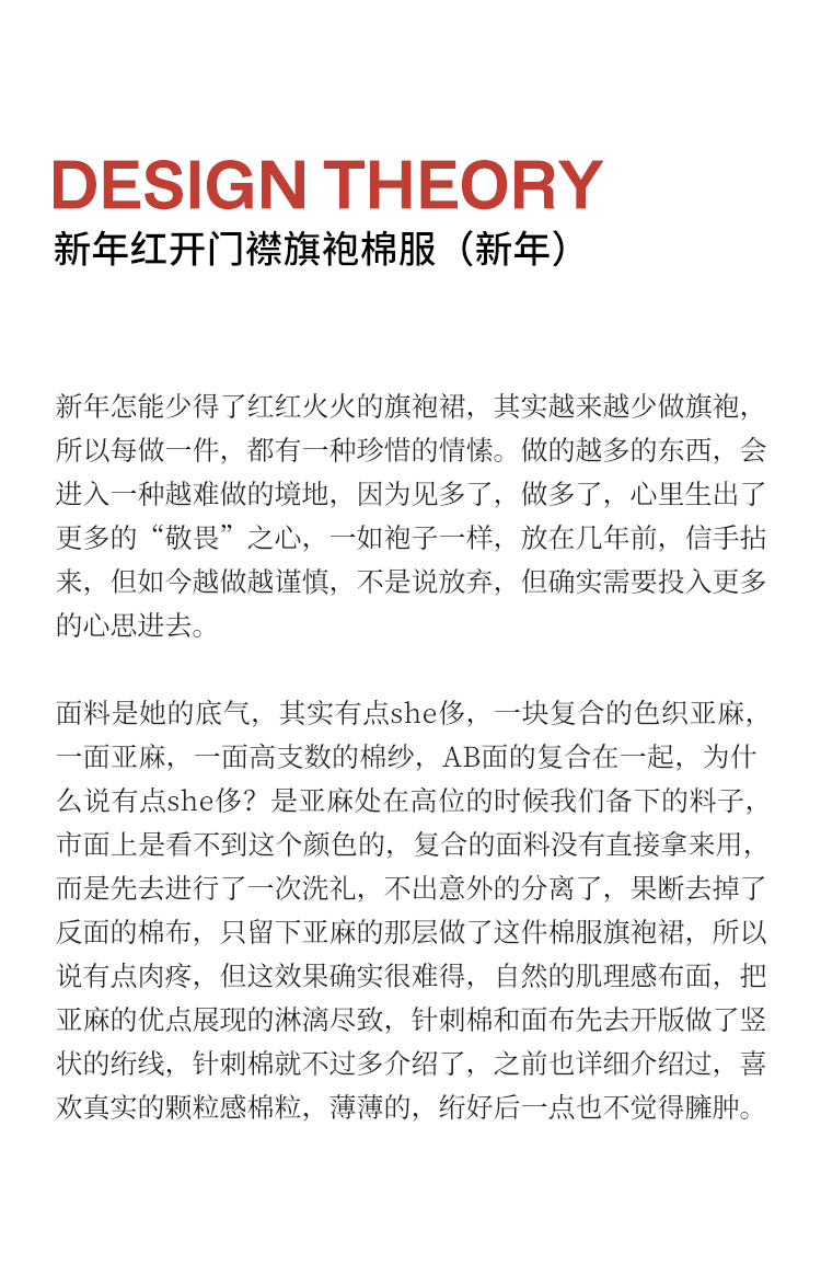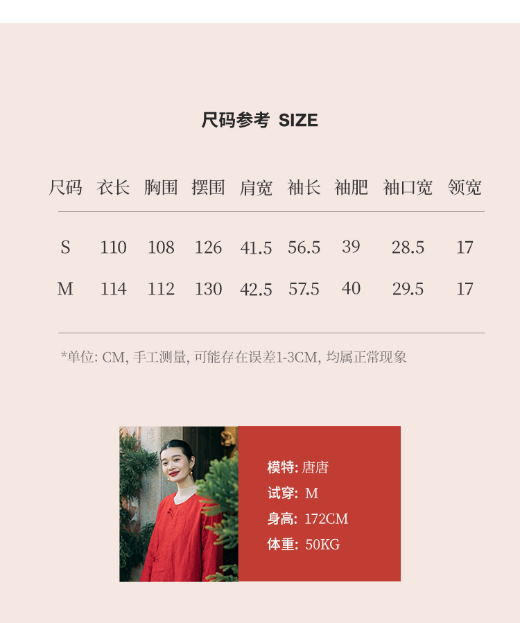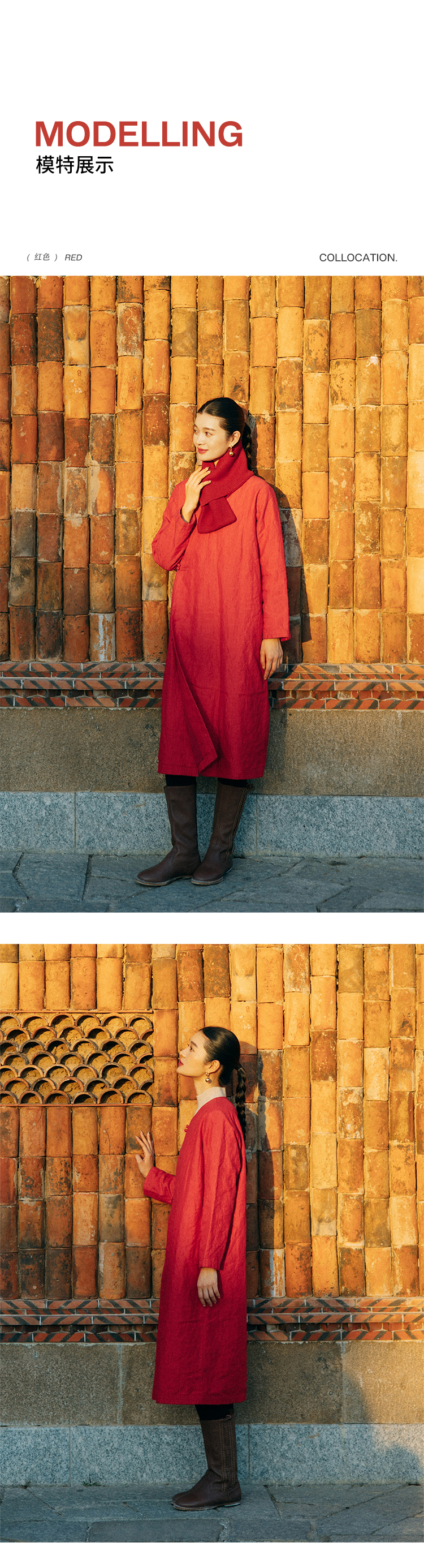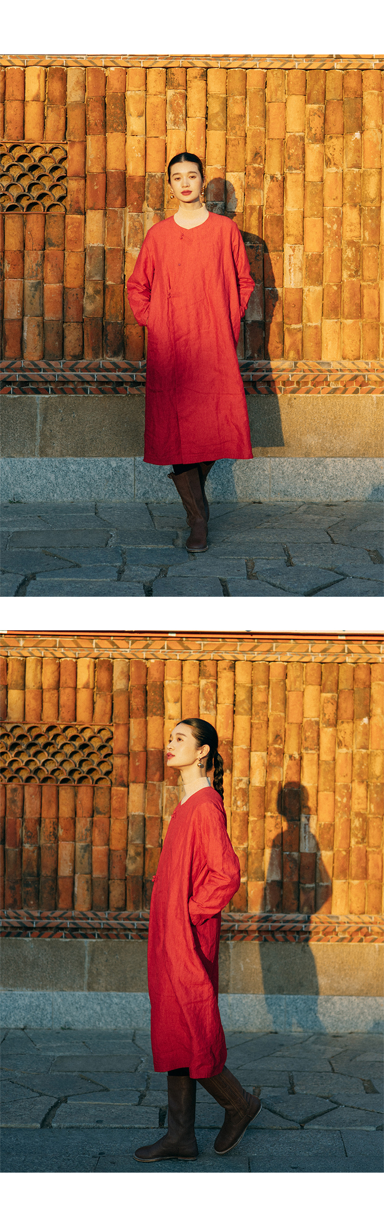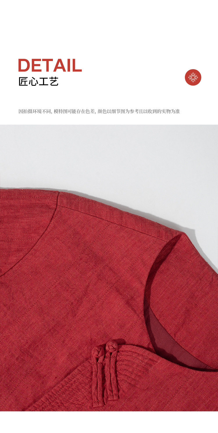 绽放014朵/年服圆领手工盘扣新中式亚麻色织斜门襟红色绗棉连衣裙
