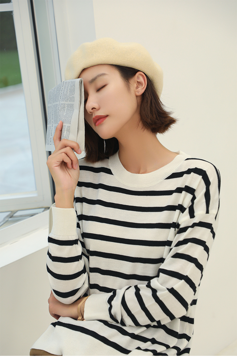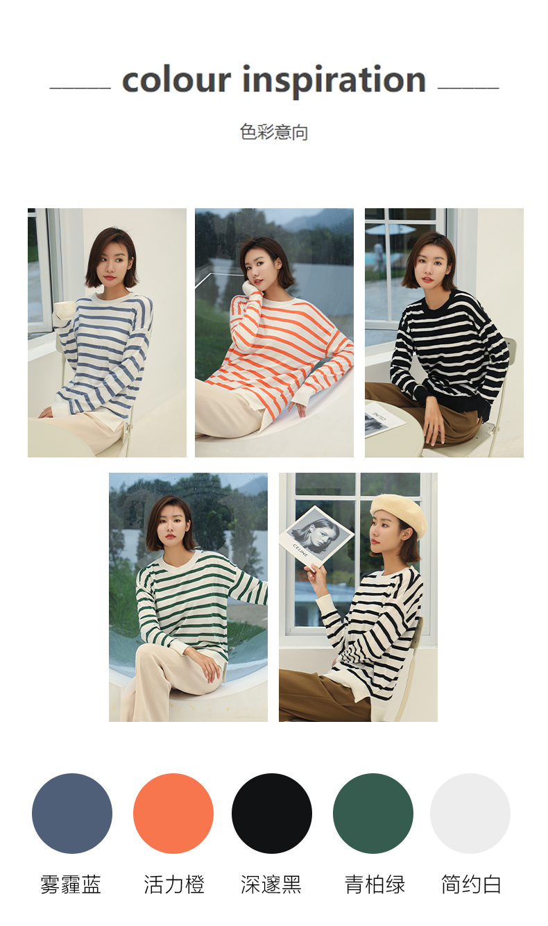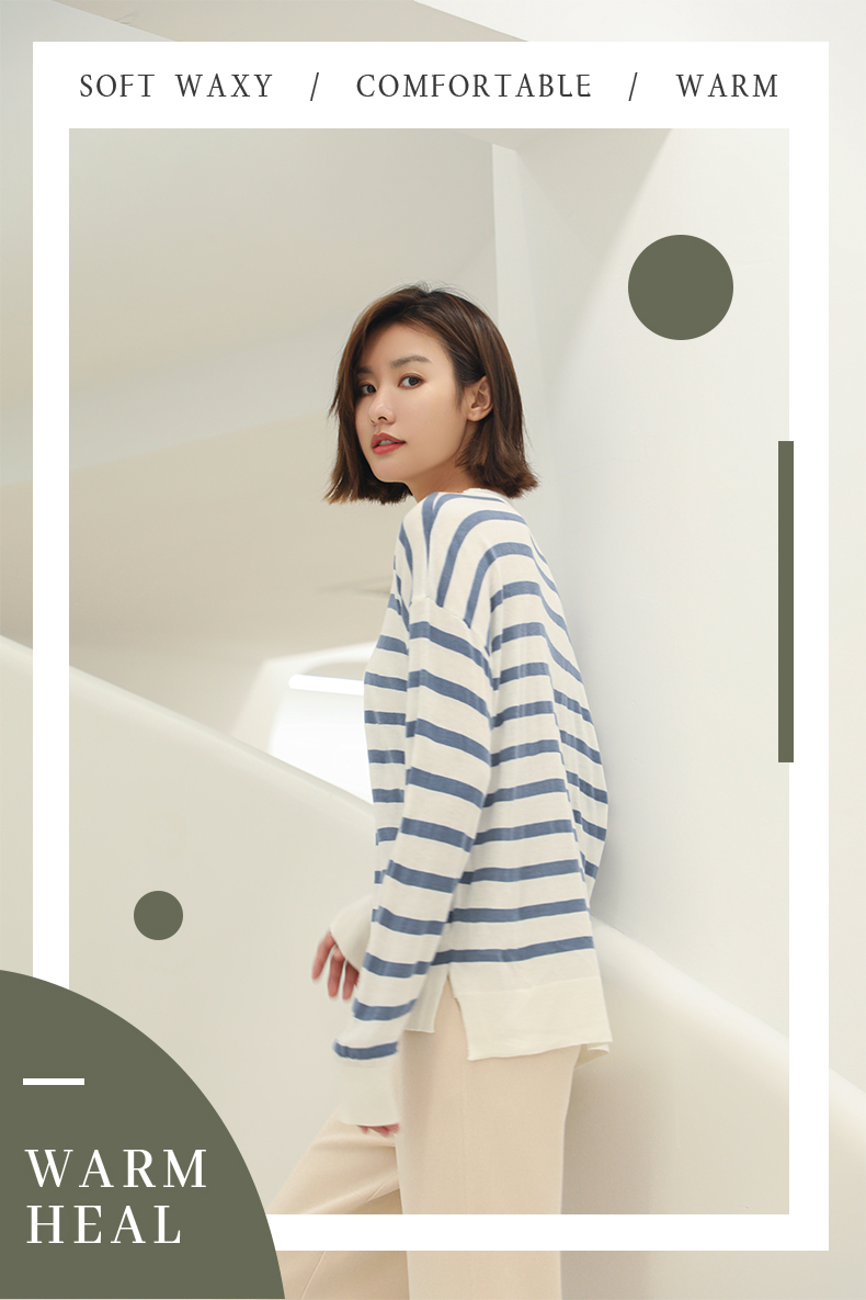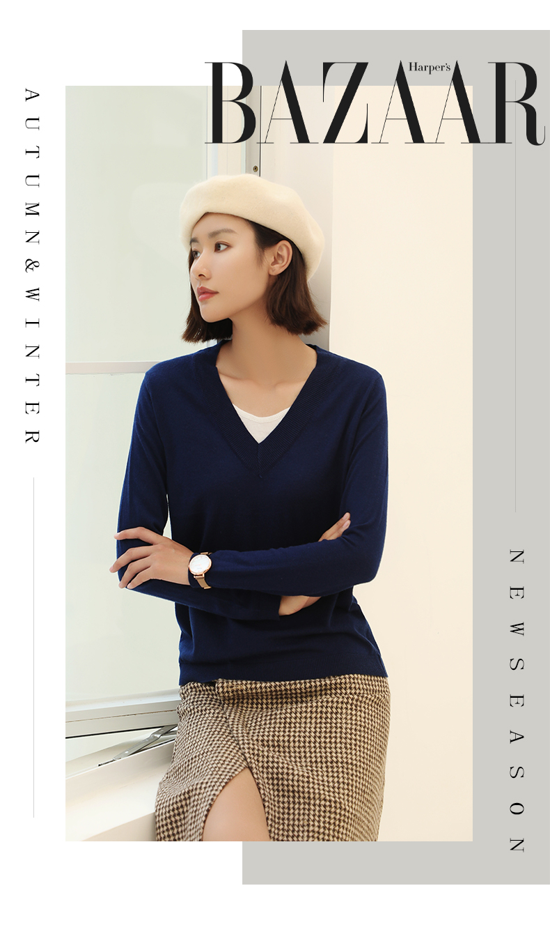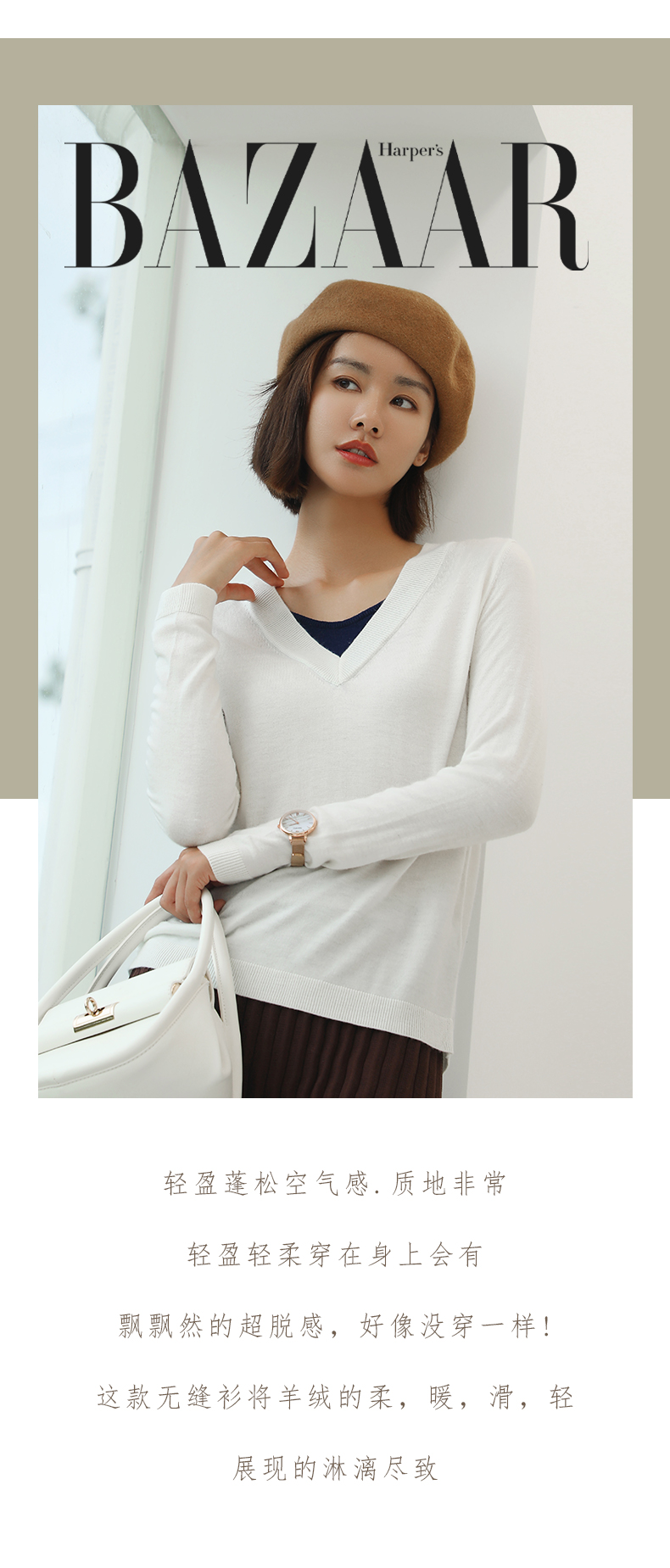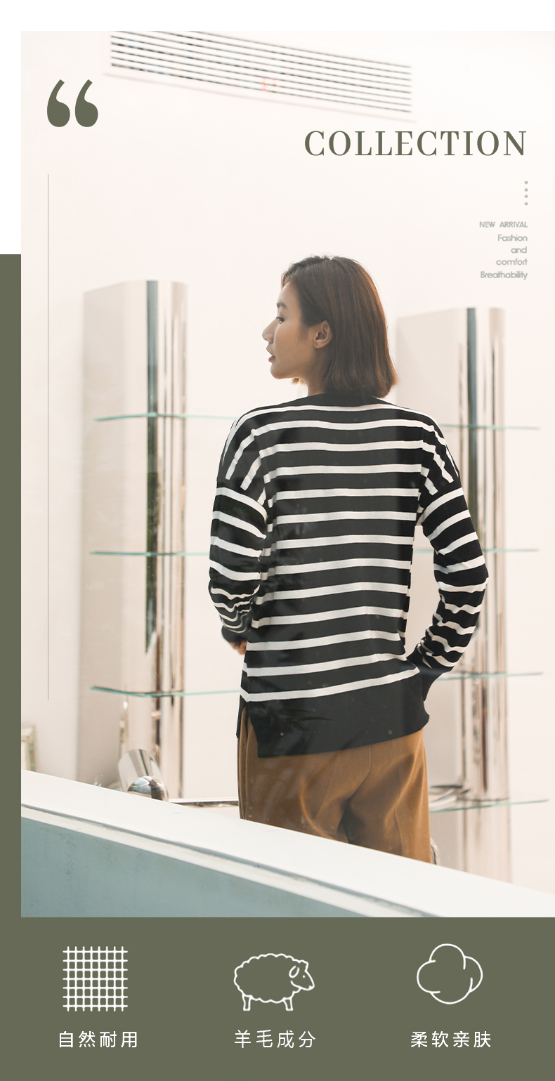 Happy's Bazzar芭莎秋冬新品套头长袖毛针织衫女条纹羊毛衫&V领拼接假两件羊毛针织衫