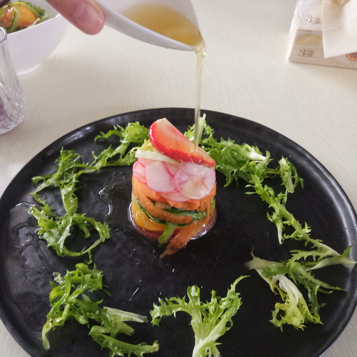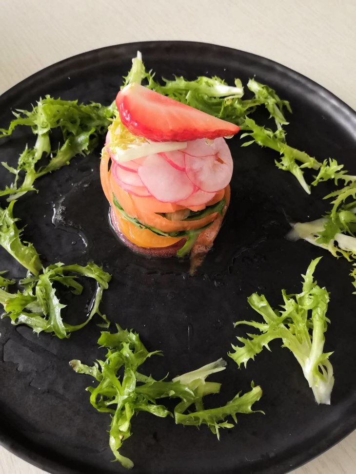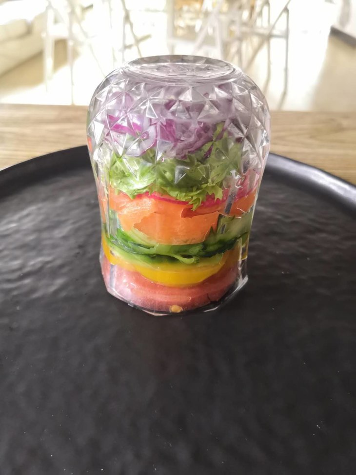 4、蔬菜用盐过后会出水分,可以稍微把它挤干,把每种蔬菜按颜色一层层的铺到杯子里面,倒扣在盘子里
