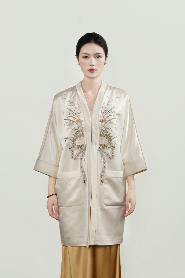 东方境X郭培| 花束刺绣拼丝绒长外套-香槟色