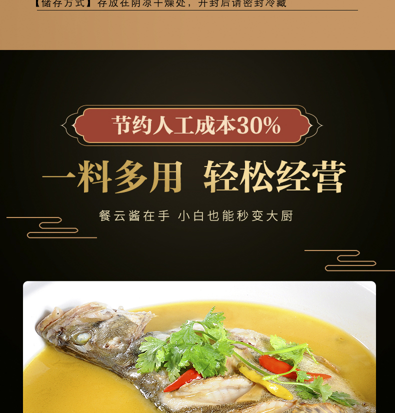 餐云创意金汤酱 源自洞庭湖区的配方 湖区煮鱼和水产类产品用途较多 后被餐饮创新者开发应用更多的菜品(10斤装一桶做120份)