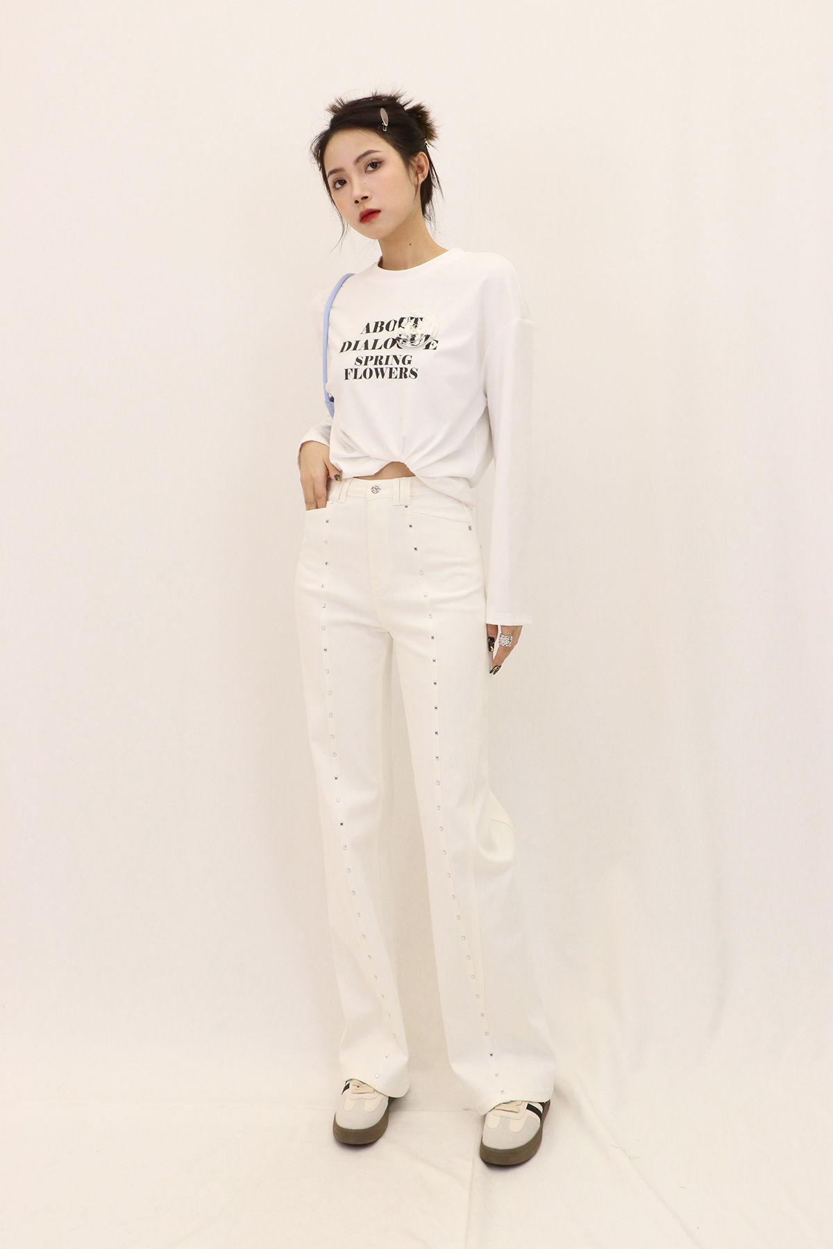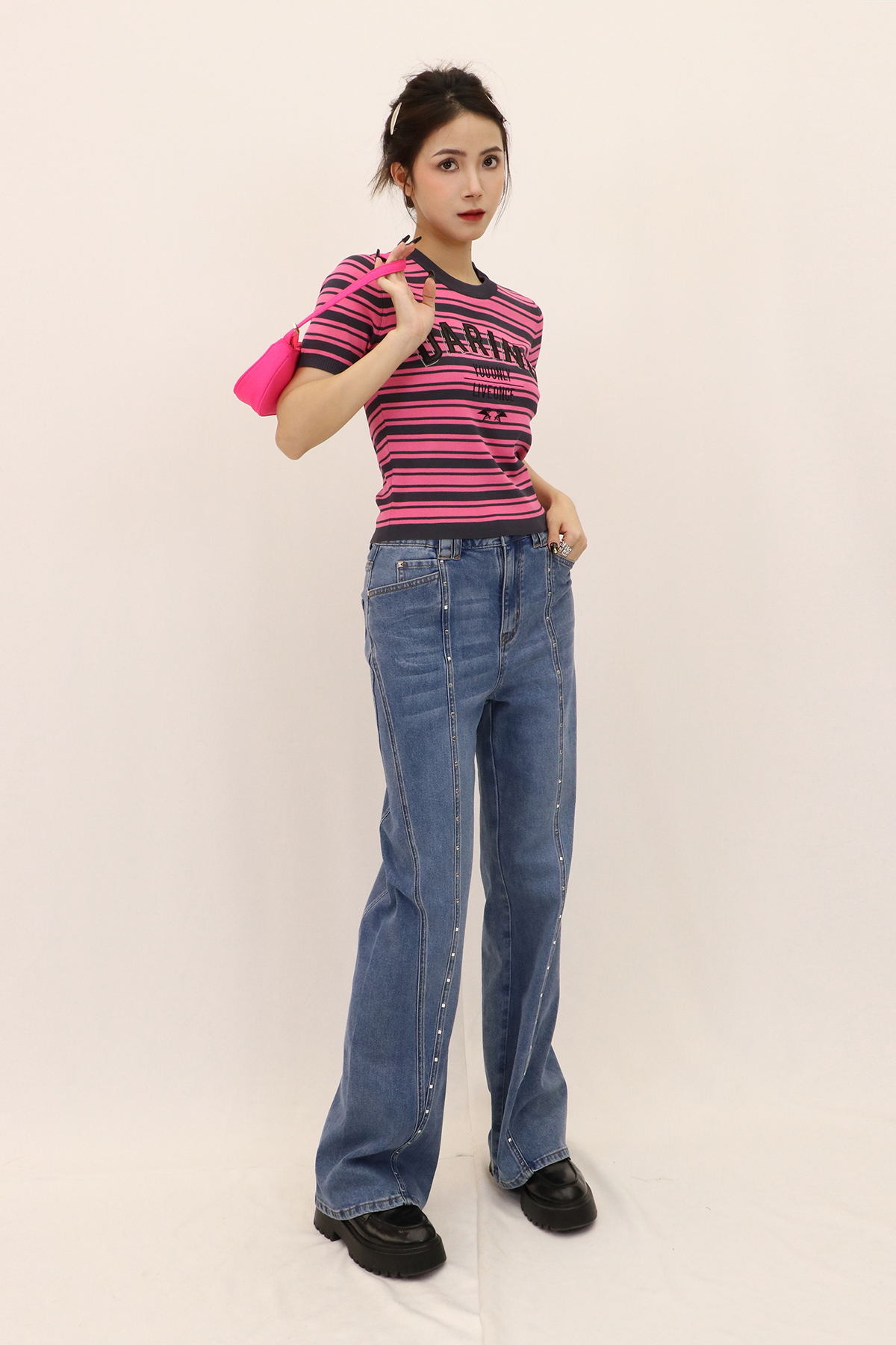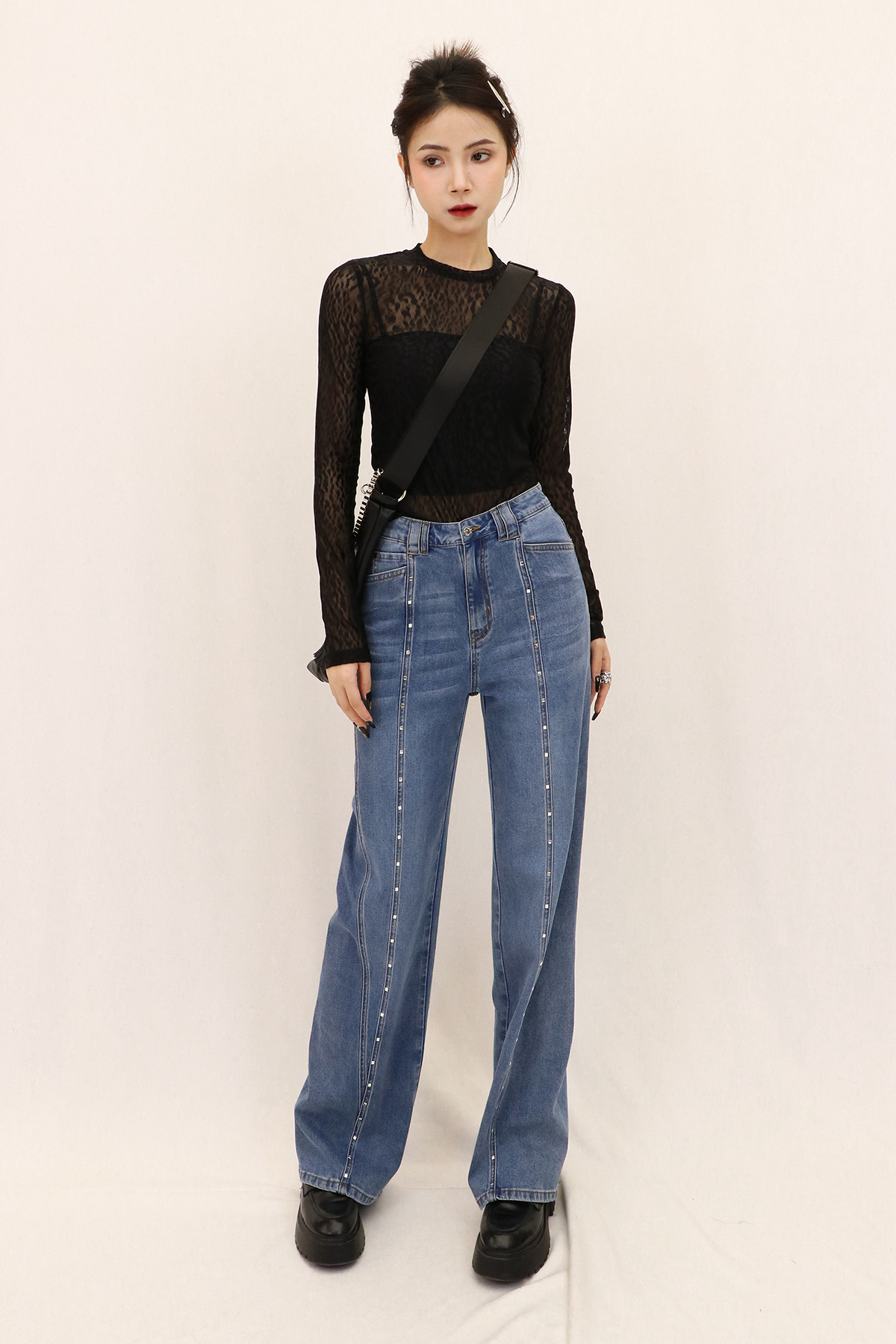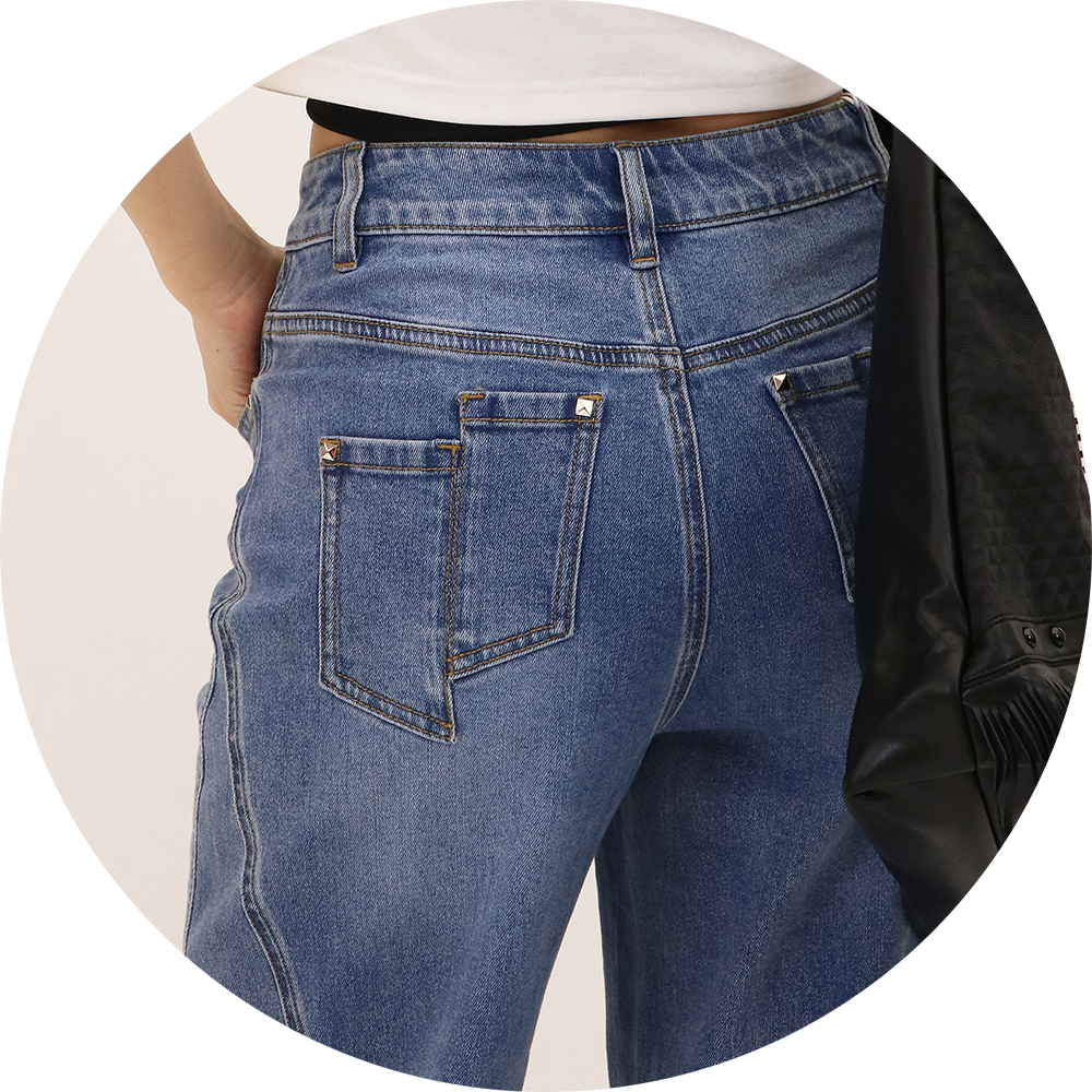 经典的牛仔蓝百搭时尚,H版对腿部包容性与修饰效果都不错,舒适又显瘦,裤身还装饰了方形立体烫钻,细节感满满,整件使用了酵洗,炒盐,喷马骝3种工艺,非常重工、配上一件基础上衣开衫,简单又不费力的时髦惑。
