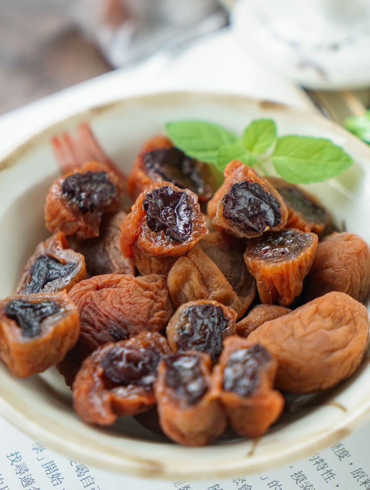 1.葡萄梅子刚做好比较湿软,放置一段时间后变干,盐分慢慢析出,出现白霜。不影响食用;