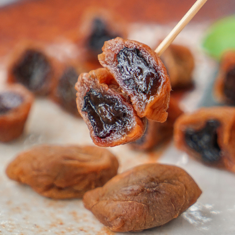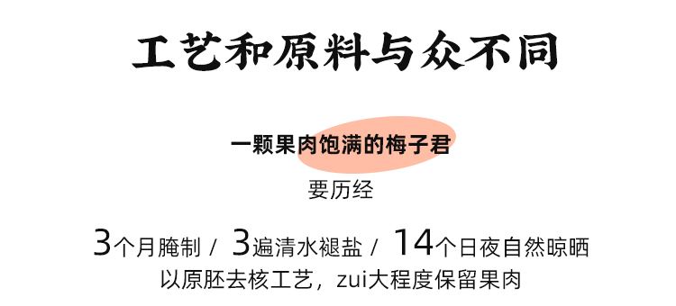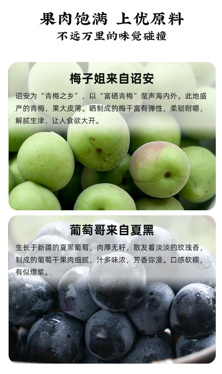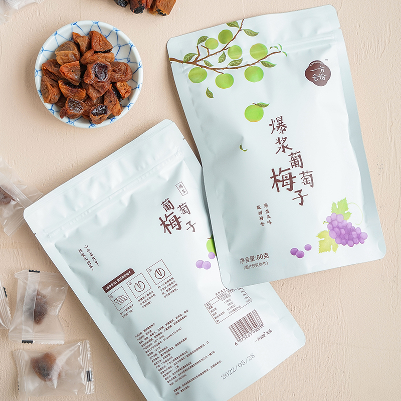 一方云拾的爆浆葡萄梅子相比一般梅肉零食,它的工艺和原料都很与众不同!选用的是来自诏安的青梅,诏安为“青梅之乡”,以“富硒青梅”蜚声海内外,果大皮薄,晒制成的梅干后富有弹性,解腻生津,让人食欲大开;葡萄则是生长于新疆的夏黑葡萄,名副其实的甜度“大咖”,肉厚无籽,散发着淡淡的玫瑰香,用它制成的葡萄干果肉柔韧耐嚼,汁多味浓。历经 3个月腌制、3遍清水褪盐、14个日夜自然晾晒,以原胚去核工艺,保留厚实的果肉,再手工将葡萄干塞进梅子君的内心,这才成就了这一颗会爆浆的葡萄梅子干!