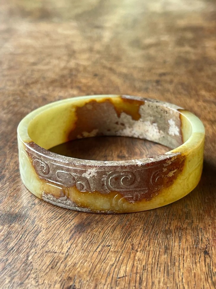 这是一件以和田褐白沁黄玉雕琢而成的高古形式螭龙纹扁带手镯,环以油度高、材质温润、比重高的和田黄玉雕琢而成厚扁带型手镯,局部以老式提油染色工艺人工烧出褐色与鸡骨白沁色,玉环外壁浅浮雕高古玉形式抽象螭龙纹饰,造型简约典雅,尺寸硕大,褐白沁黄玉色泽柔美,斑纹自然生动,精湛的表面雕琢工艺,雕琢出生动抽象螭龙纹,构图典雅、简约贵气,刀法娴熟简洁流畅,提油烧制沁色斑驳自然,颇具明清仿高古玉雕之风格与特质。