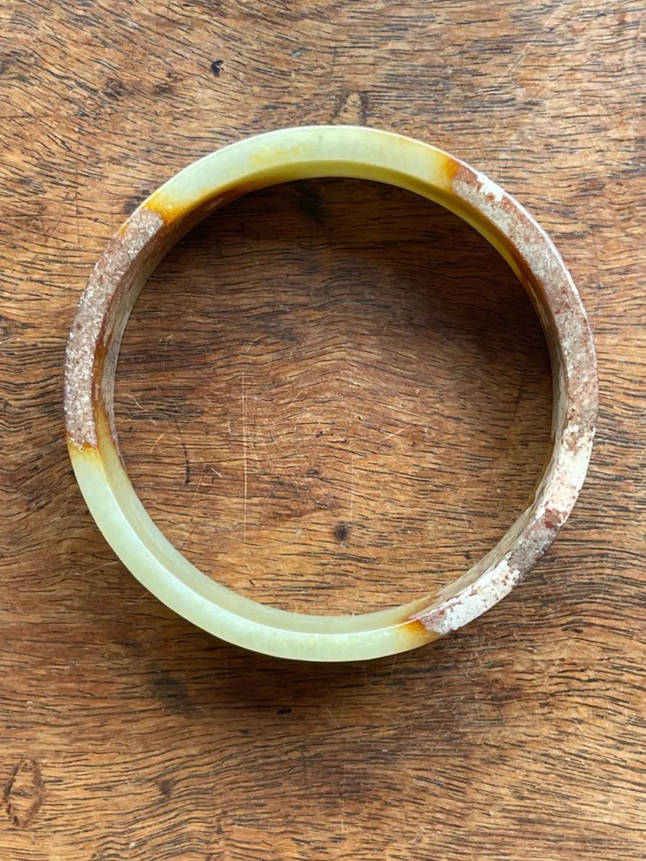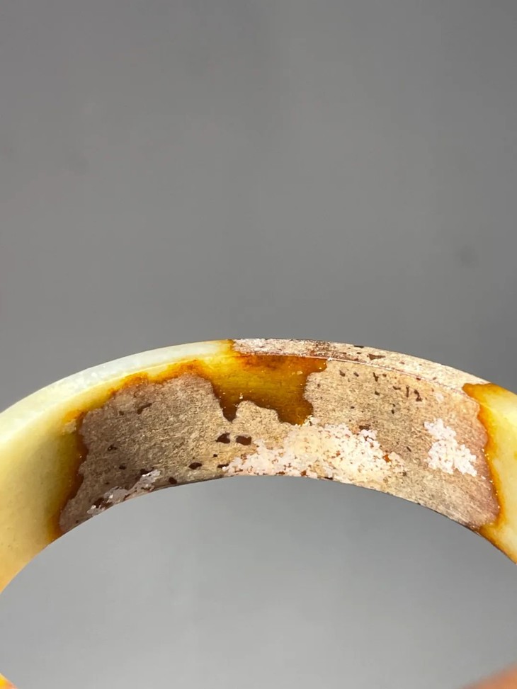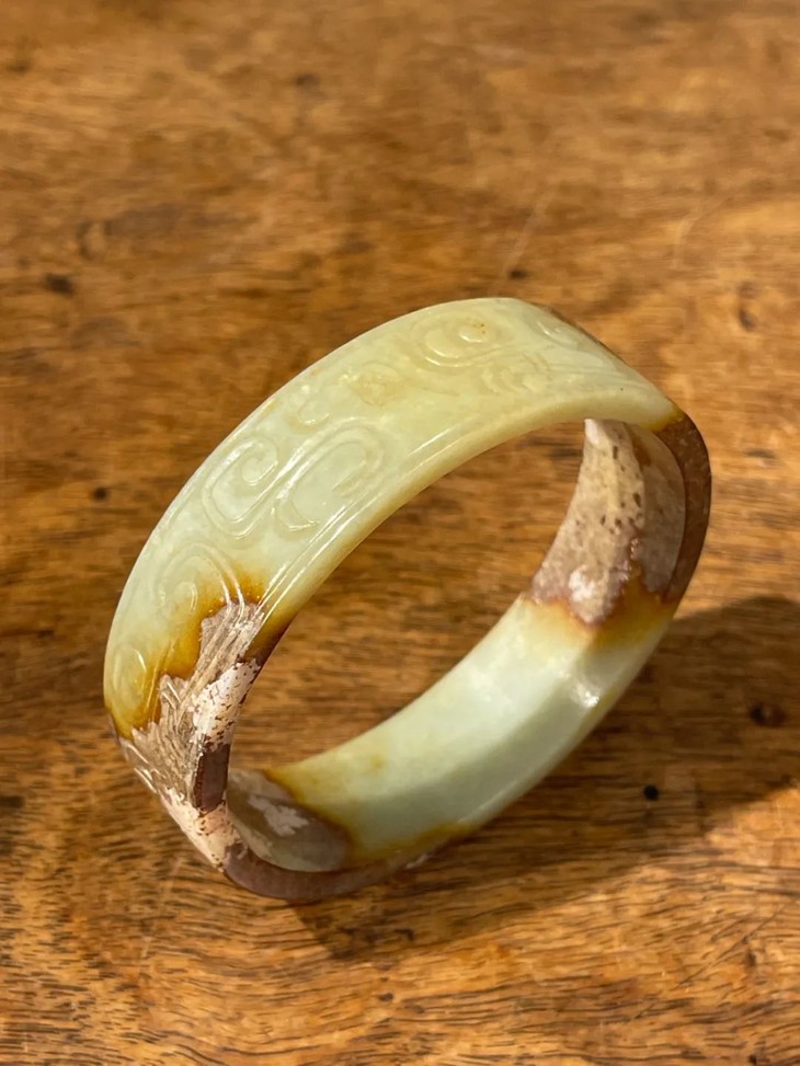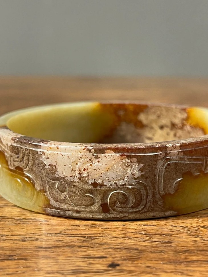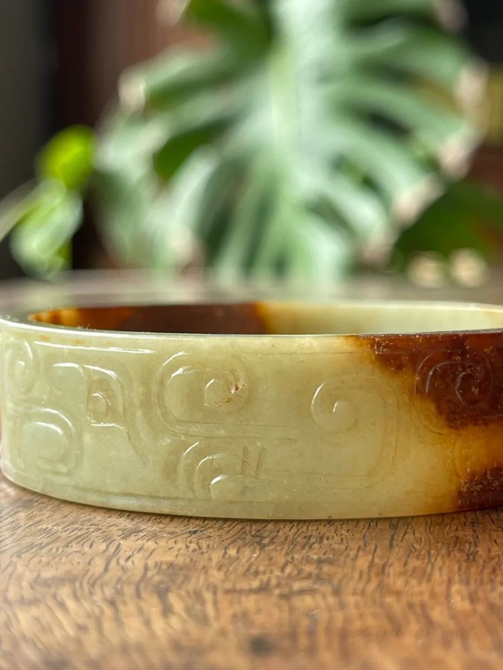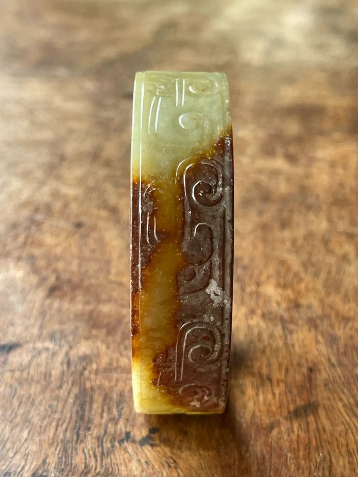 此褐白沁黄玉雕螭龙纹扁带手镯雕琢费工费料,制作当时肯定极其昂贵,表面包浆皮壳温润细腻,握于手中柔美厚实,令人爱不释手,摆放于案头或展示于柜中,尽显旧时代皇公贵族器物之高雅气质,入手可以当茶席盖置,镇紙、或是手镯。