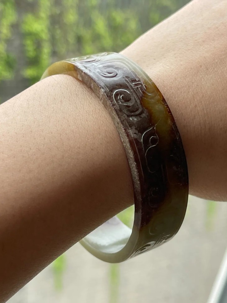 此褐白沁黄玉雕螭龙纹扁带手镯,是一件入手可收藏、展示、或随身把玩的精美老玉藏品。除边沿细微老磕碰外,保存完好,包浆皮壳温润细腻,古韵盎然。