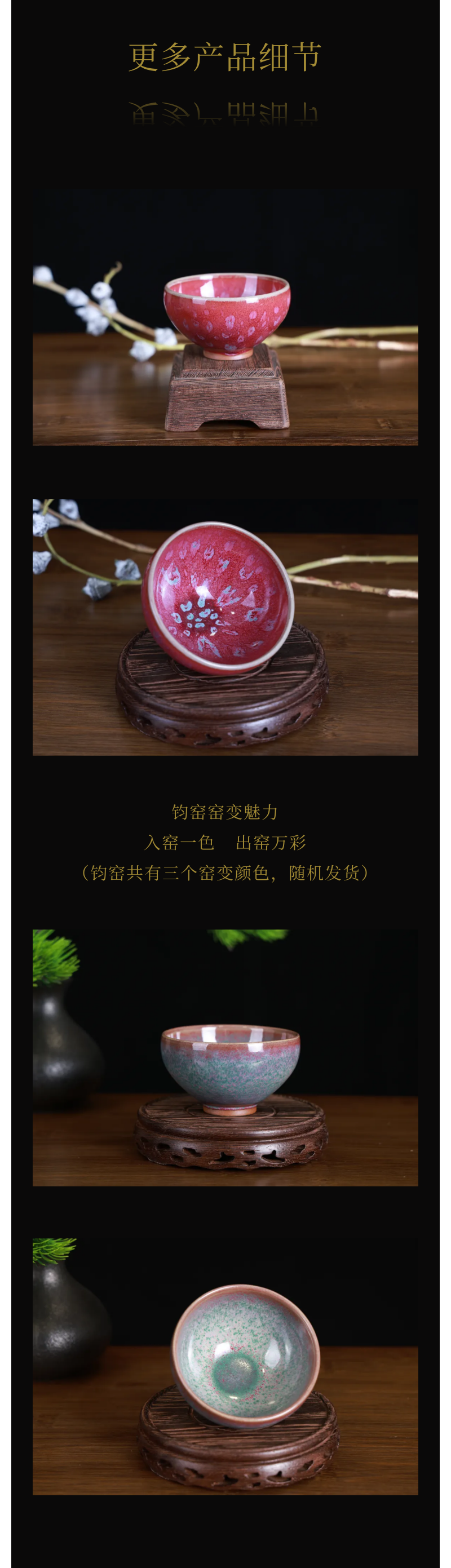 关于釉色的说明:合集中的五大窑主人杯,均为原矿釉烧制,每只都不尽相同相同,请提前知悉。其中,钧窑的窑变更是“一窑万彩”,下单可注明颜色,未注明的随机发货。