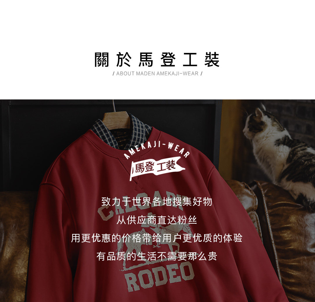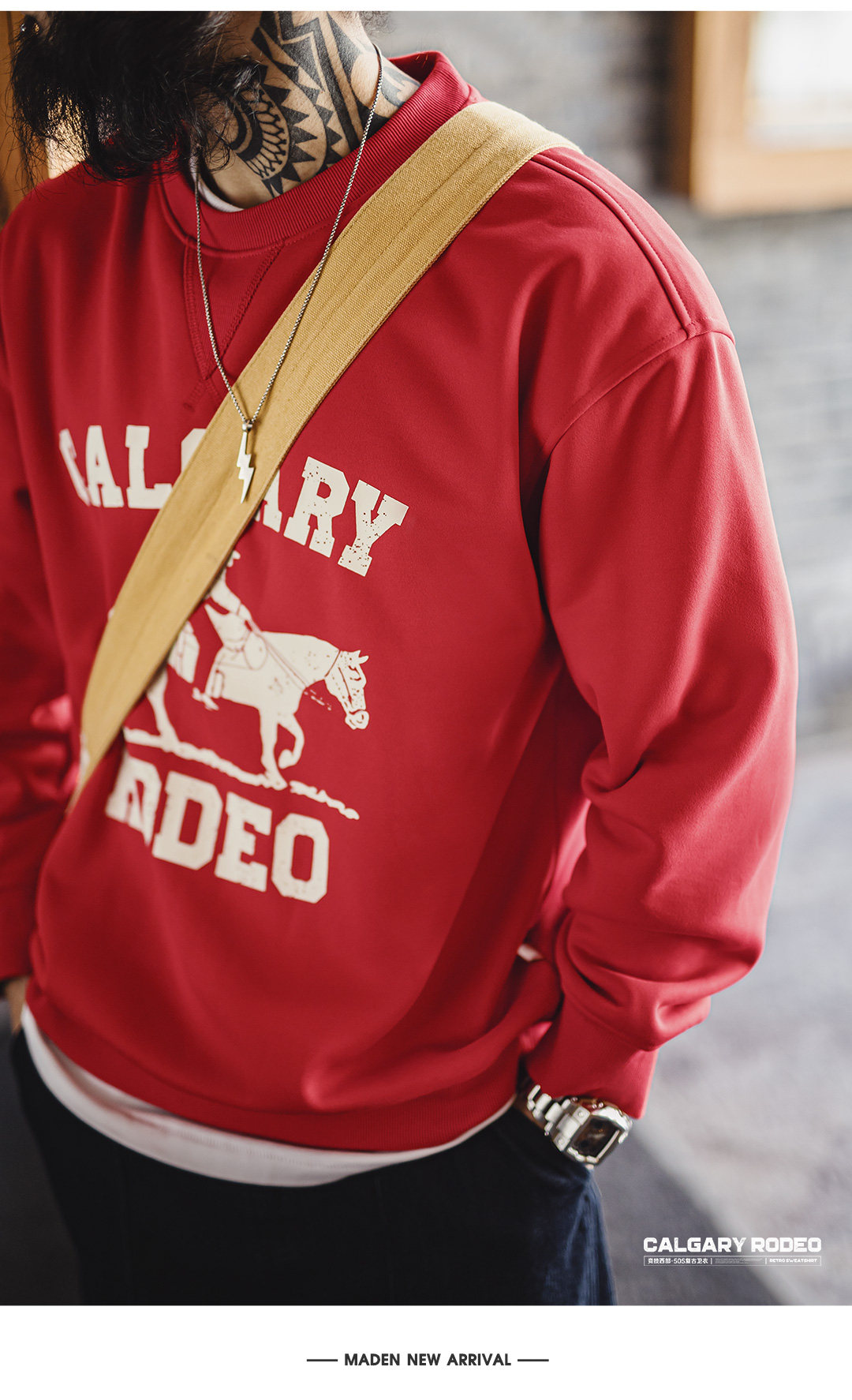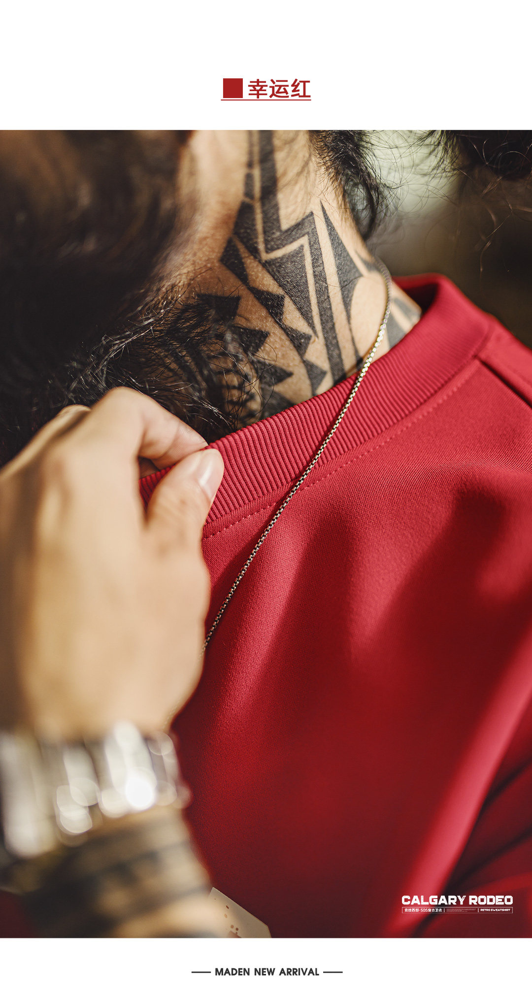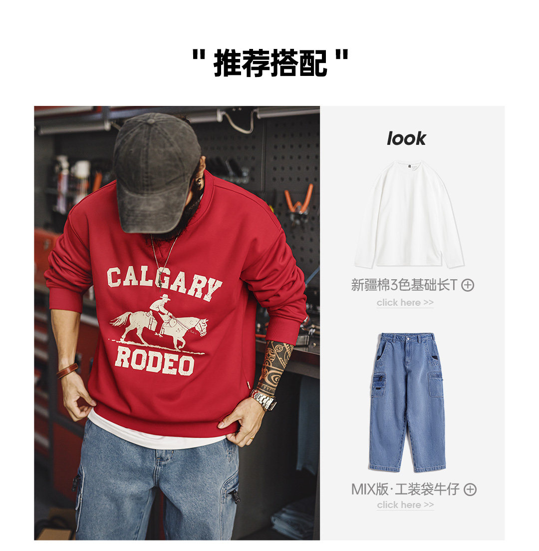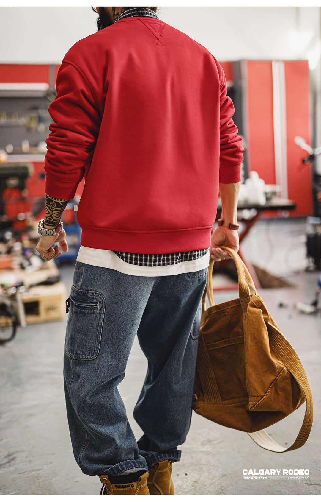 马登工装美式马年限定红色卫衣加绒印花保暖圆领加厚套头外套男春