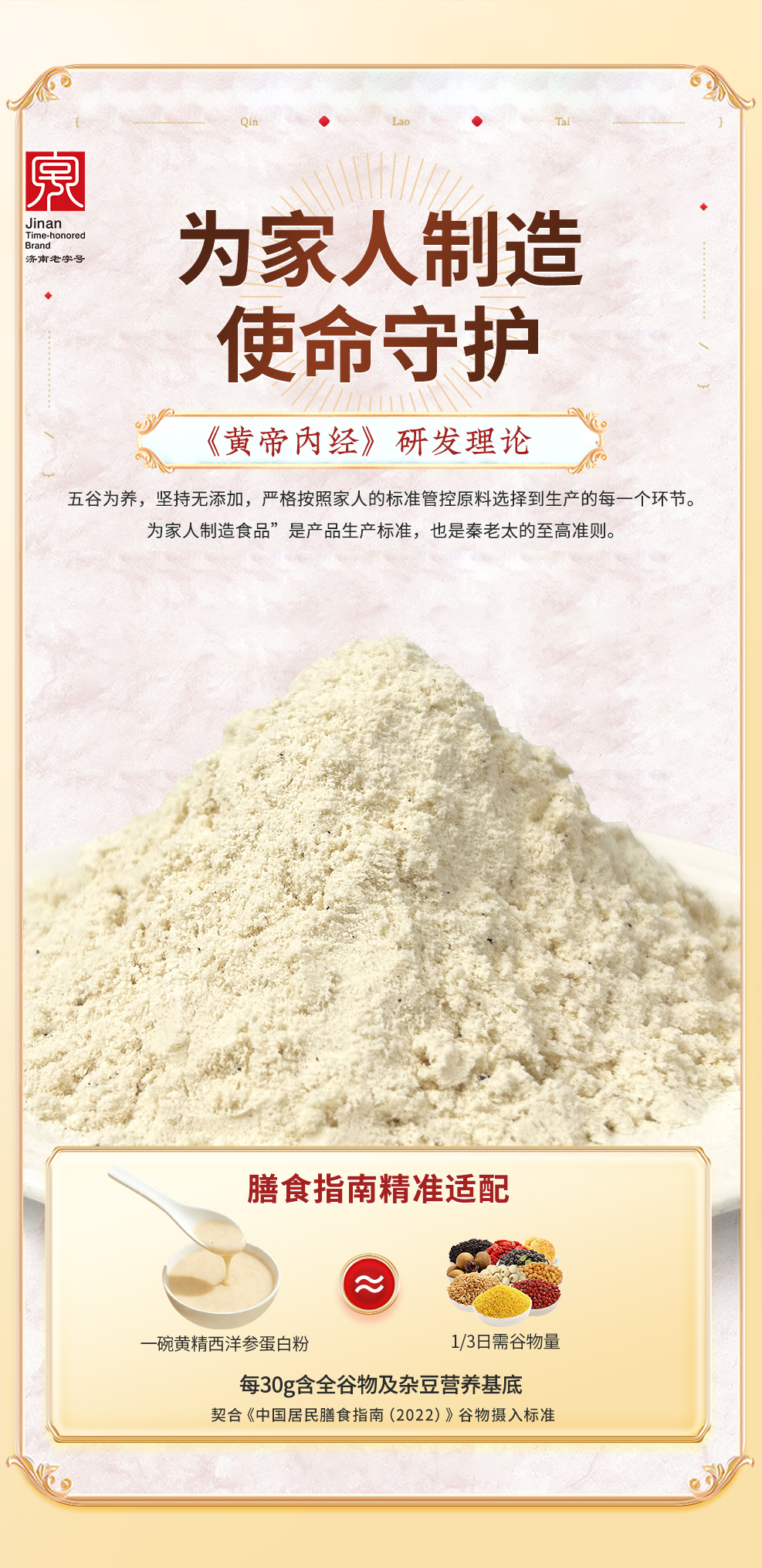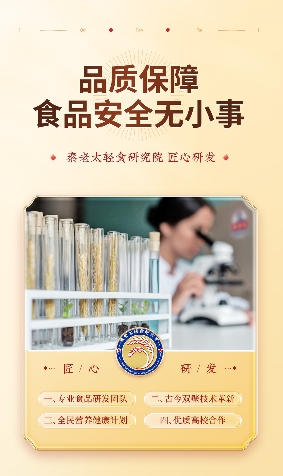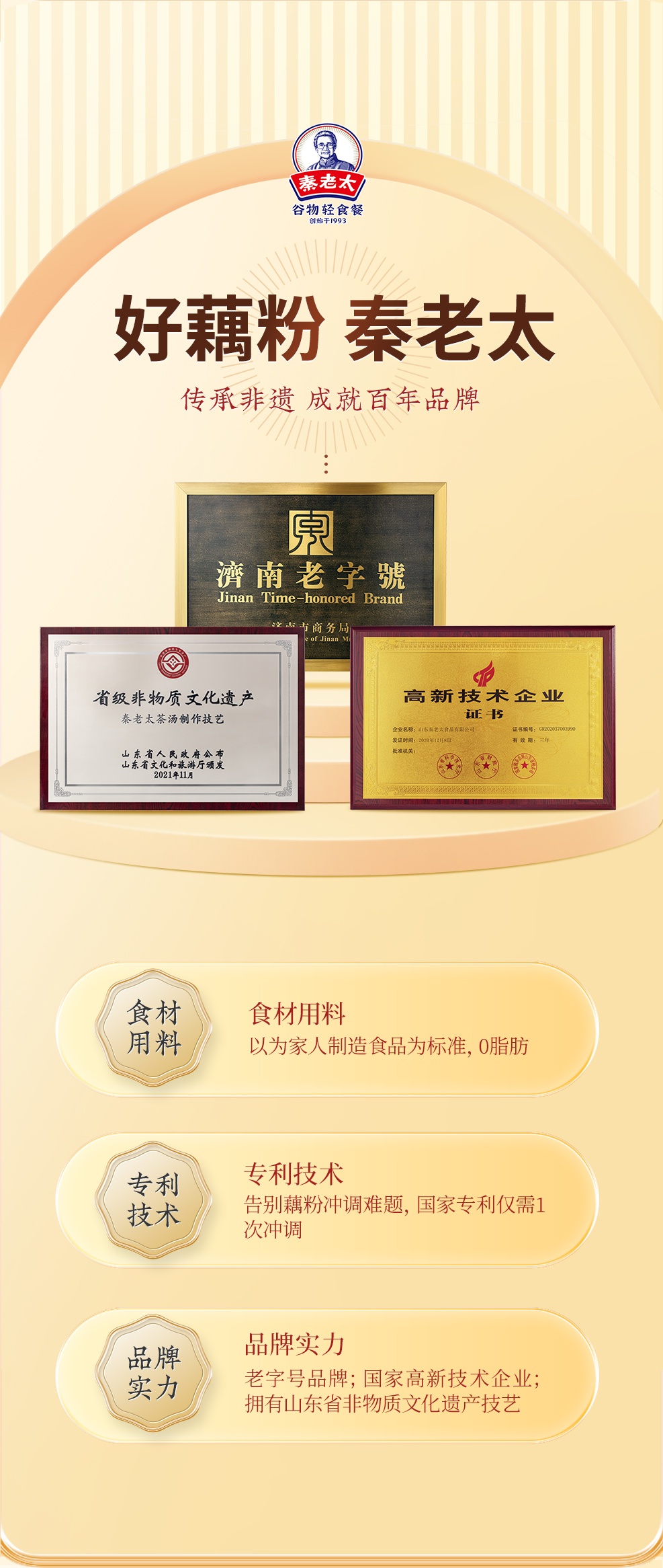 - 秦老太创始于1993年,专注谷物轻食餐。秦老太茶汤,2012年被正式授予非物质文化遗产。进入新时代,秦老太人怀揣匠心精神,以 “为家人制造食品”为理念,传承中华食养文化!