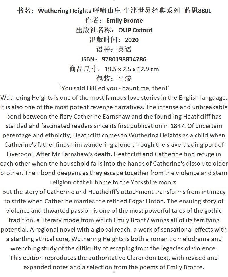 呼啸山庄 英文原版 Wuthering Heights 牛津世界经典系列 经典小说 英文版 进口英语书籍