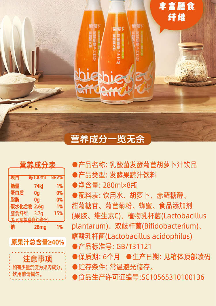 南达乳酸菌发酵菊苣胡萝卜汁 280ml(8瓶/箱)