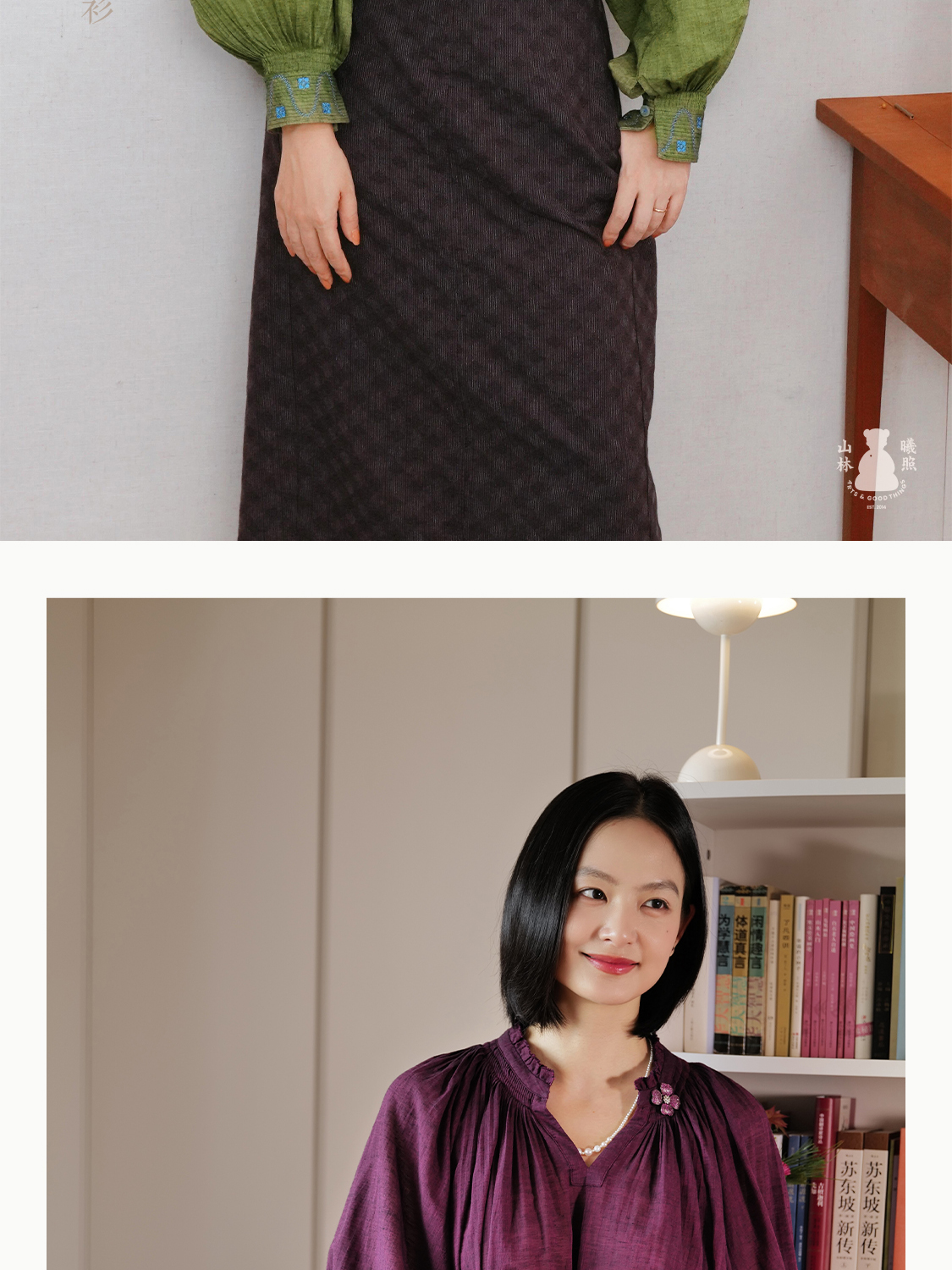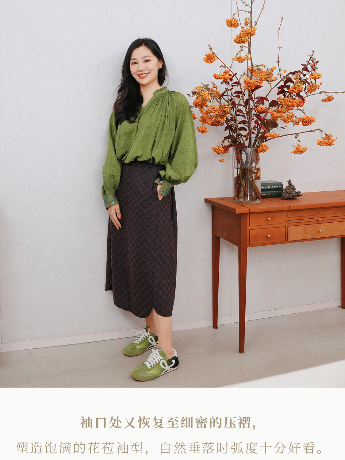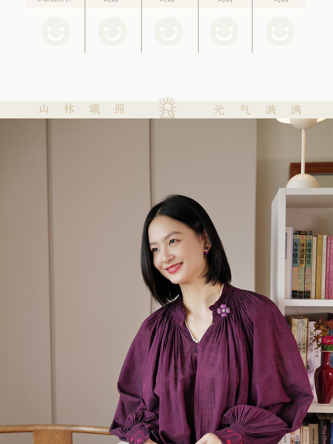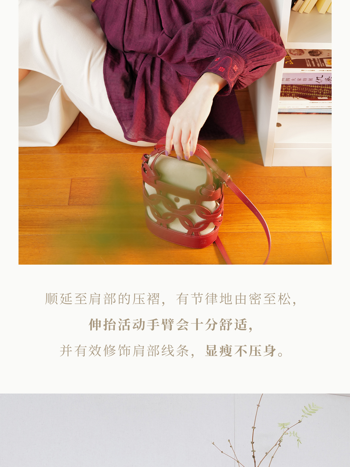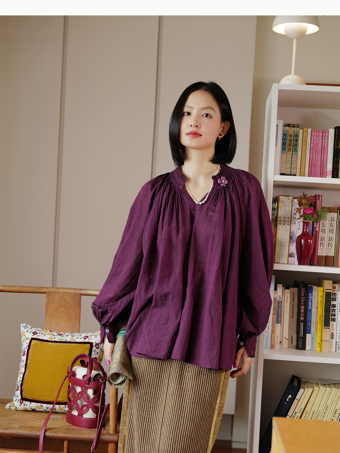唐草云裥 印度手织布 小V撒花开领褶裥优雅早秋短衫 山林曦照