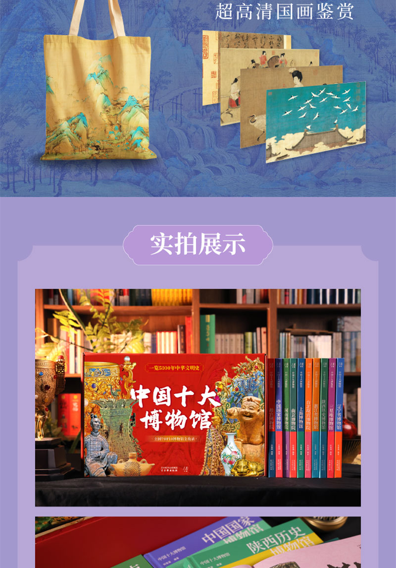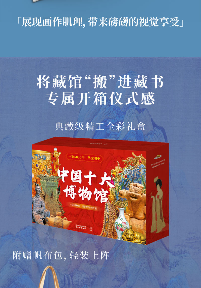 《中国十大博物馆》(全10册)全国TOP级博物馆全收录,赠礼1: 「超能装的“花间”行囊帆布包」1枚,赠礼2: 超高清国画鉴赏海报4幅,