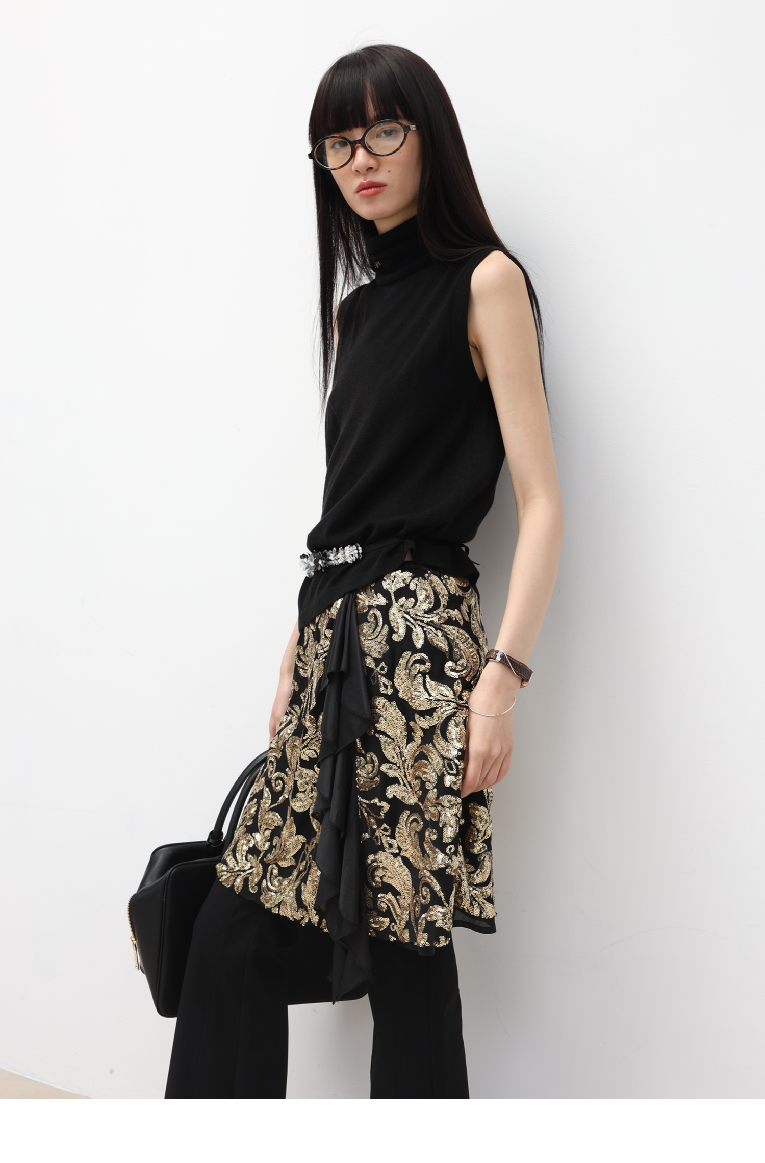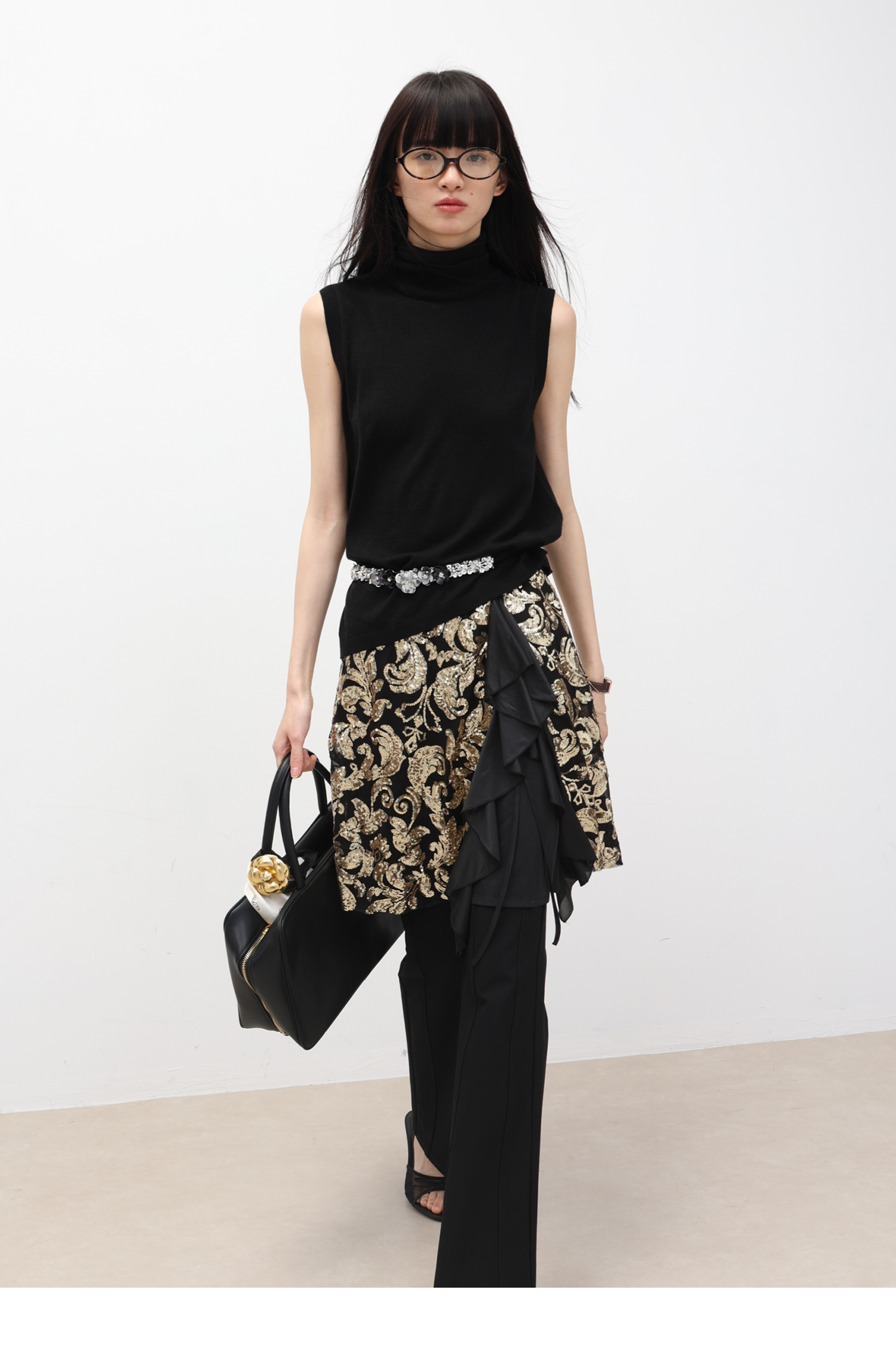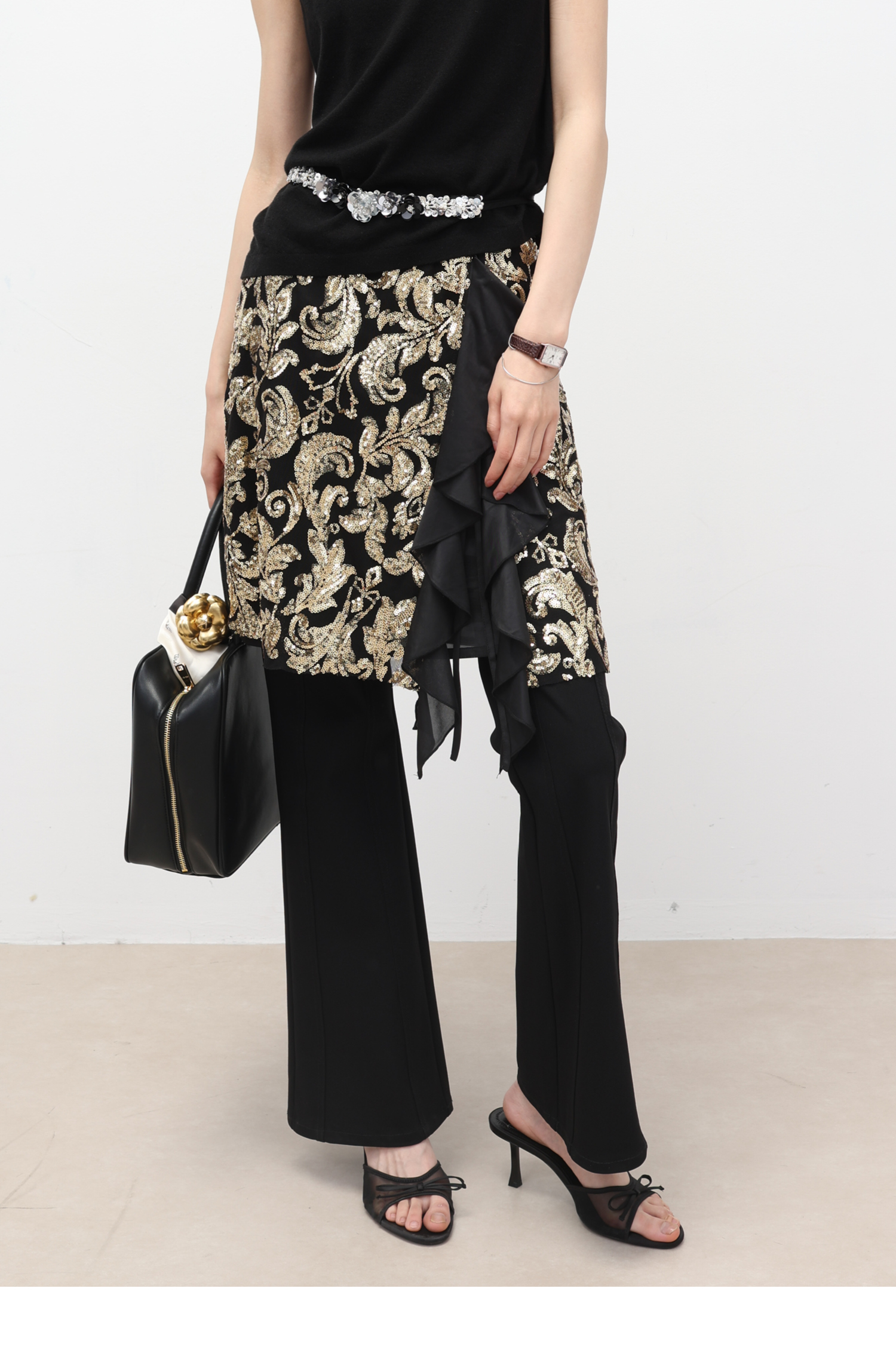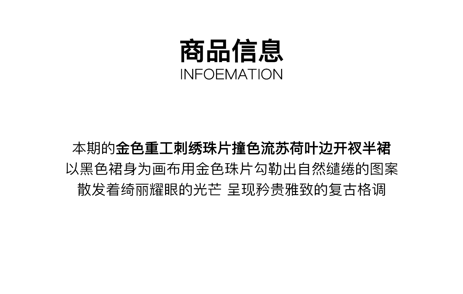 【199/2件自选福袋不退换】金色重工刺绣珠片撞色流苏荷叶边开衩半裙