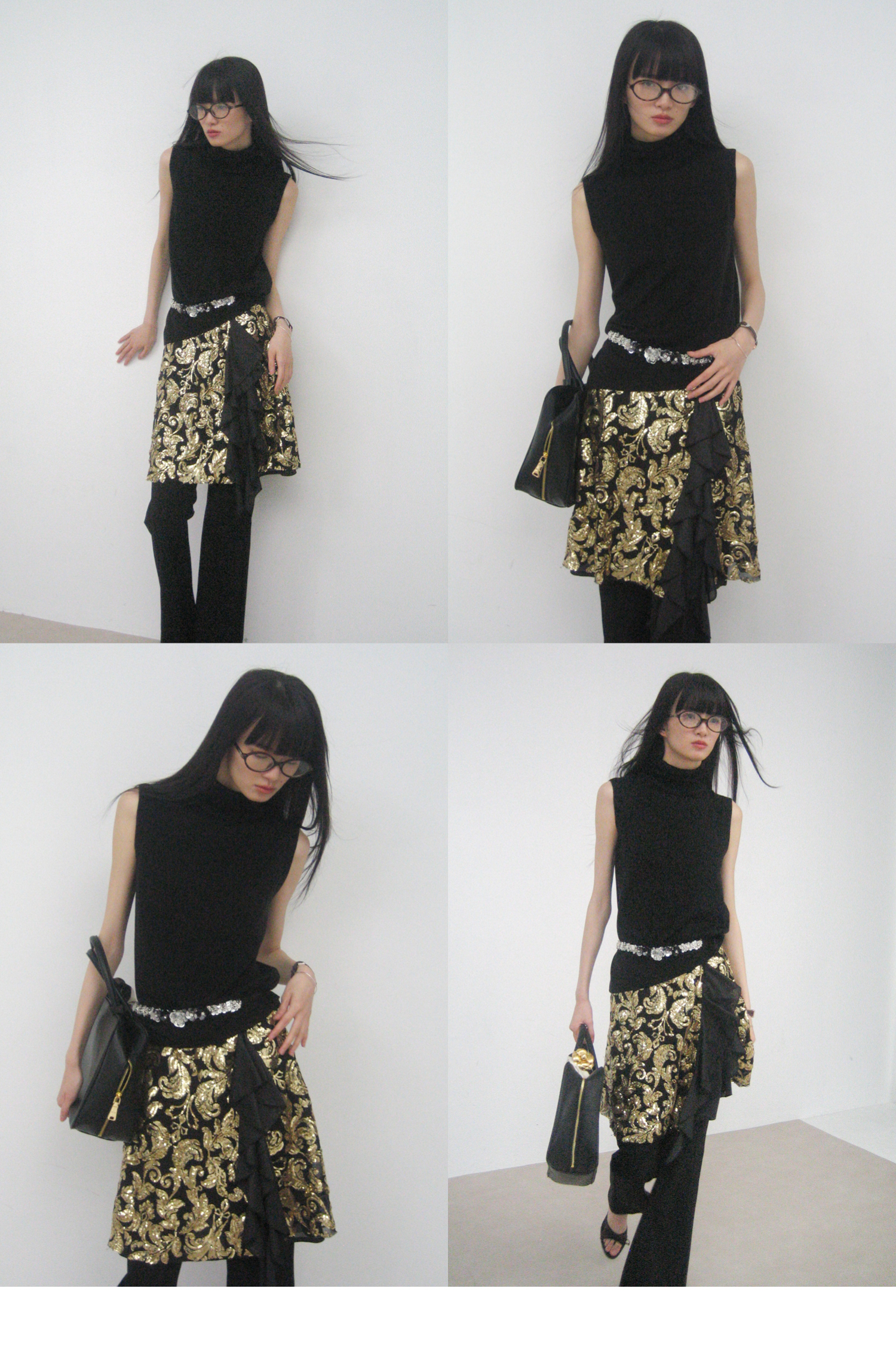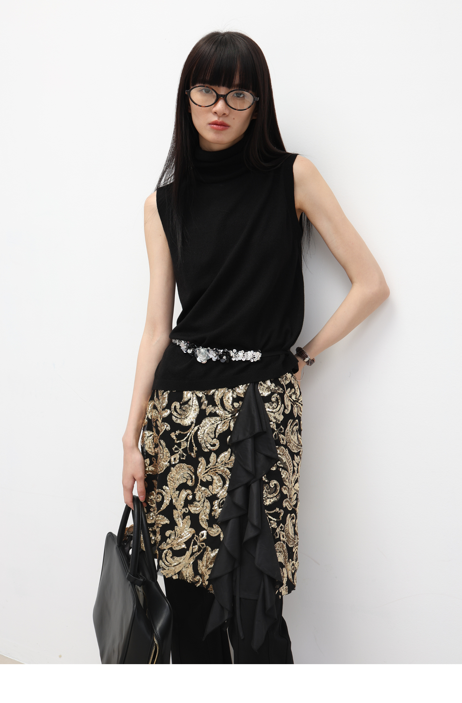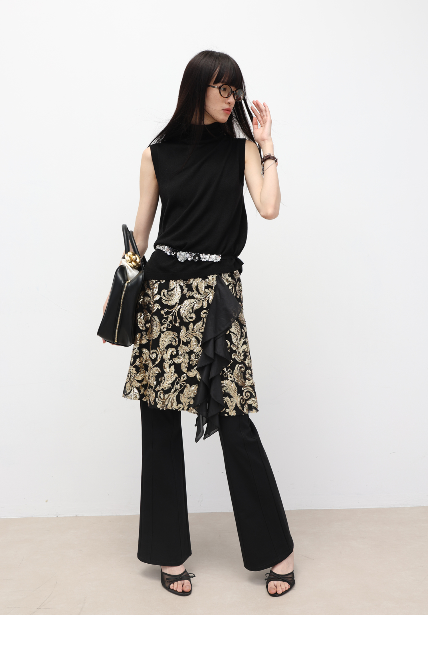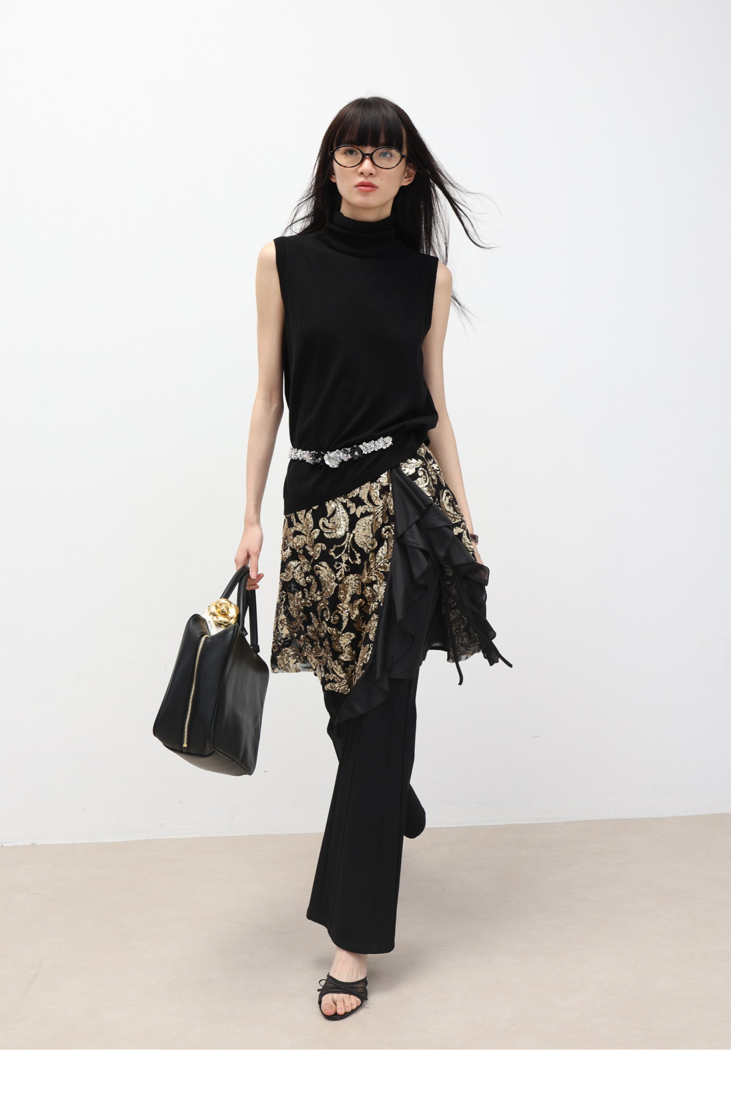 【199/2件自选福袋不退换】金色重工刺绣珠片撞色流苏荷叶边开衩半裙