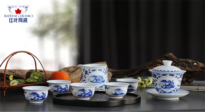 景德镇陶瓷 国瓷红叶 8头玲珑功夫茶具开堂山水盖碗