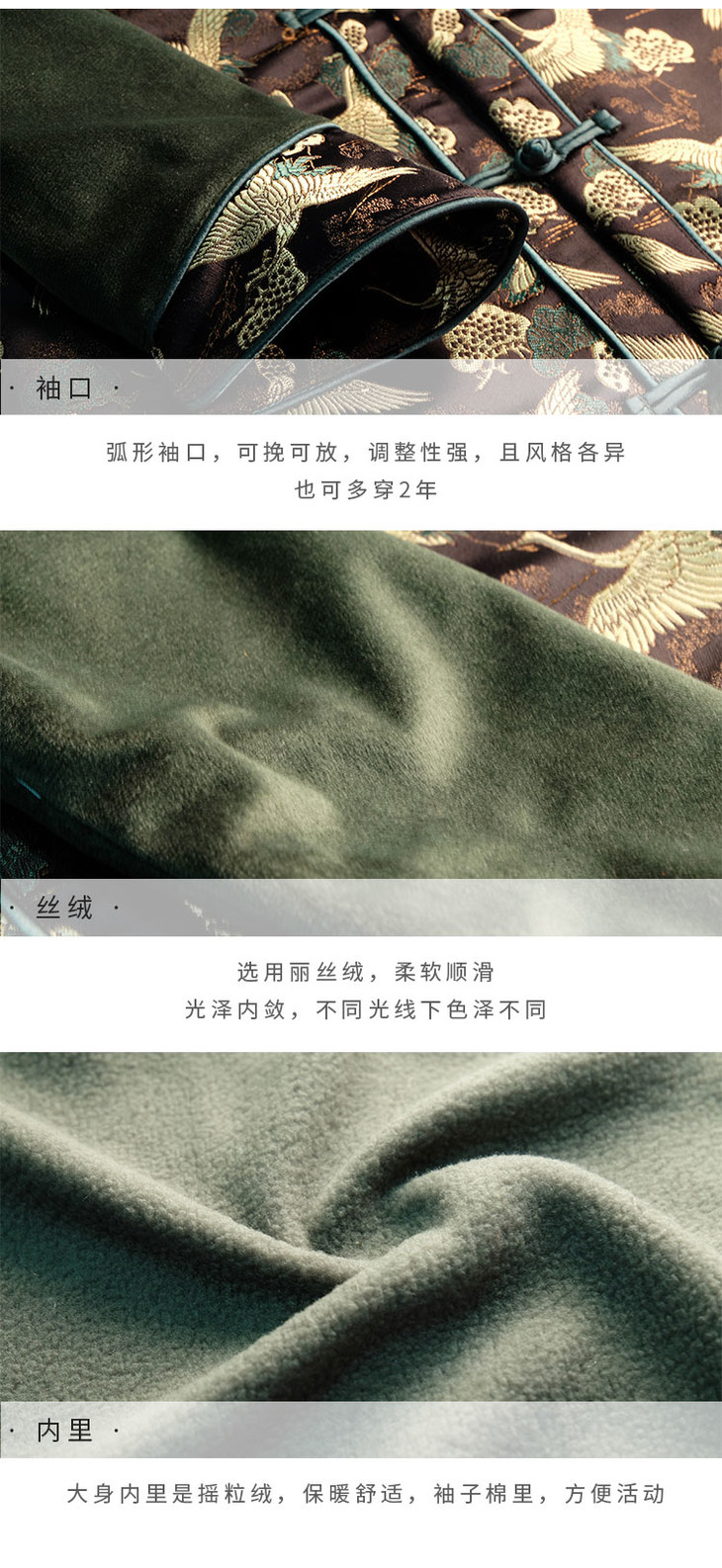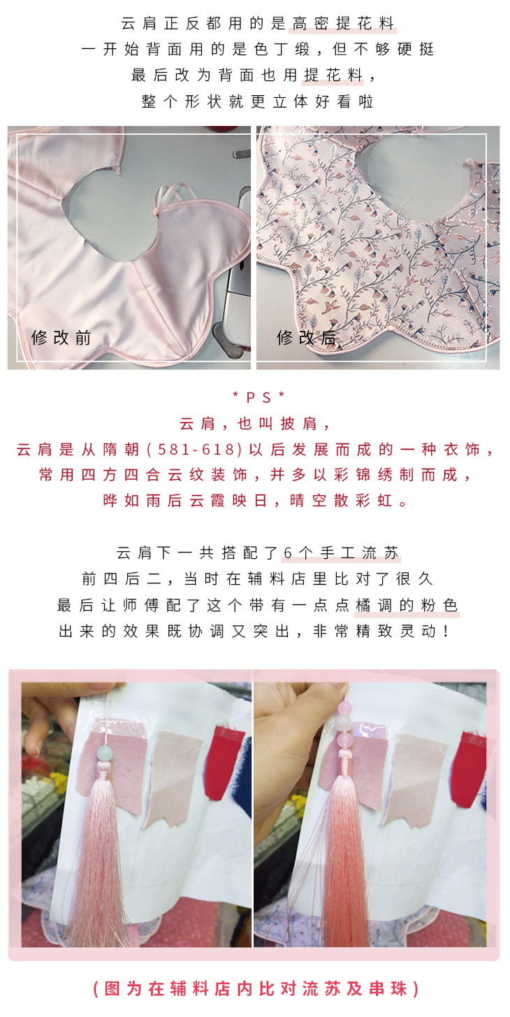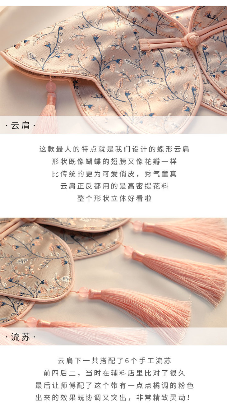 温馨提示:因丝绒易反光,拍摄容易产生色差,玉缨实物颜色比详情要深;闲云大身的面料颜色为银亮色,更加贵气;红色面料已固色,但仍会脱一点色,洗涤时勿久泡即可,所有面料均用到提花缎面,提花缎面由丝制成,较为娇贵,试穿以及平时穿着时避免被尖锐物品勾到,如摩擦起丝,用剪刀小心修剪即可,洗涤时尽量手洗,避免机洗损坏面料。