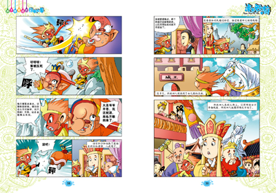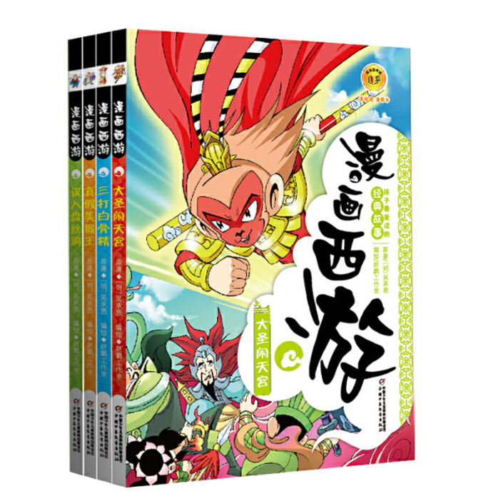 《漫画西游》精选《西游记》中为大家耳熟能详的精彩故事,通过漫画这一活泼、幽默的形式展现出来。故事贴近原著精髓、原汁原味,语言简洁、活泼,人物造型生动,背景立体丰富,画面色彩鲜艳、明快,能让孩子得到健康有益的名著启蒙。《漫画西游》一共4册,每册4个故事。具体故事如下:
