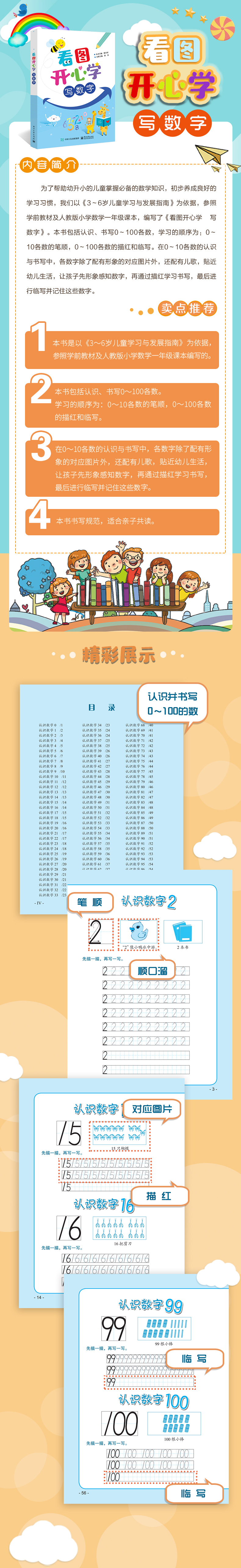为了帮助幼升小的儿童掌握必备的数学知识,初步养成良好的学习习惯,我们以《3~6岁儿童学习与发展指南》为依据,参照学前教材及人教版小学数学一年级课本,编写了《看图开心学 写数字》。本书包括认识、书写0~100各数,学习的顺序为:0~10各数的笔顺,0~100各数的描红和临写。在0~10各数的认识与书写中,各数字除了配有形象的对应图片外,还配有儿歌,贴近幼儿生活,让孩子先形象感知数字,再通过描红学习书写,*后进行临写并记住这些数字。