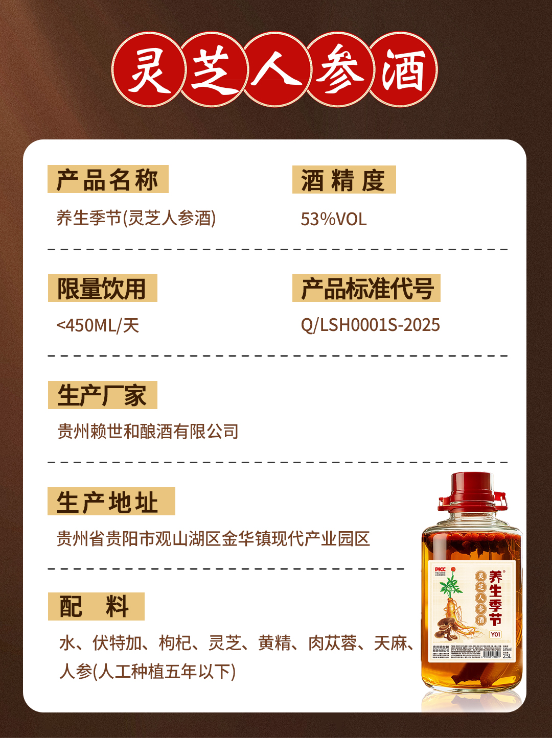 养生季节(灵芝人参酒)2.5L玻璃坛装,精美礼盒,精选灵芝 枸杞 黄精 肉苁蓉 天麻 人参6味国企原料,科学配比,充分侵泡