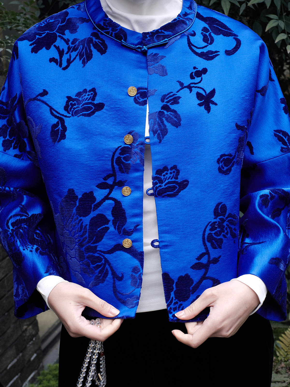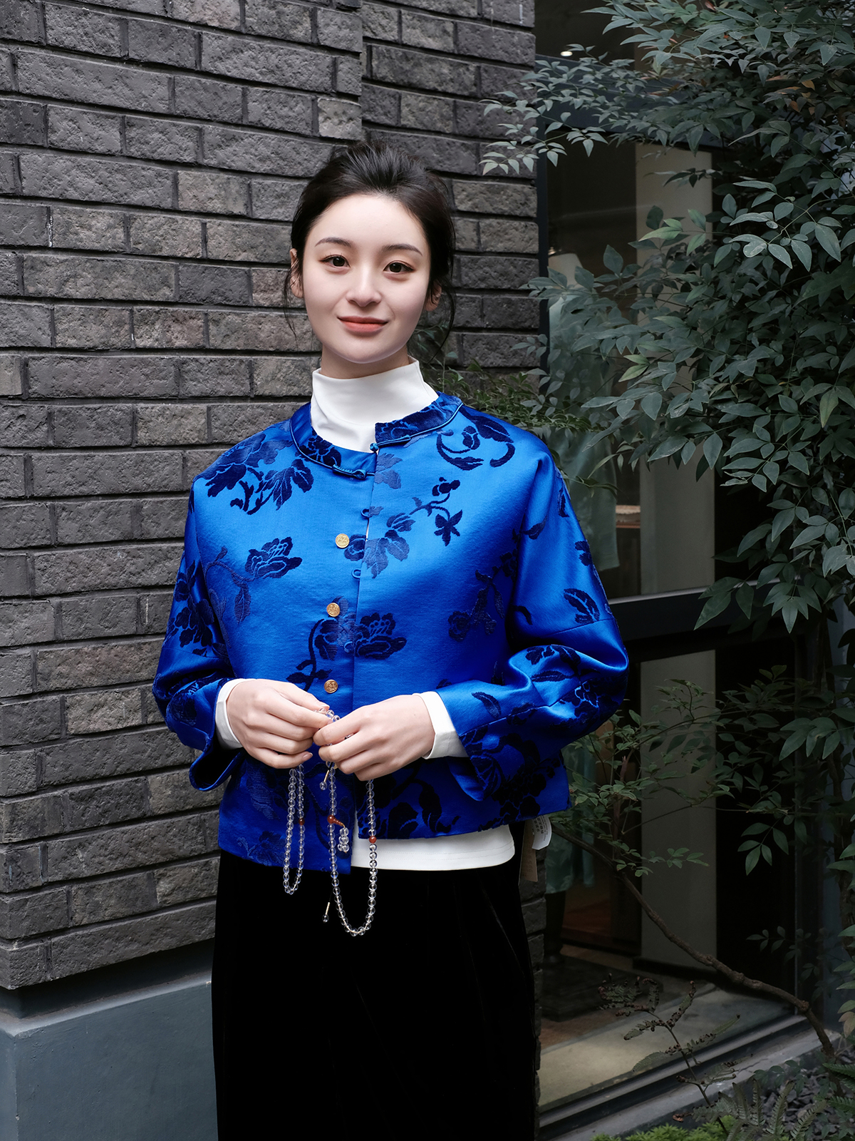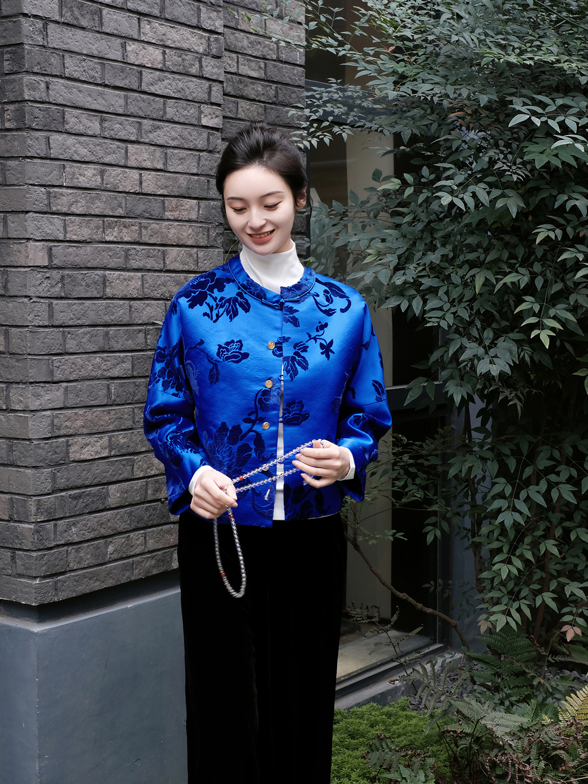 盛唐牡丹| 宝石蓝真丝漳绒圆领外套