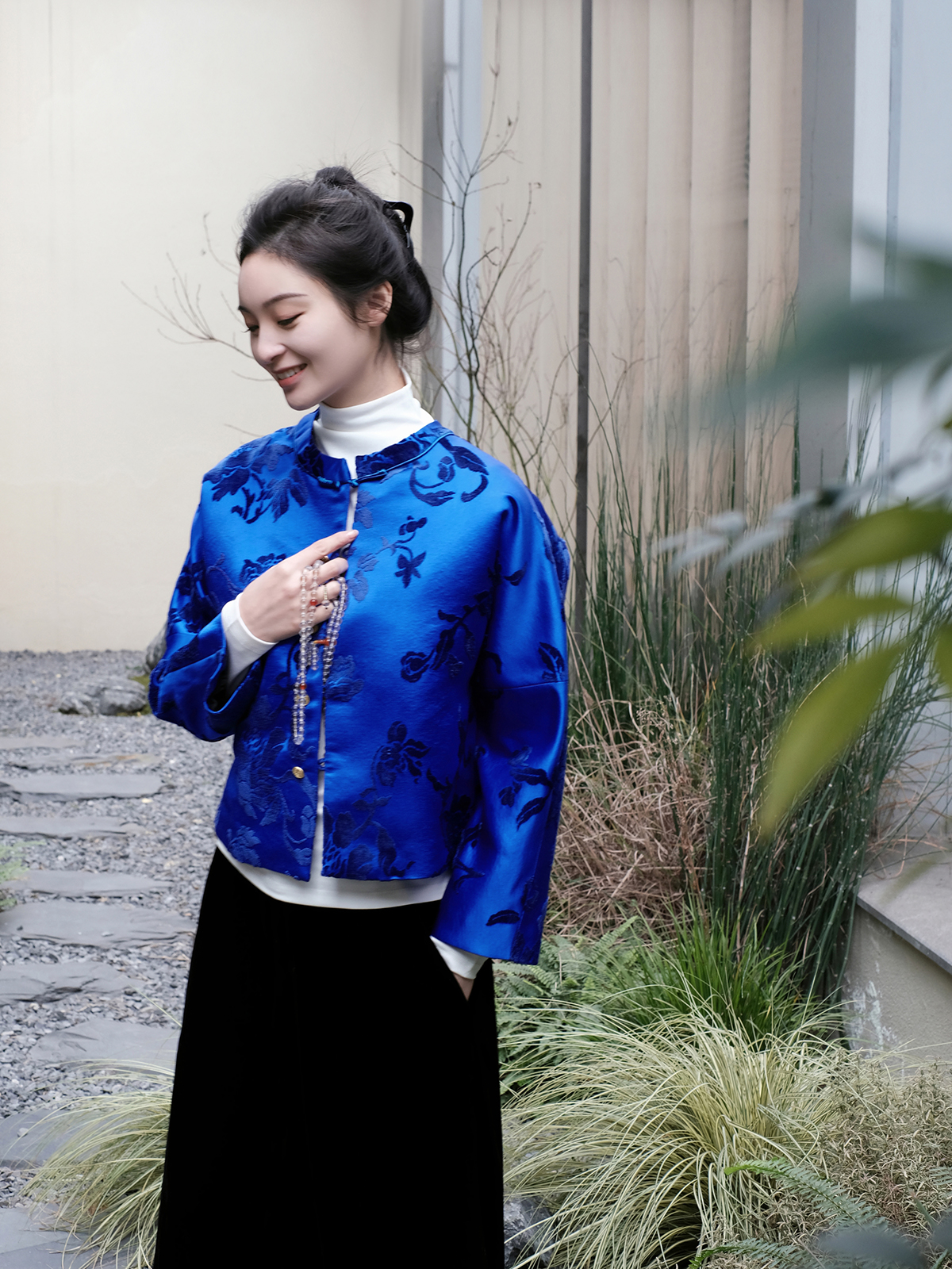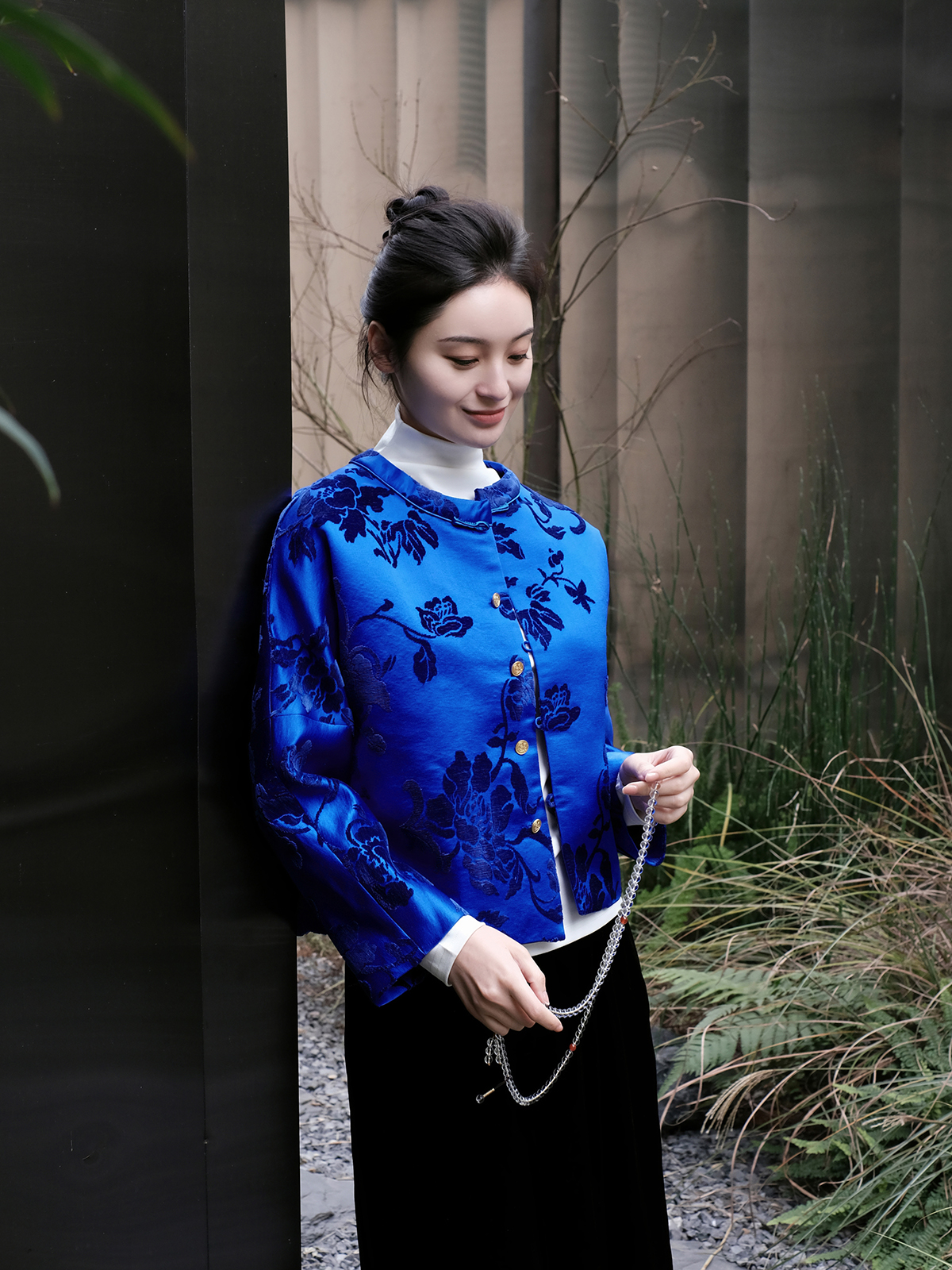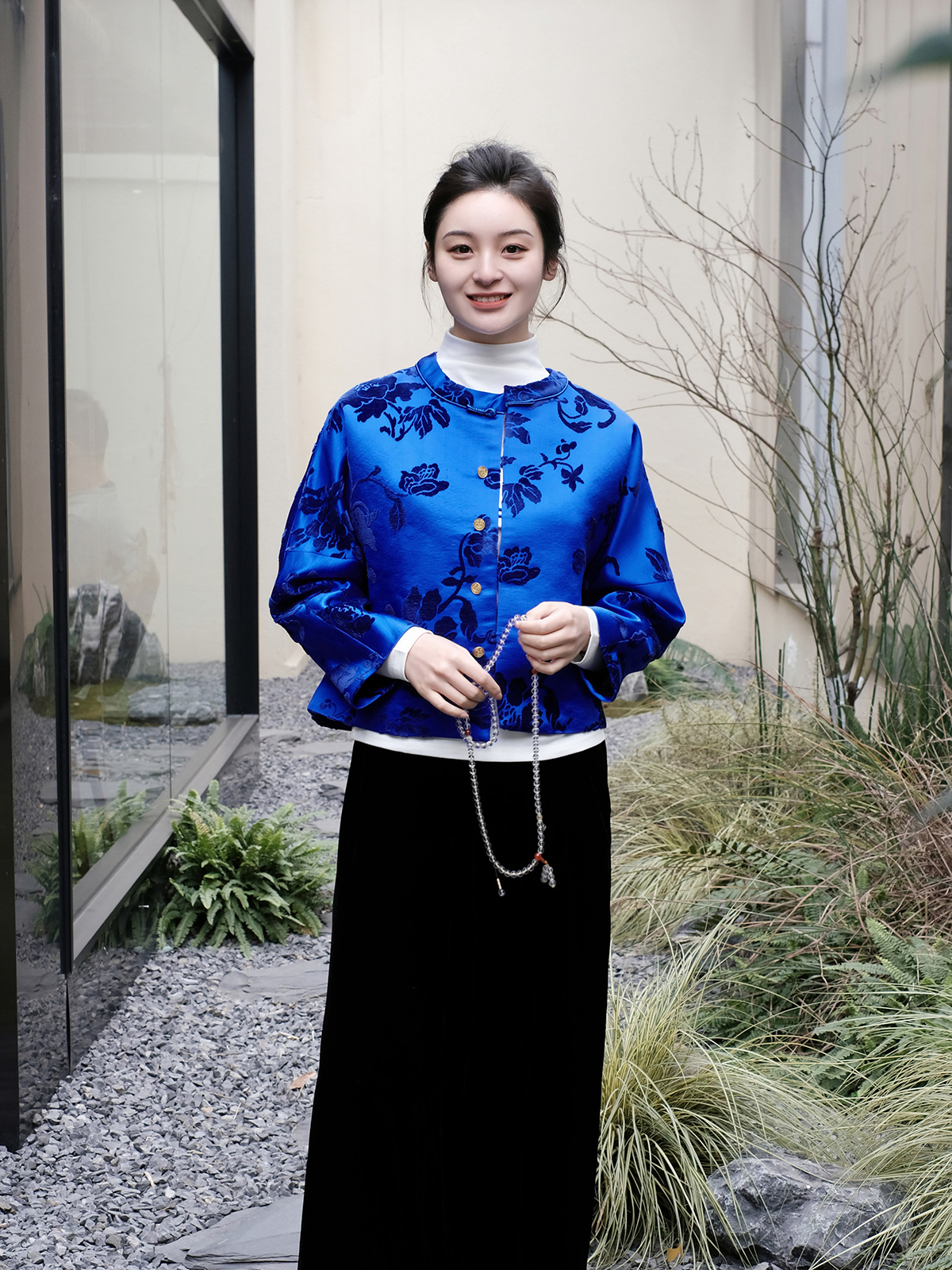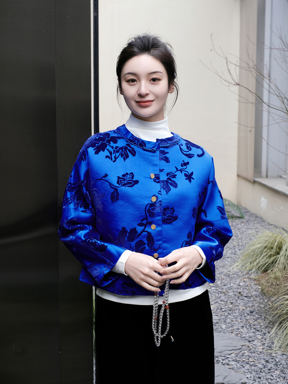 盛唐牡丹| 宝石蓝真丝漳绒圆领外套