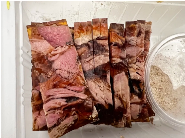 羊肉冻是规整的长方体形状,不像我们原先买的是不规则的。胶冻晶莹剔透。其中的羊肉纹理清晰,颜色暗红,都是整片的,没有碎肉渣感,也没有难闻的羊膻味。