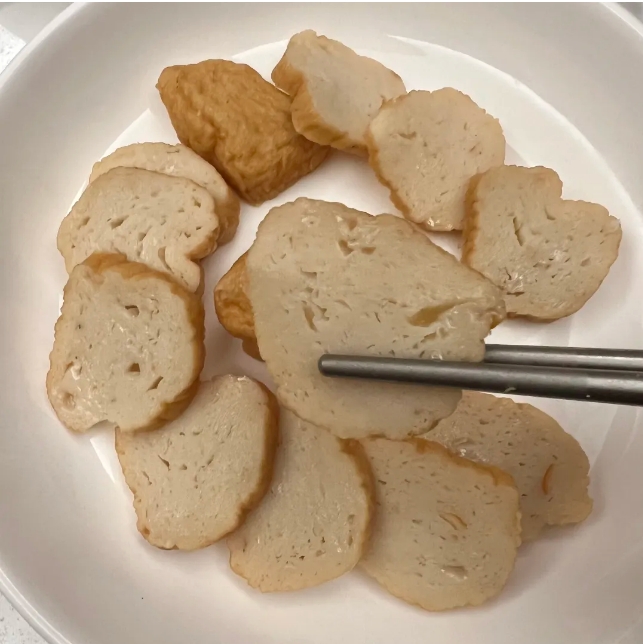 温州鱼饼能闻到鱼香味,没有腥气,加热一下就能吃。口味是微甜的,带着淡淡的鱼鲜味。嚼起来口感紧实有弹性,嫩滑细腻。