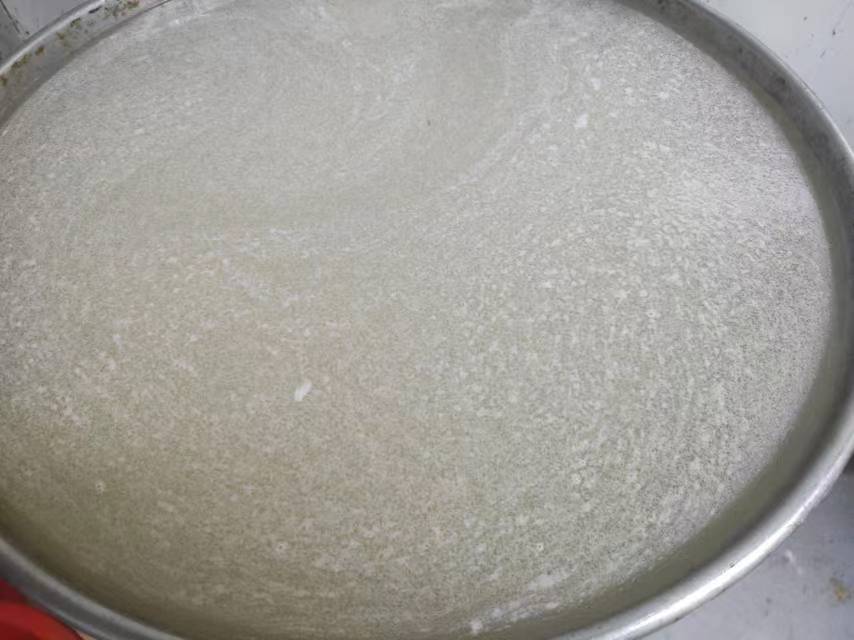 然后再用布袋滤去渣,把发酵水滤出来。发酵水中再加适当糖和盐,和面粉拌匀揉透。
