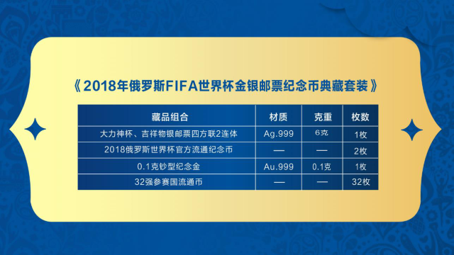 《2018年俄罗斯FIFA世界杯金银邮票纪念币典藏套装》纪念币和邮票由俄罗斯中央银行、俄罗斯邮政权威发行,本品在门店与电商渠道同步销售。