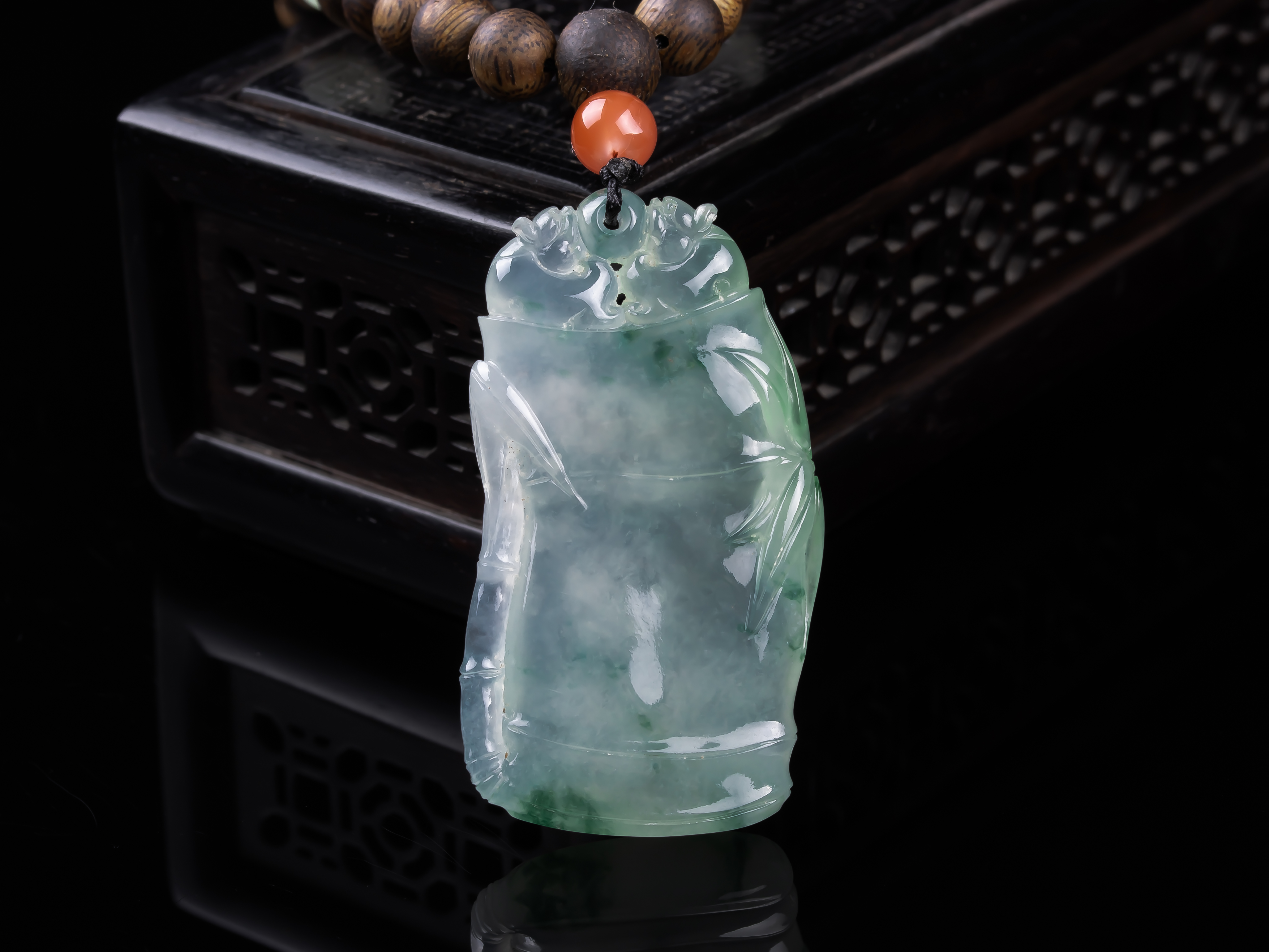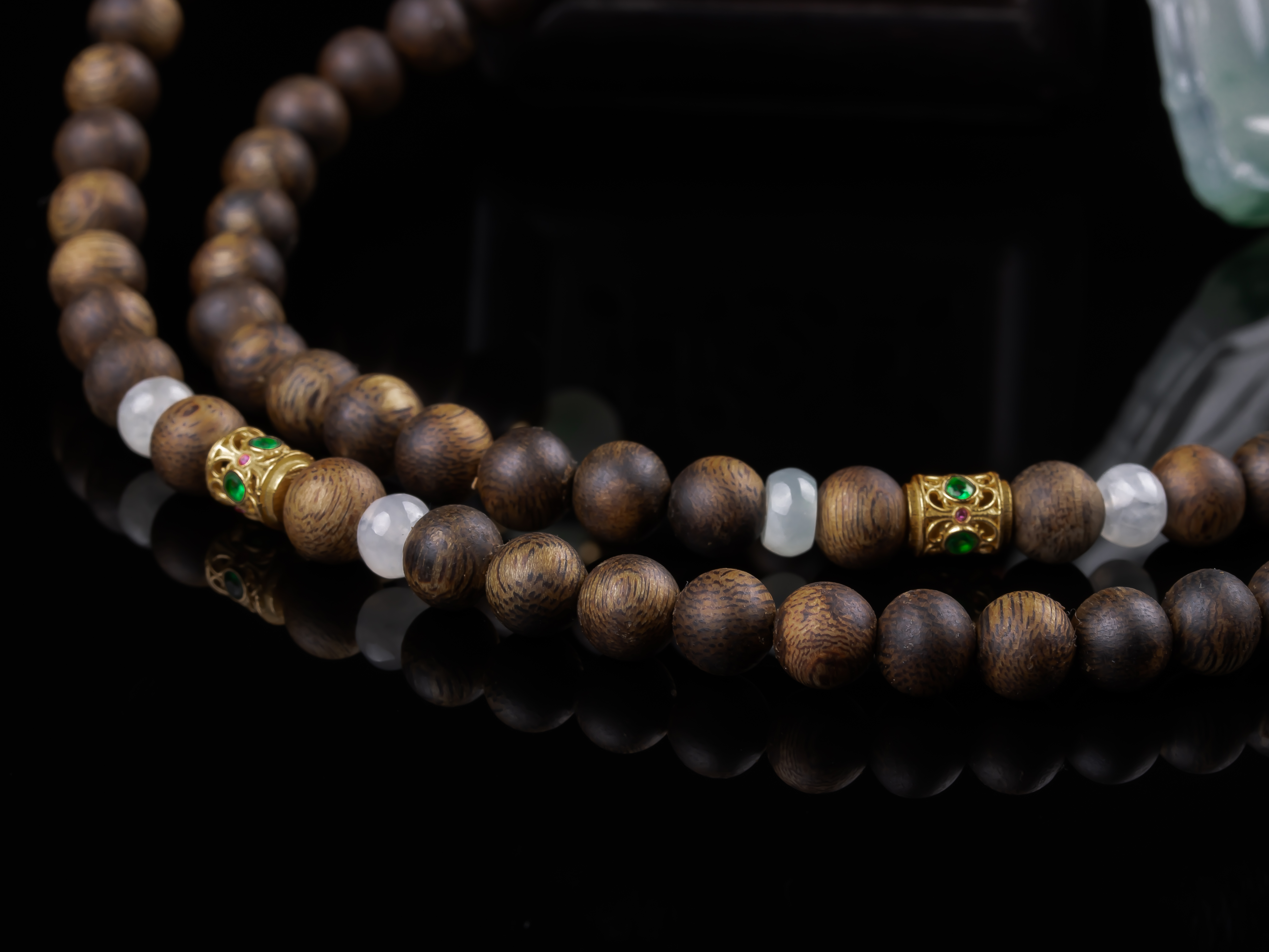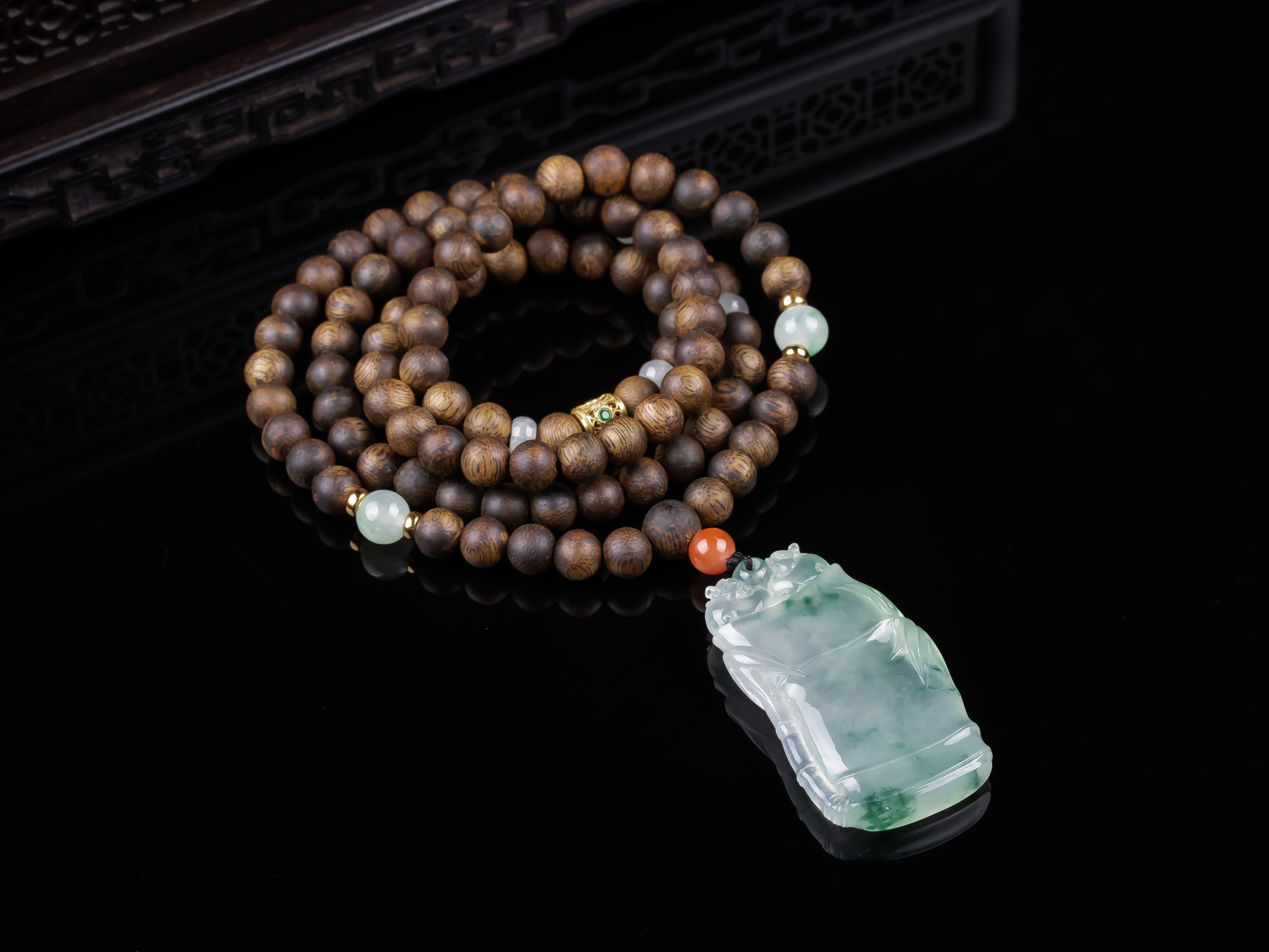 XY0289沉香+冰种翡翠竹节挂件,天然沉香约8mm,原色原味,香味自然清甜,冰种的翡翠竹节,质地冰润细腻,水头十足,飘花灵动,配珠:翡翠、南红、925银,竹节寓意事业步步高升。