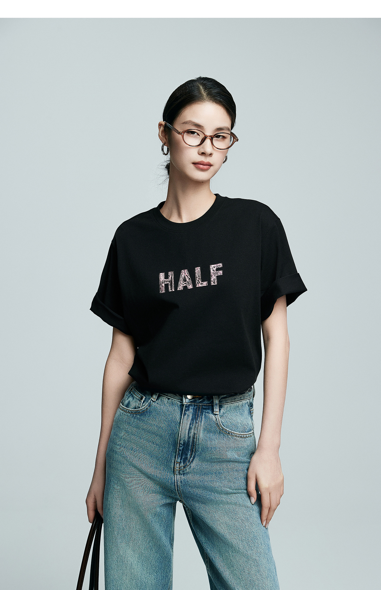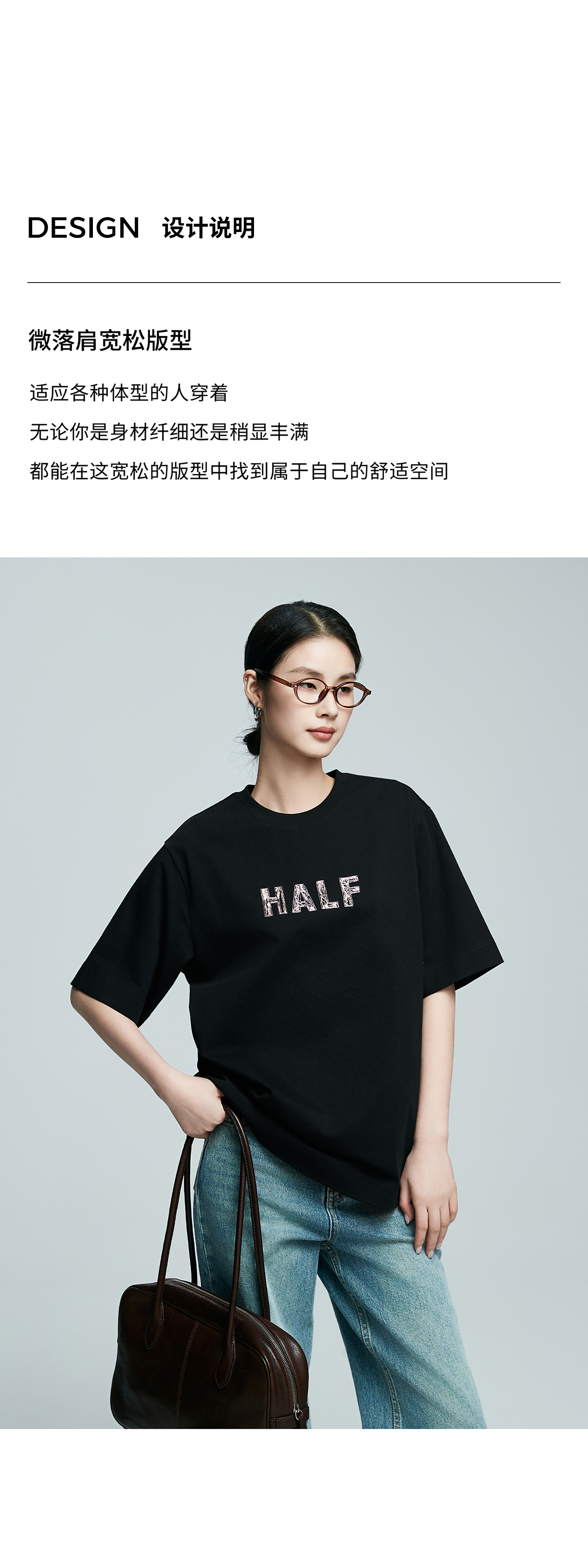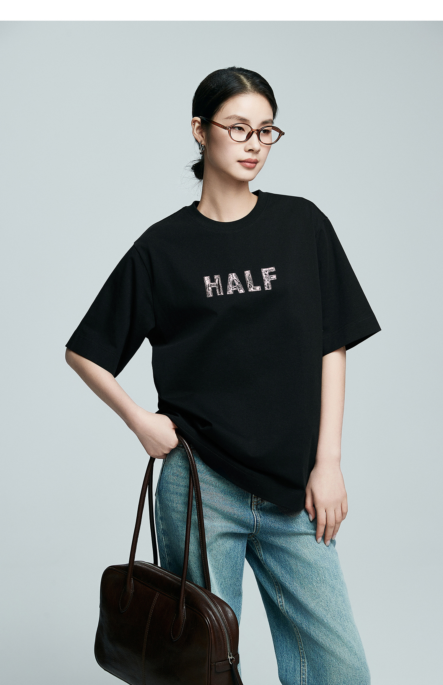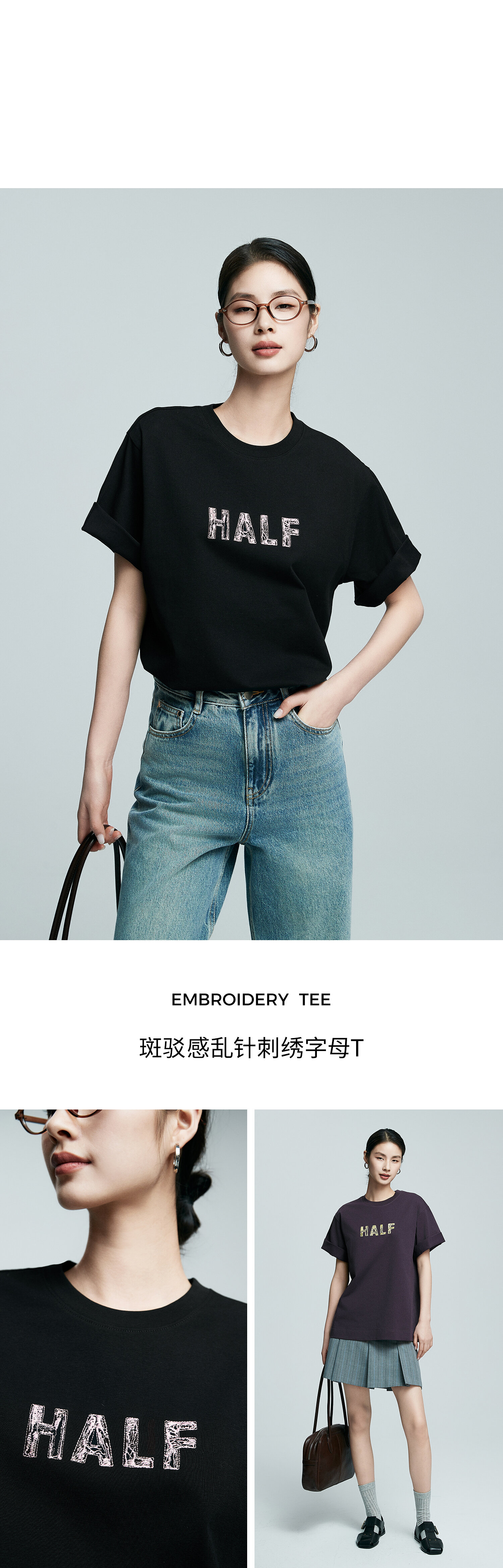 棉仓363601026-初棉斑驳乱针刺绣字母宽松版型重磅T