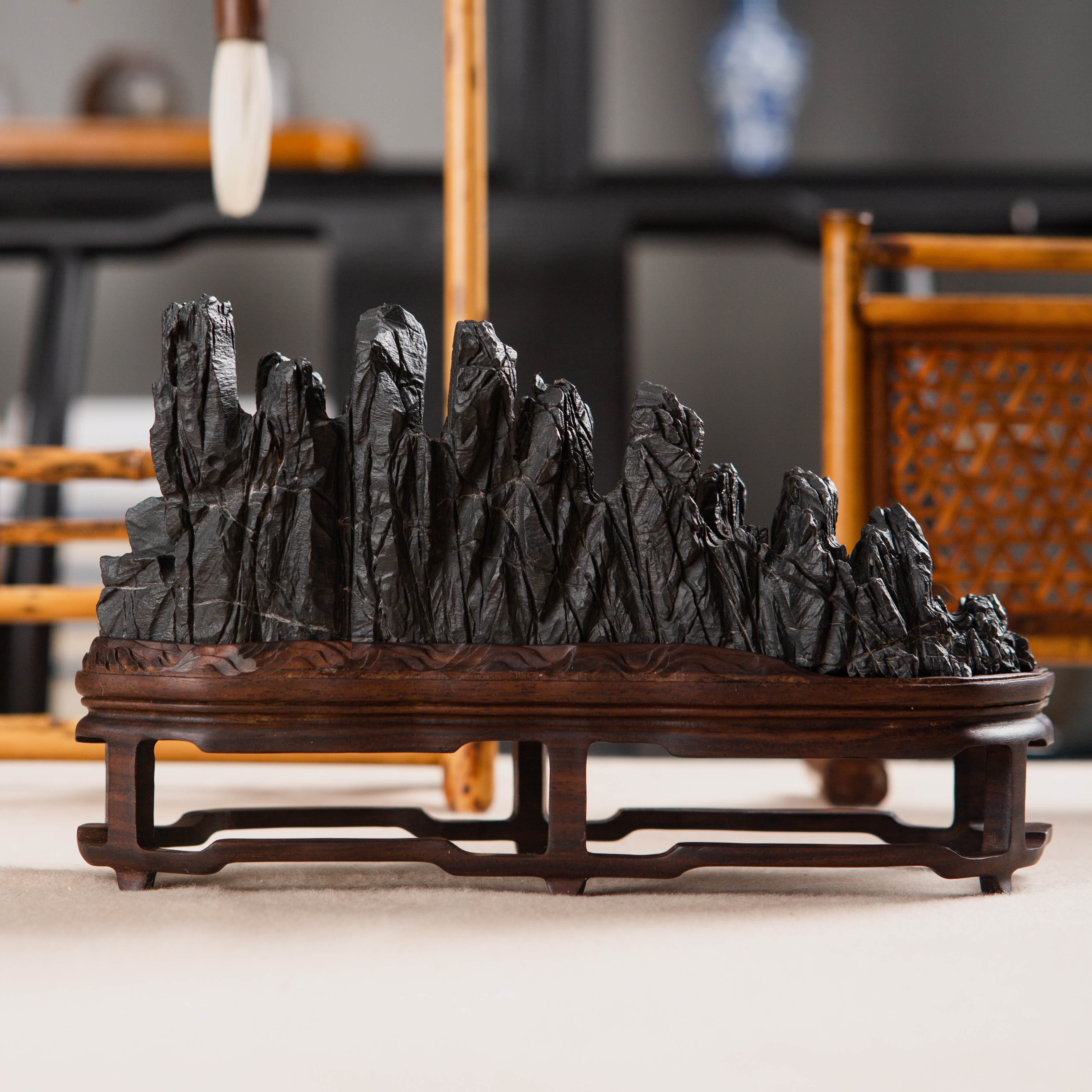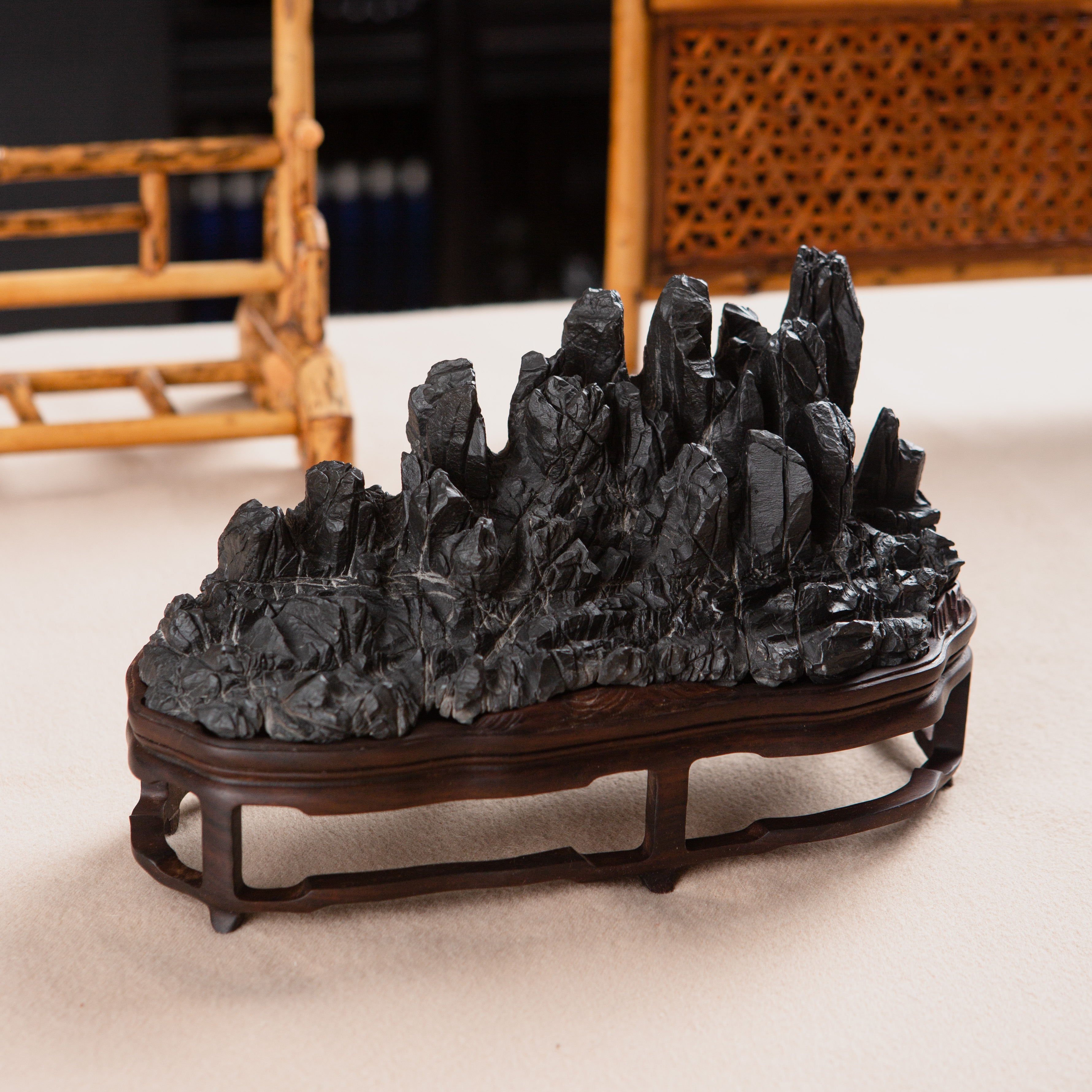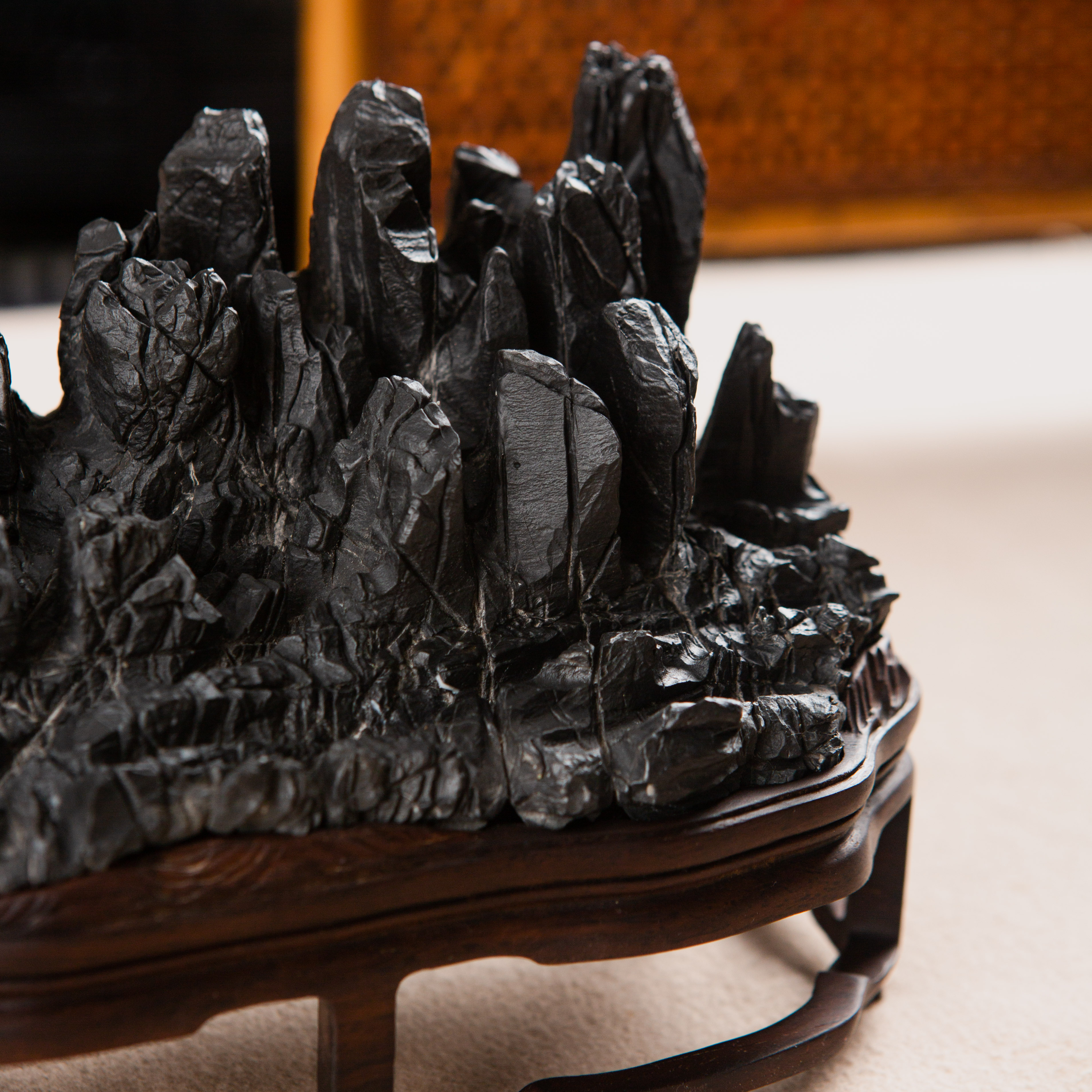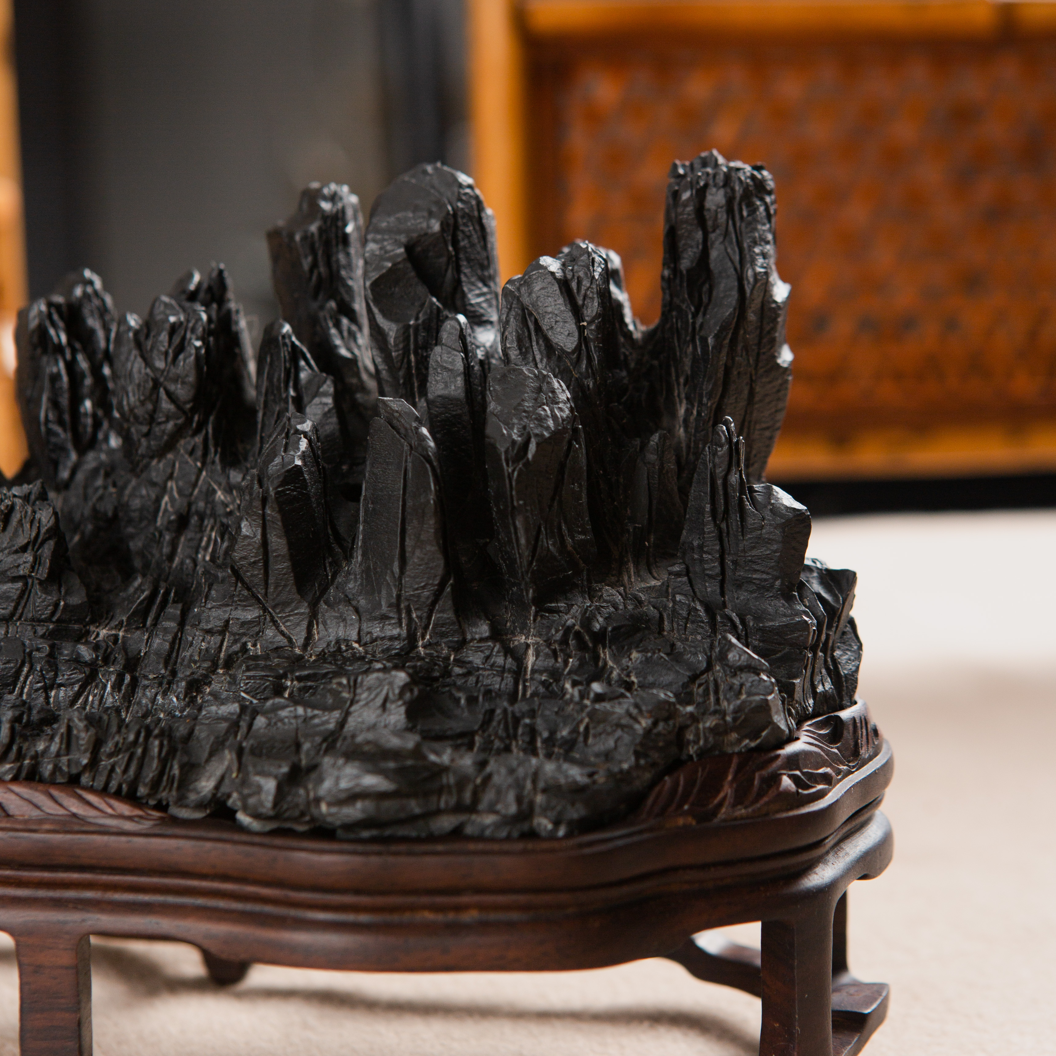 此方灵璧石林楼兰案头山子,原石原底,未经人工修饰,配苏工红木底座。其山峰错落有致,层次分明,峰回路转,有远山呼唤之感,美景汇于一石,山水汇聚,沟壑溪流一应俱全,属于移步换景的奇石景色,俨然一副意境山水,是难得一见的文房雅石,可遇而不可求。