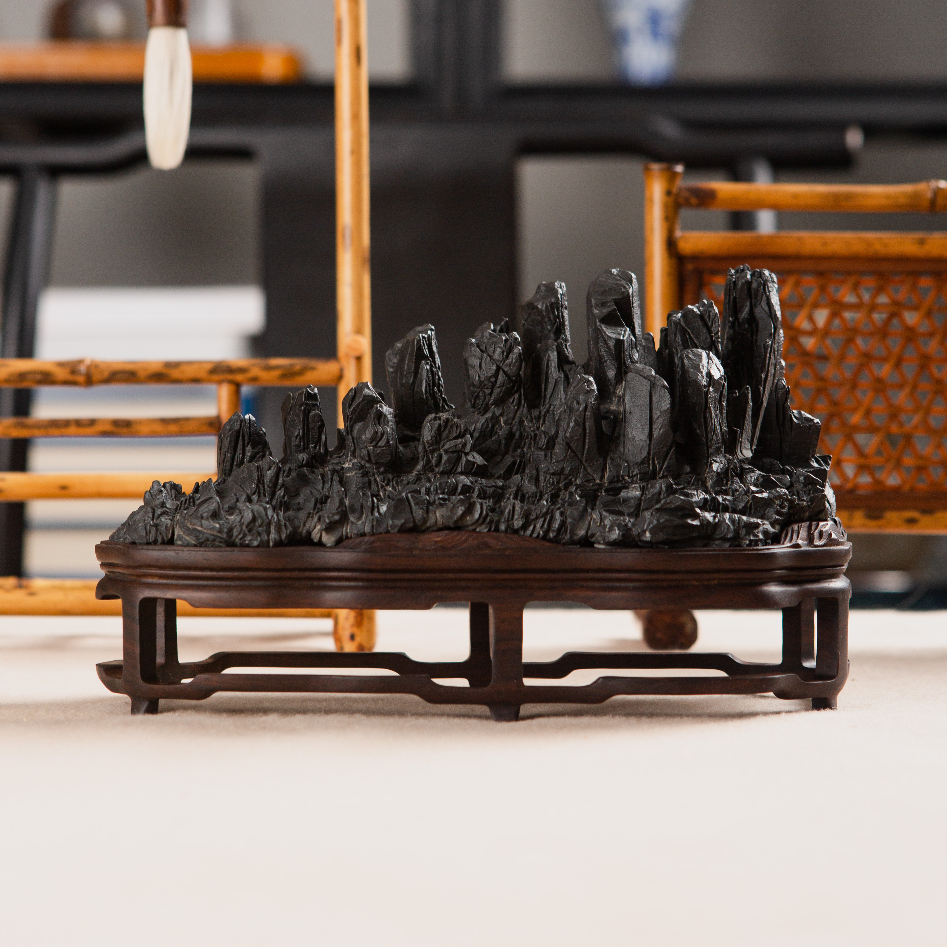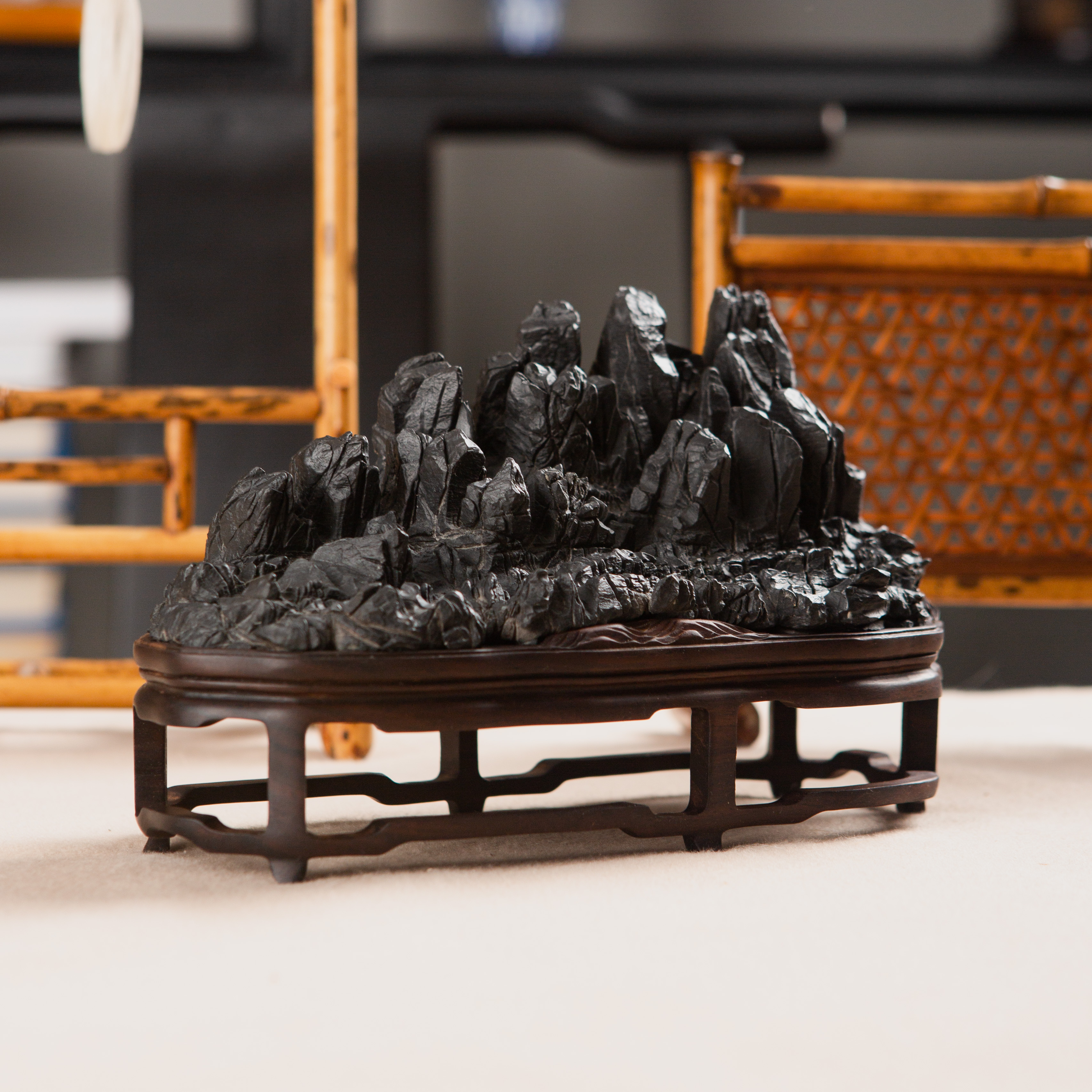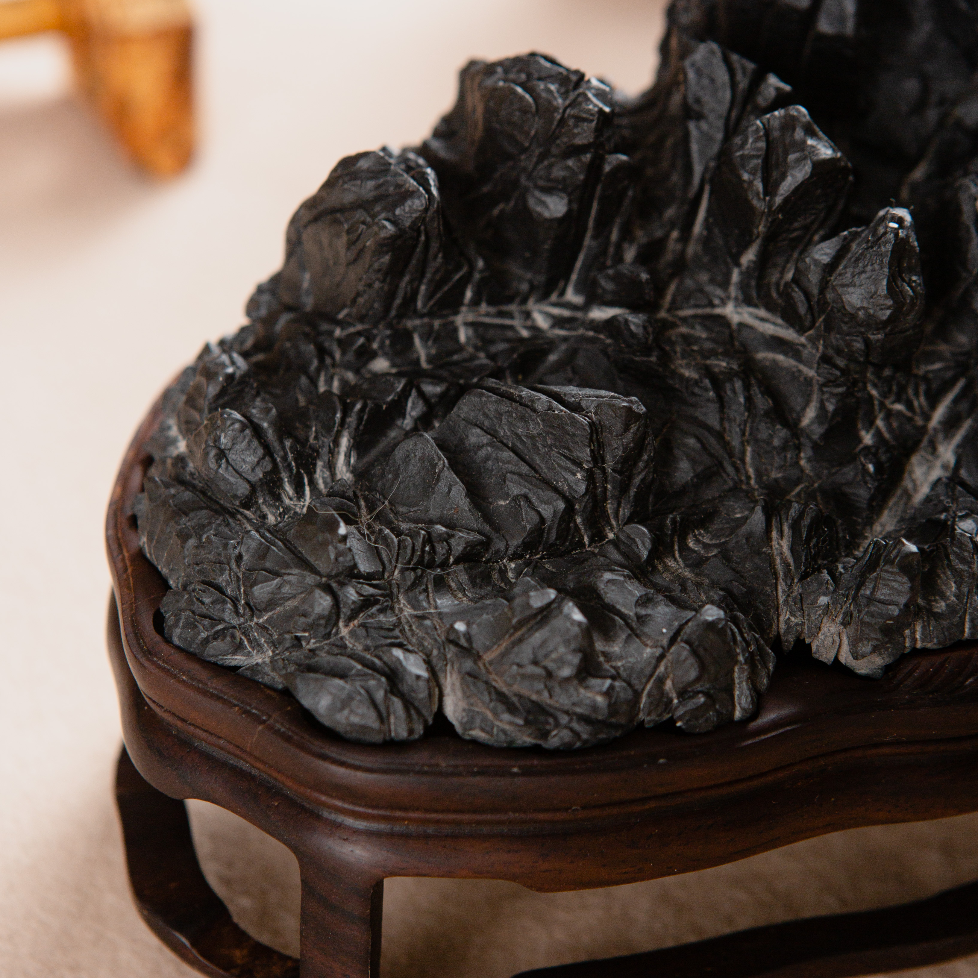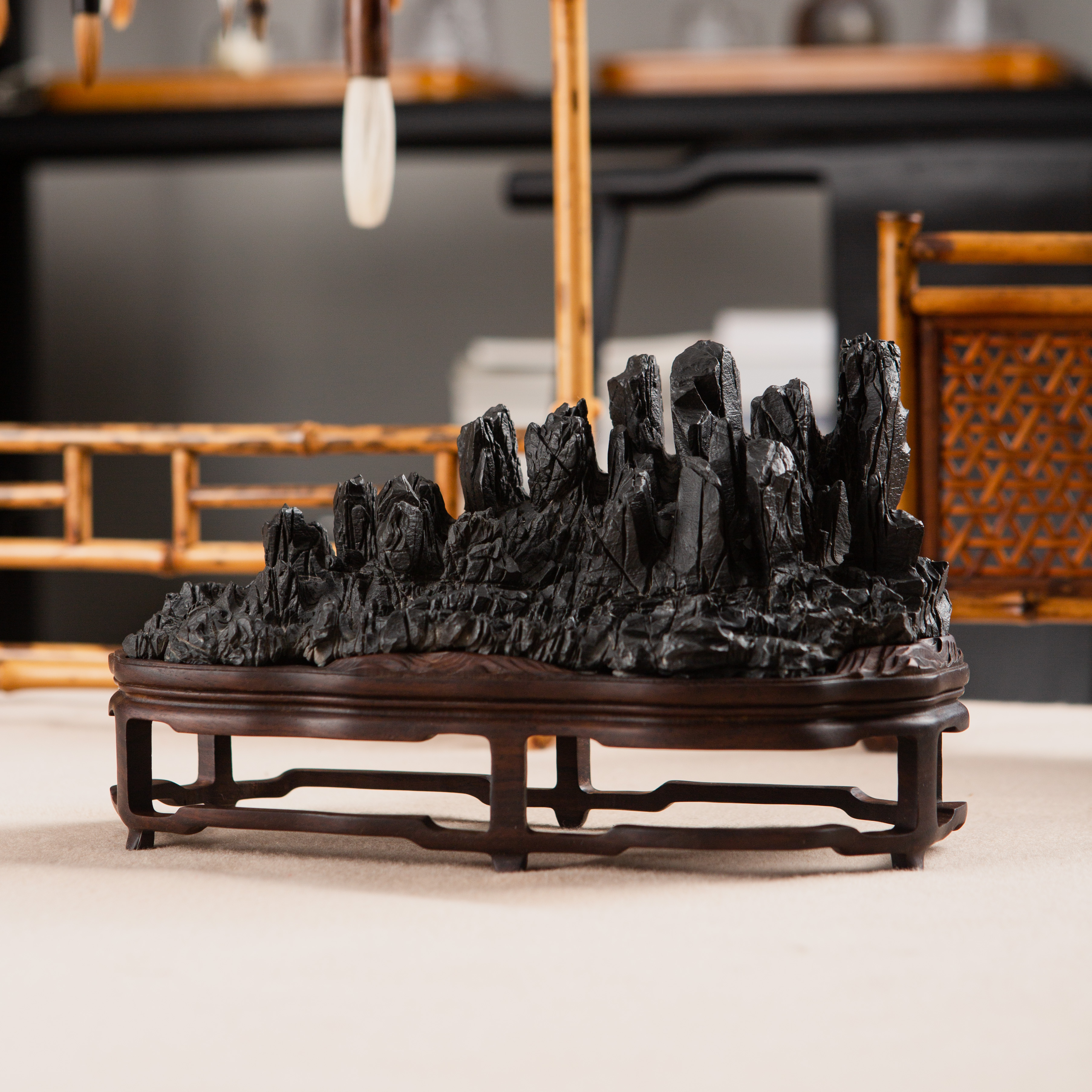此方灵璧石林楼兰案头山子,原石原底,未经人工修饰,配苏工红木底座。其山峰错落有致,层次分明,峰回路转,有远山呼唤之感,美景汇于一石,山水汇聚,沟壑溪流一应俱全,属于移步换景的奇石景色,俨然一副意境山水,是难得一见的文房雅石,可遇而不可求。