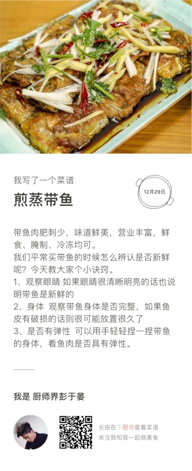农场厨师@小严做的一道煎蒸带鱼菜谱,发布在了下厨房,想学做的,可长按识别二维码去看看。