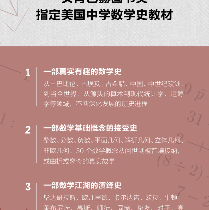 3. 从问世到被广泛接纳,30个独立的数学概念发展史,精彩地介绍中间或曲折或离奇的传奇故事。