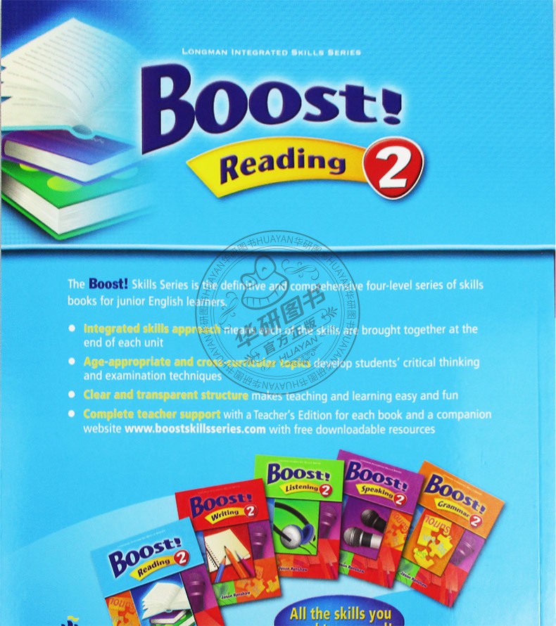 Boost!系列是培生集团朗文公司出版,专门为非英语国家10-15岁青少年英语学习所编写的系列教材。教材提供听、说、读、写、语法综合全面的知识技能训练,致力于发展青少年听、说、读、写基本技能,有效提高应试能力,全面培养英语综合运用能力。在提升青少年语言智能,开发和培养学生潜能的同时,整体提高青少年人文素养。