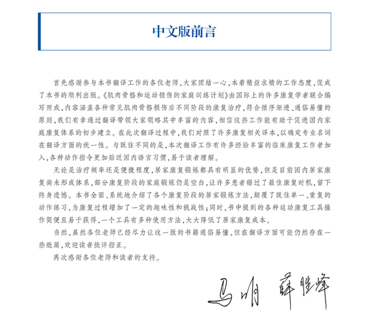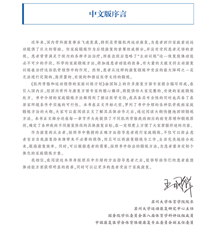 近年来,国内骨科康复事业飞速发展,特别是骨骼肌肉运动康复,为患者回归家庭重返运动提供了巨大的帮助。但家庭锻炼作为后续康复的重要组成部分,并没有受到患者足够的重视。患者常常满足于院内的各种手法治疗,而在出院后忽略了“主动训练”这一恢复肢体功能必不可少的手段。科学的家庭锻炼方法,将加速患者功能的改善,《肌肉骨骼和运动损伤的家庭训练计划:从业者循证指南》一书将为大家提供完整的、有效的家庭锻炼处方。